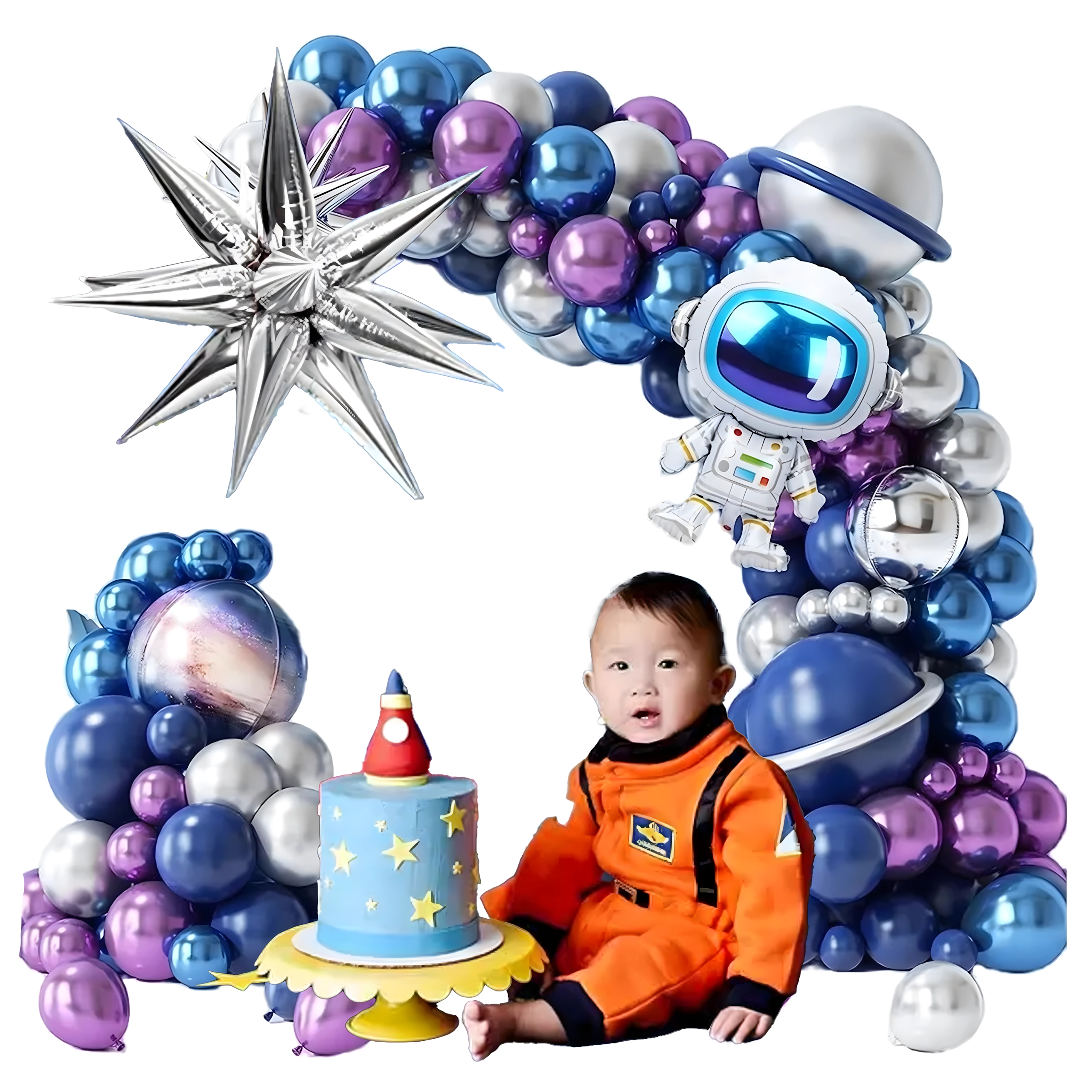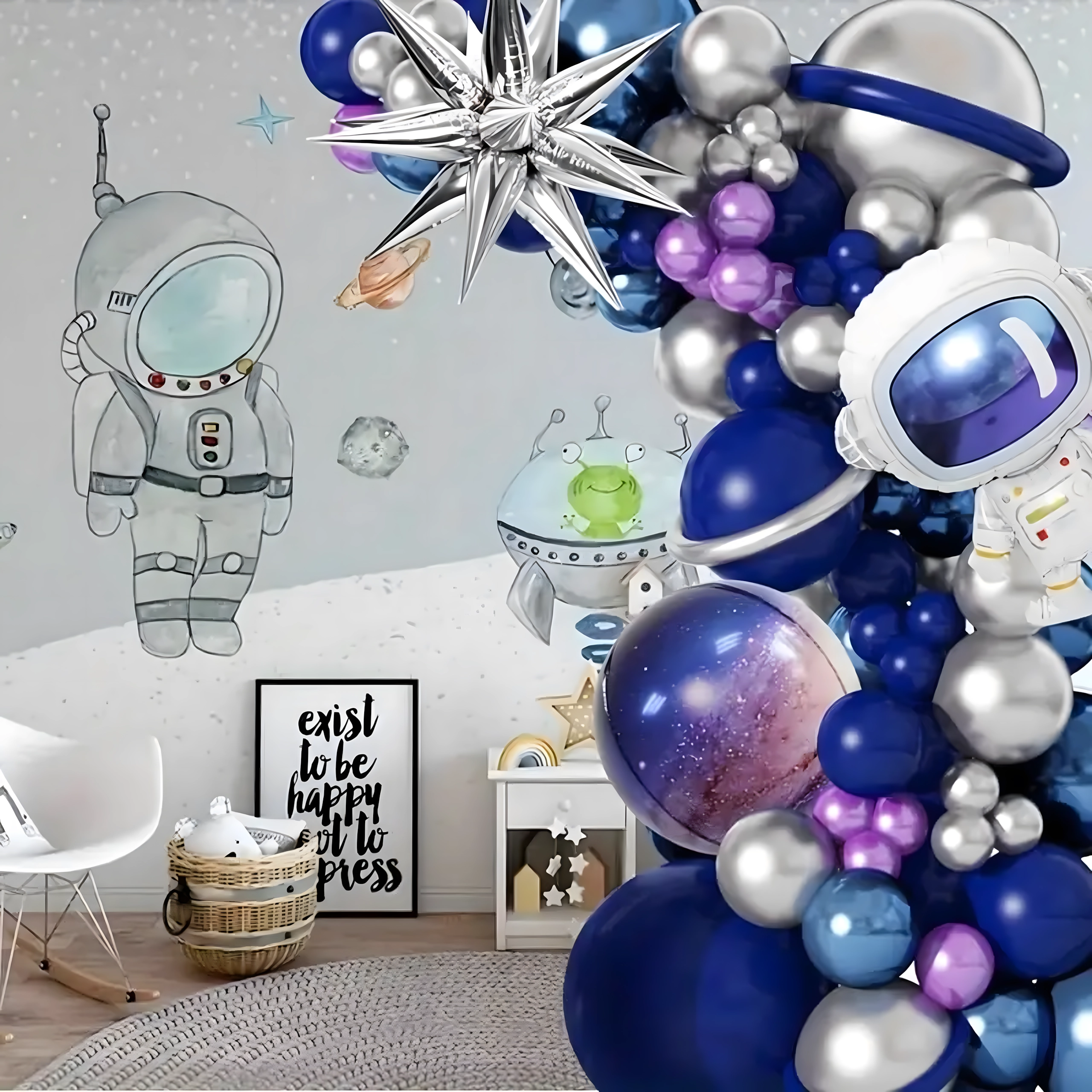 Idealno za ljubitelje vesolja in raket. Komplet lahko kombinirate z drugimi dekoracijami in ga preprosto prilagodite velikosti prostora. Zaradi vsestranske uporabe in številnih elementov boste lahko okrasili vhod, fotokotiček in sladki kotiček.