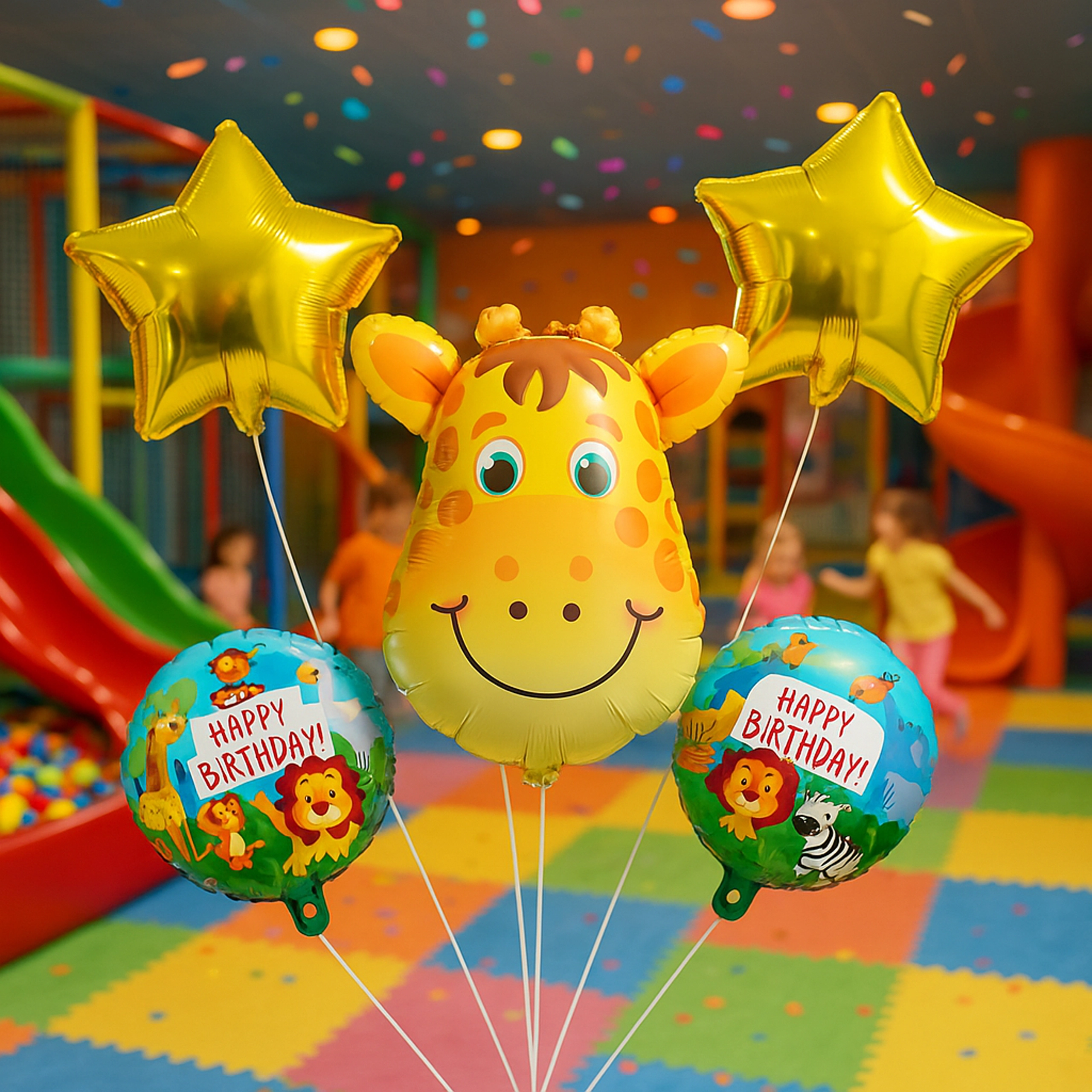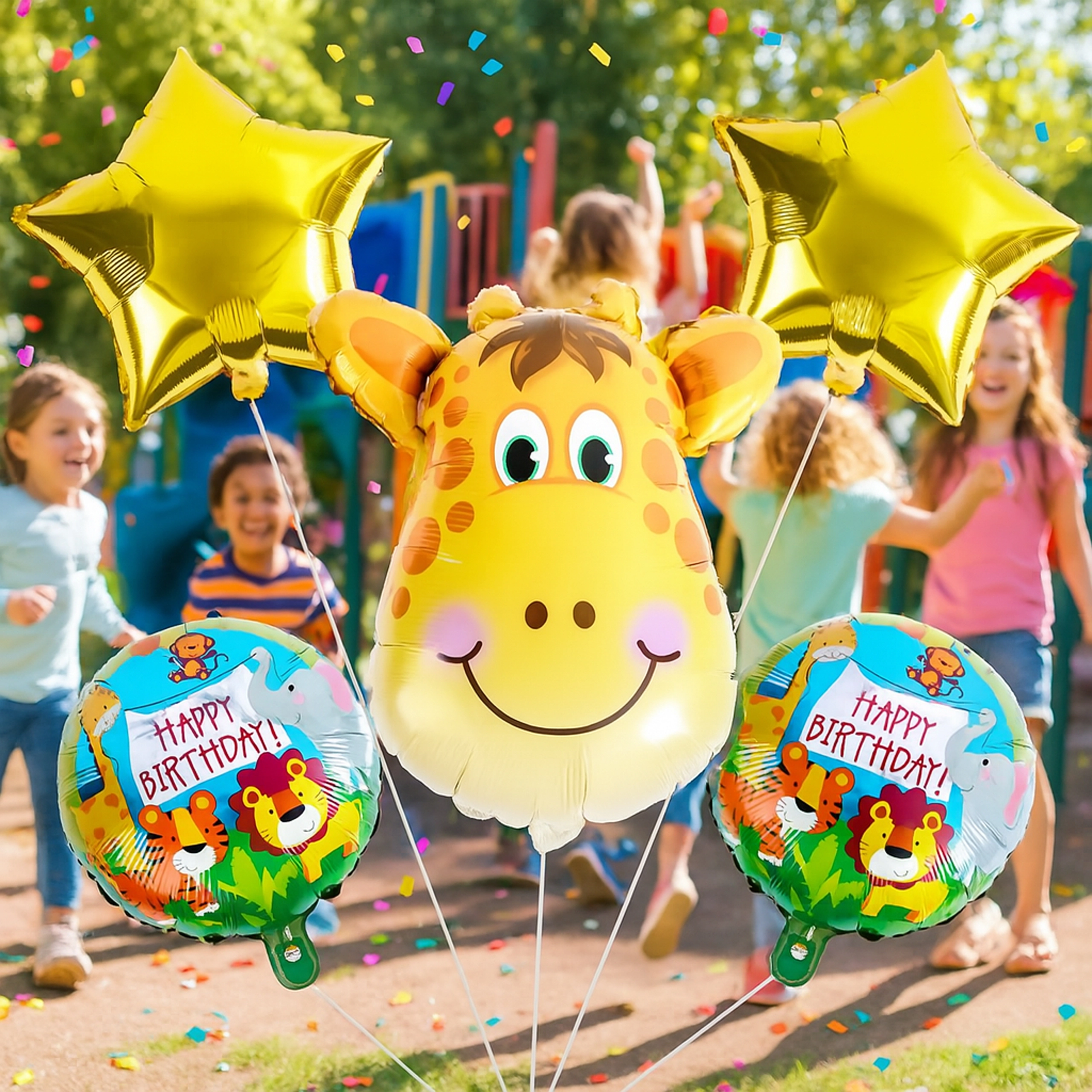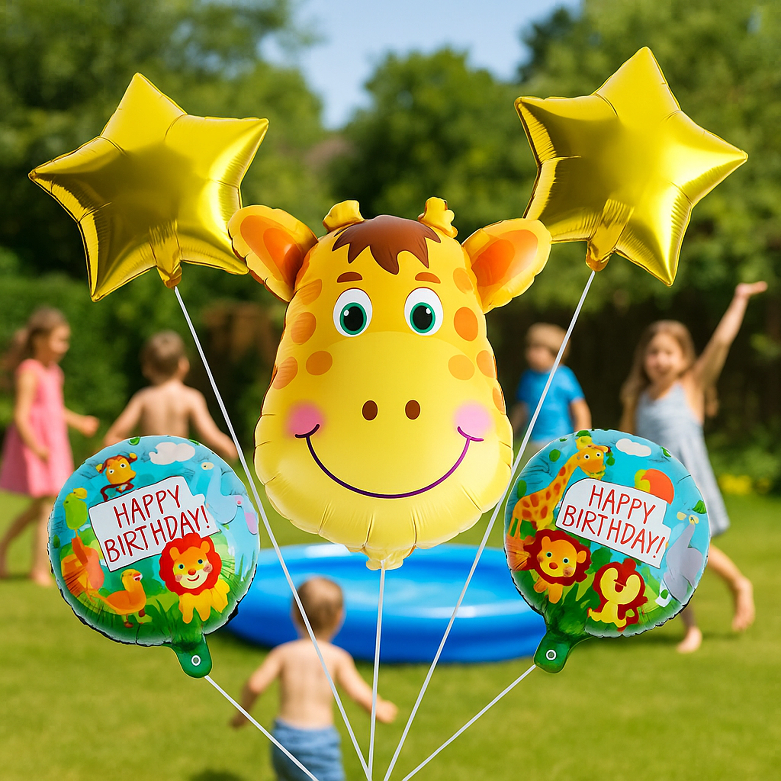 - 5 kos (1× balon žirafa, 2× balon z napisom HAPPY BIRTHDAY, 2× zlata zvezda)