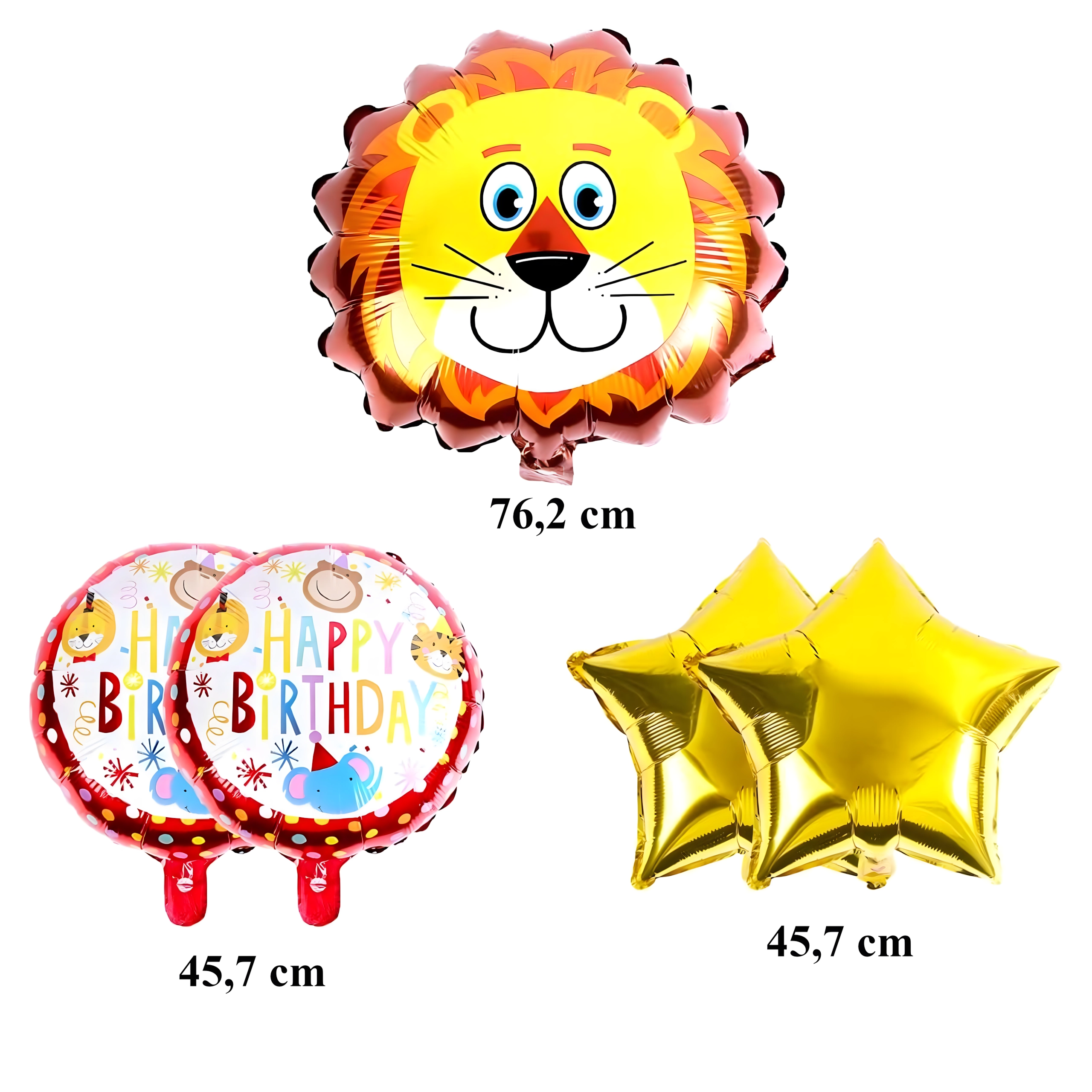 - 1× balon lev, 2× balon z napisom HAPPY BIRTHDAY, 2× zlata zvezda