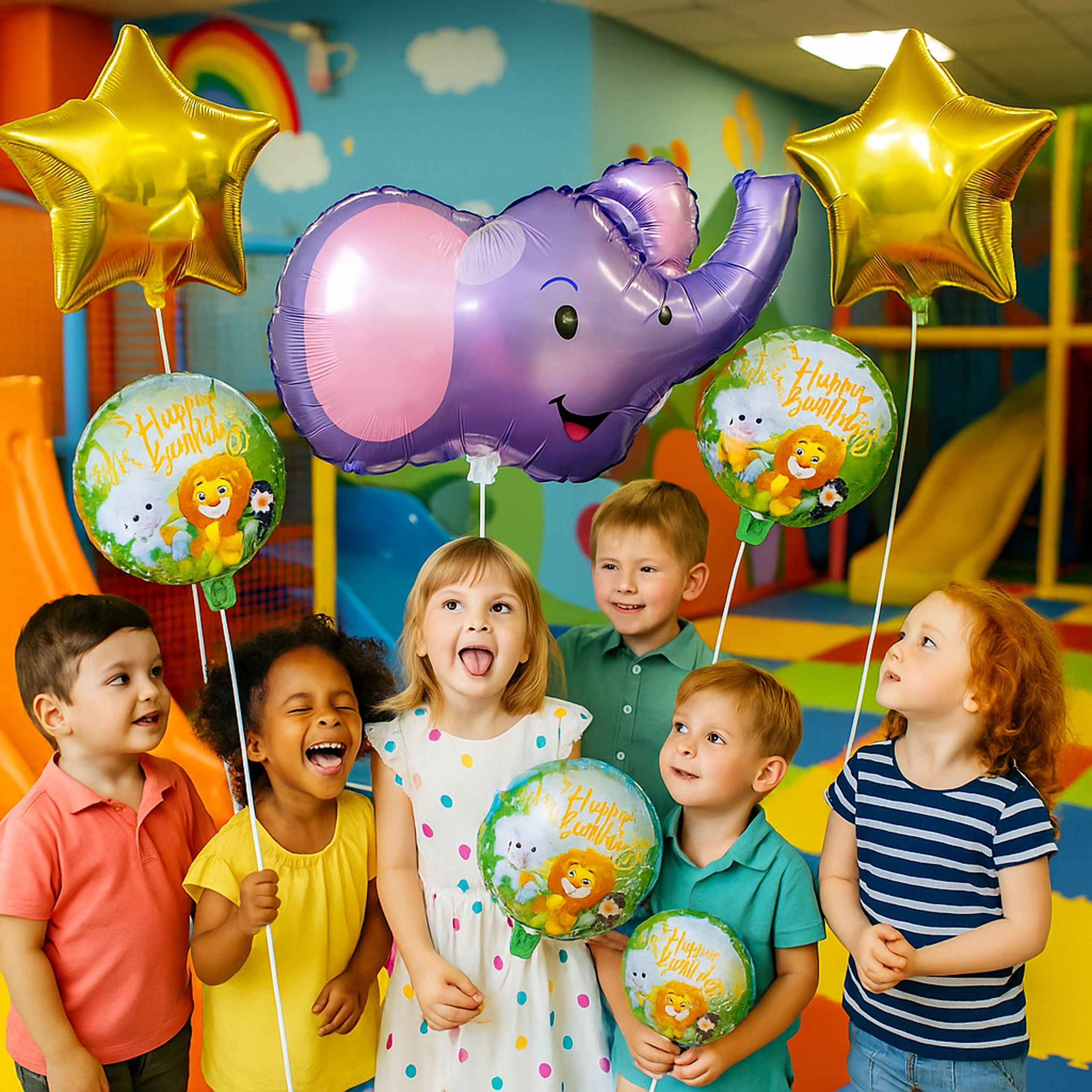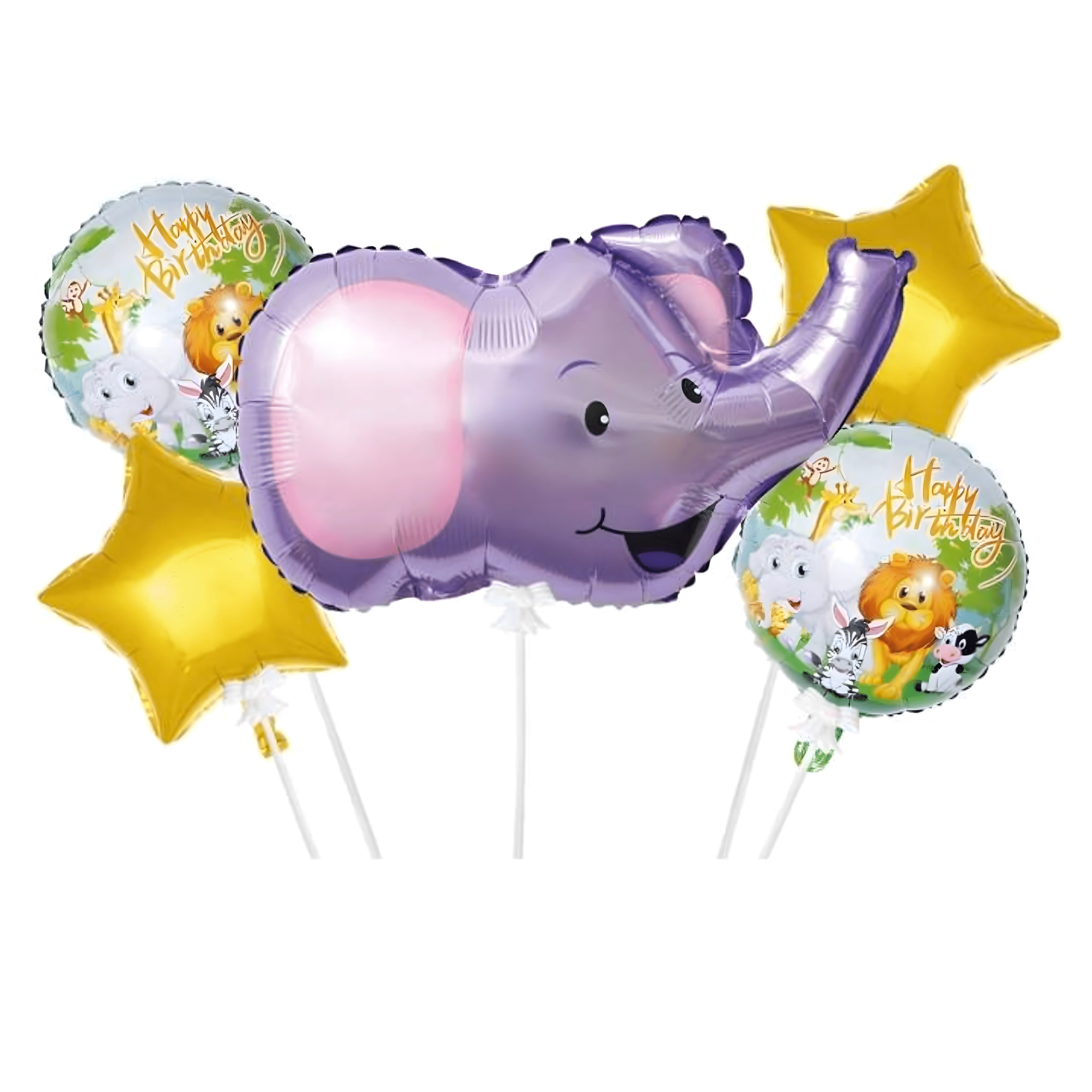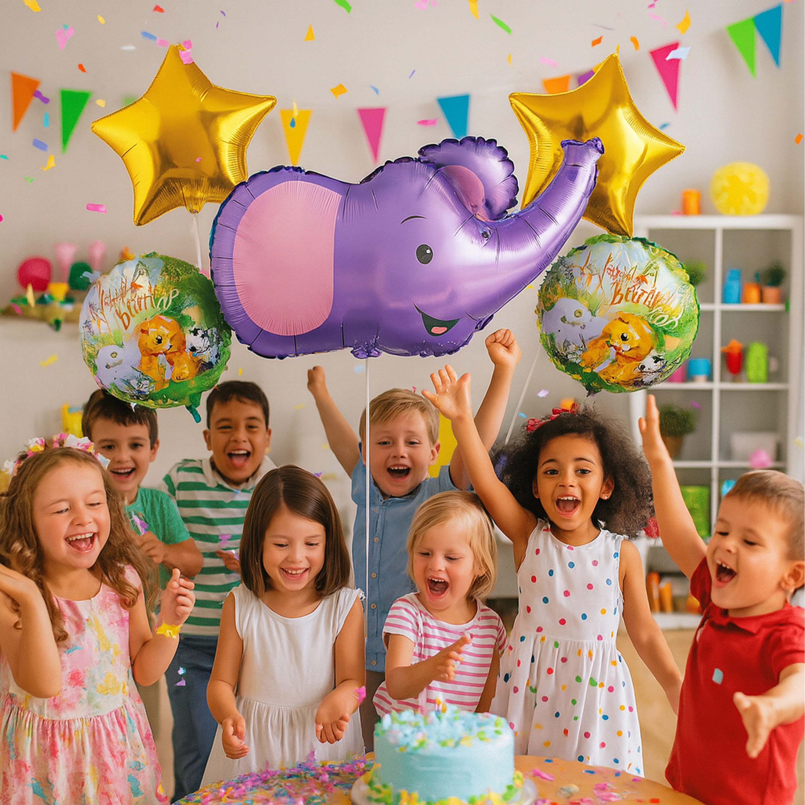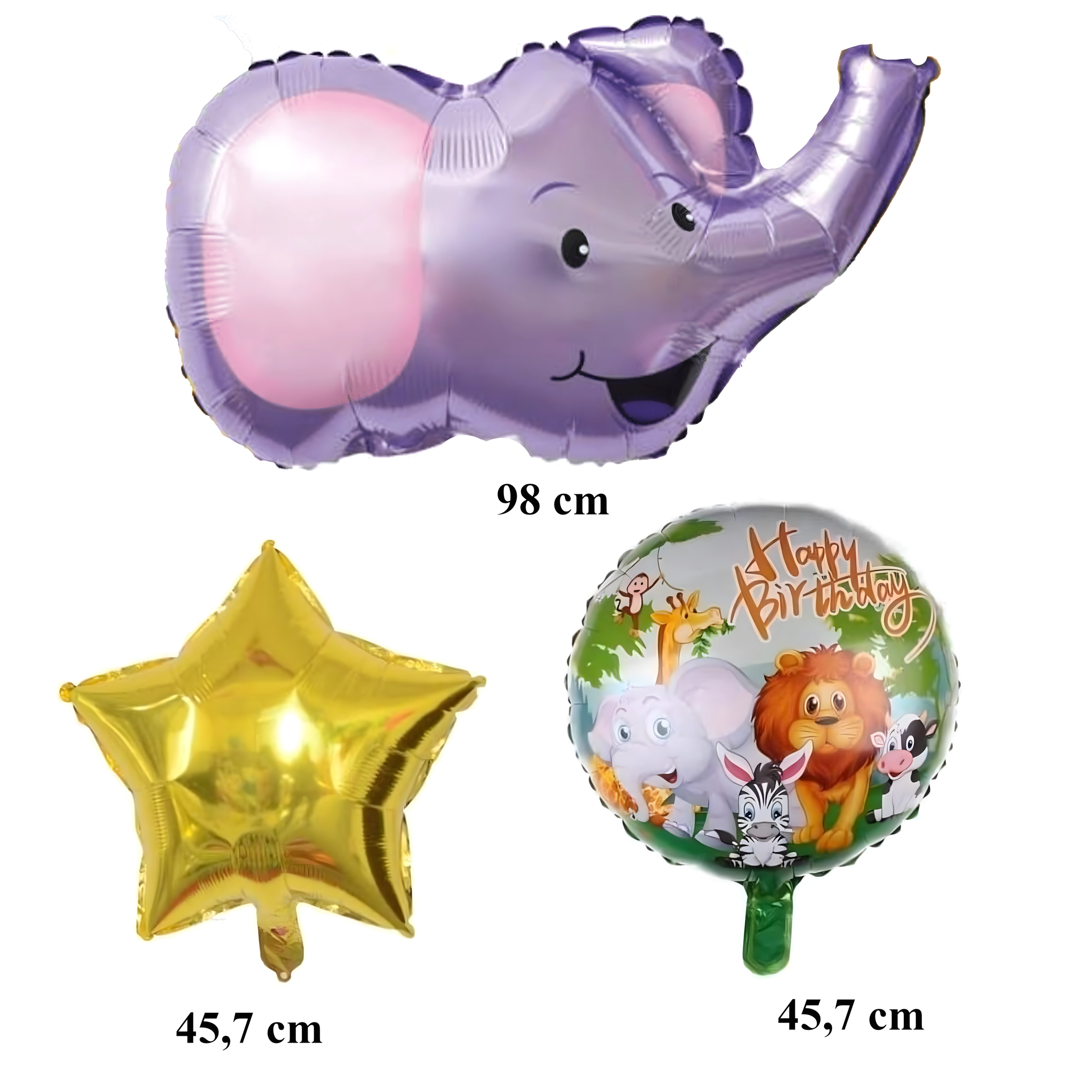 Ta barvit komplet balonov vsaki zabavi doda nepozabno vzdušje. Kombinacija veselega slona, elegantnih zlatih zvezdic in rojstnodnevnih napisov ustvari trenutno dekoracijo za zabavo brez dolgotrajnih priprav.