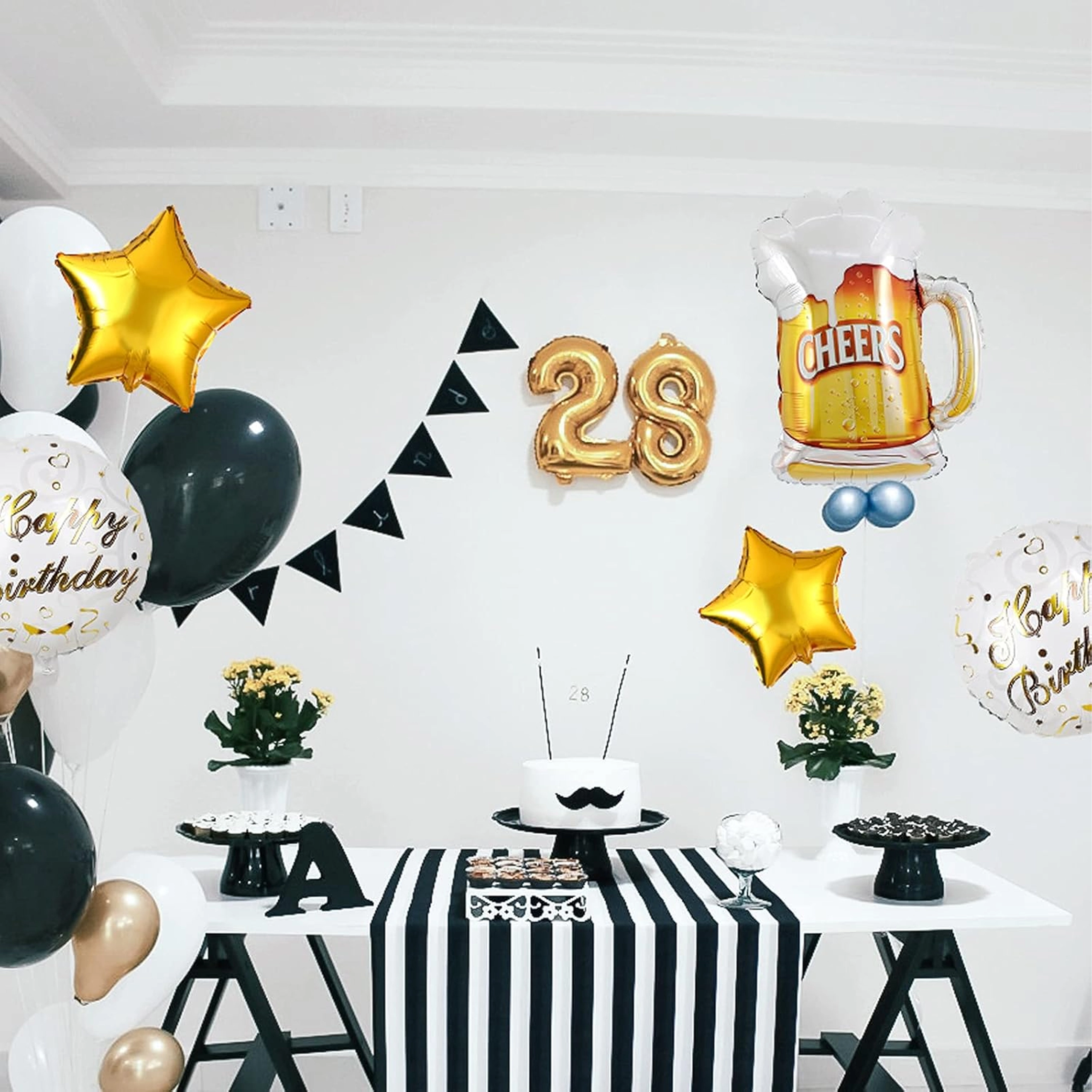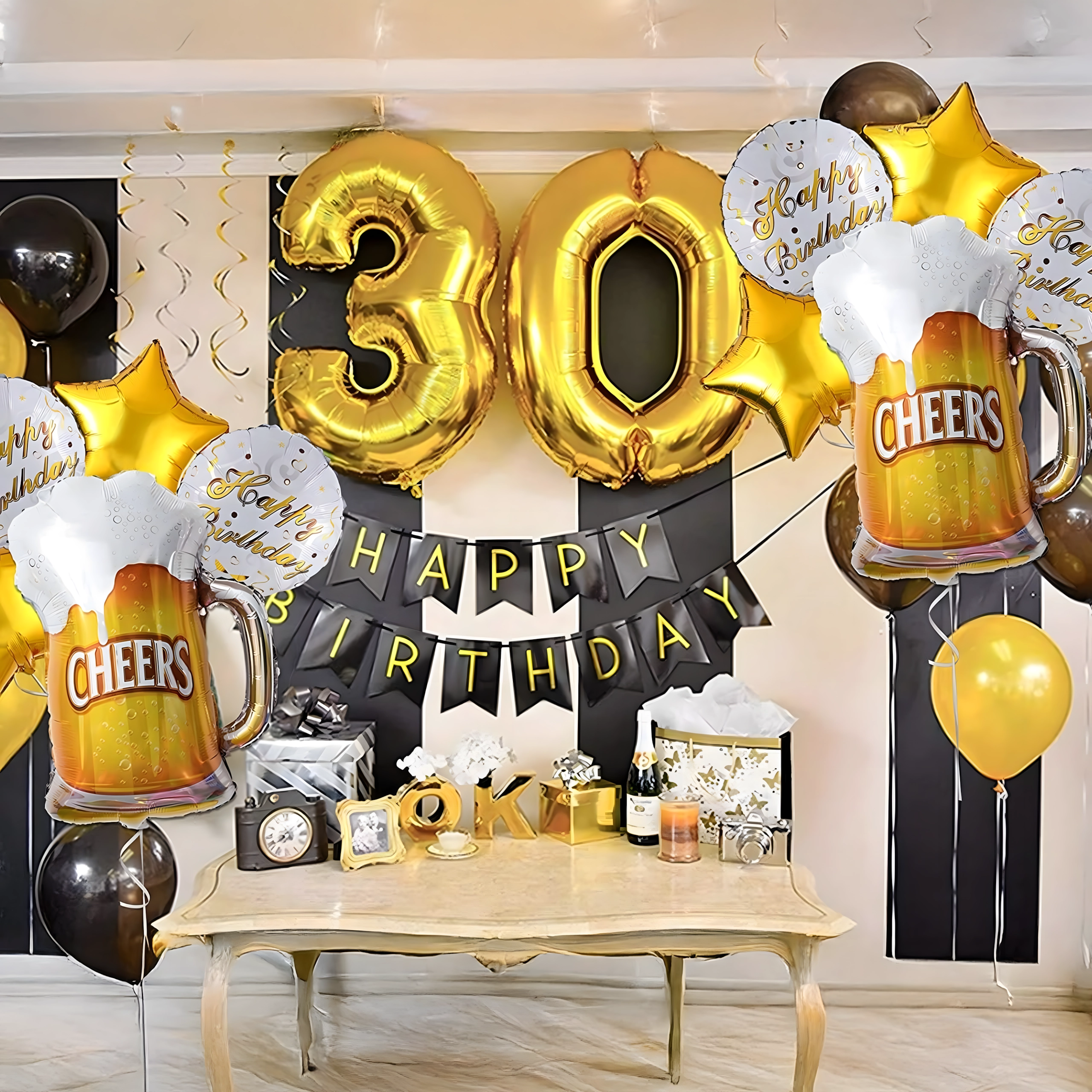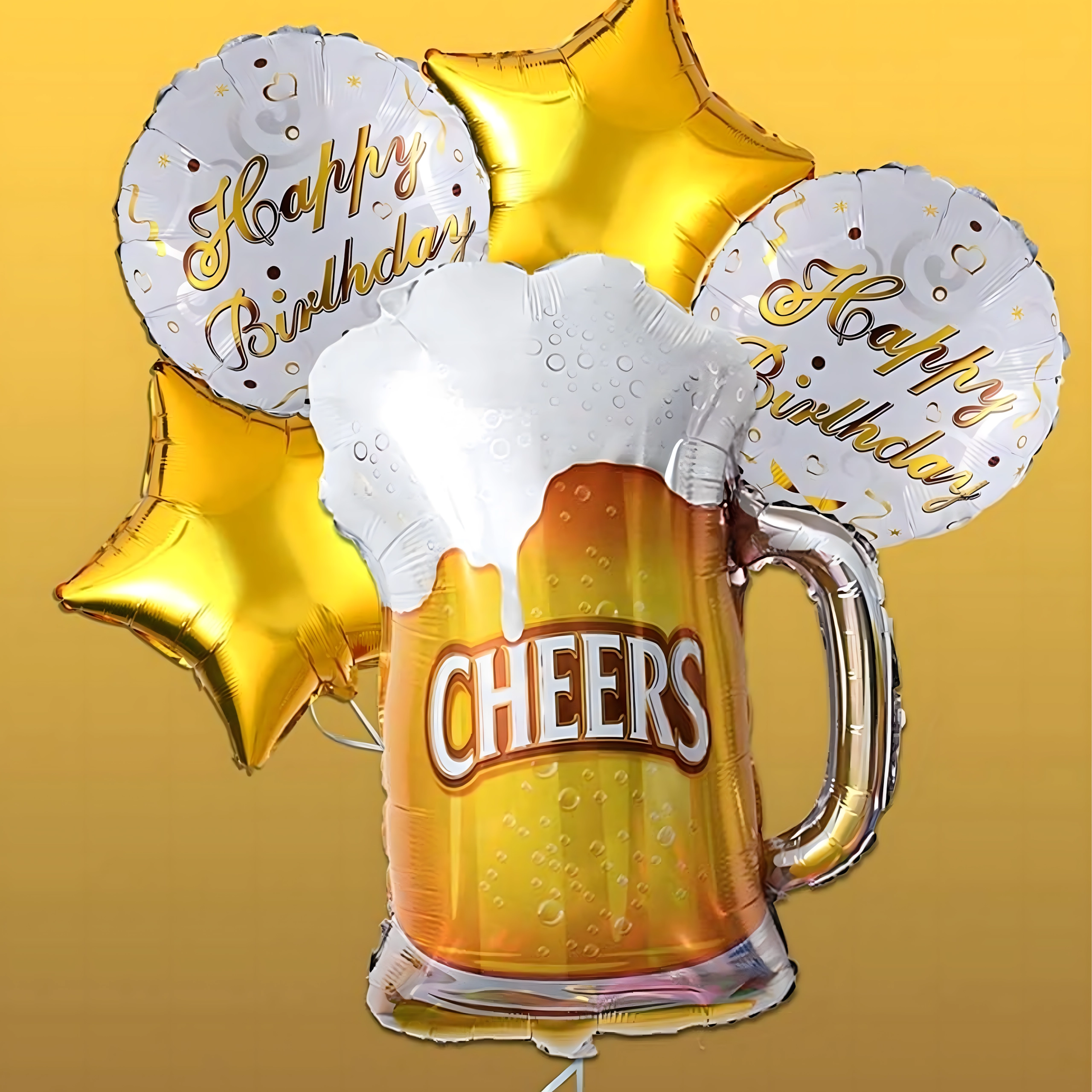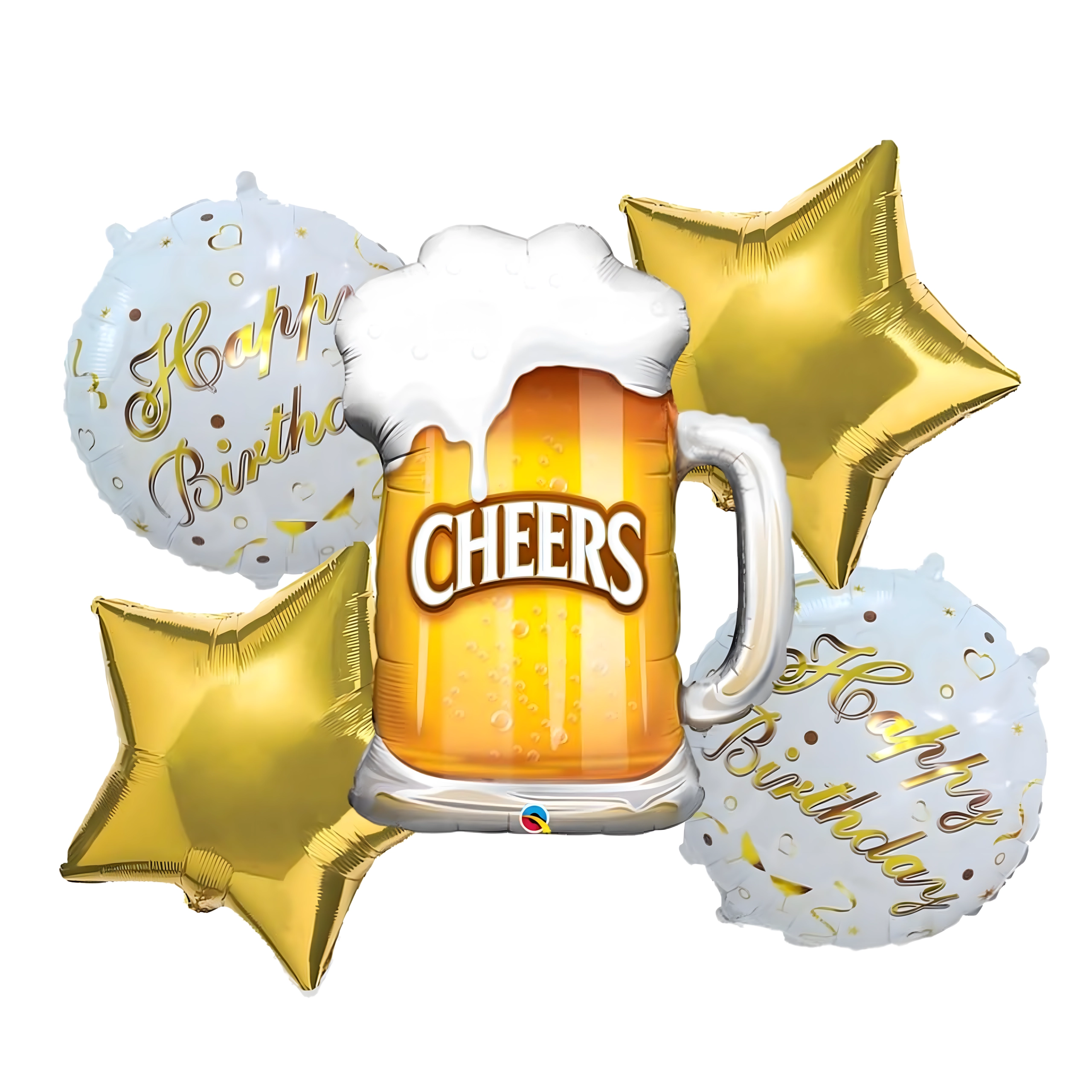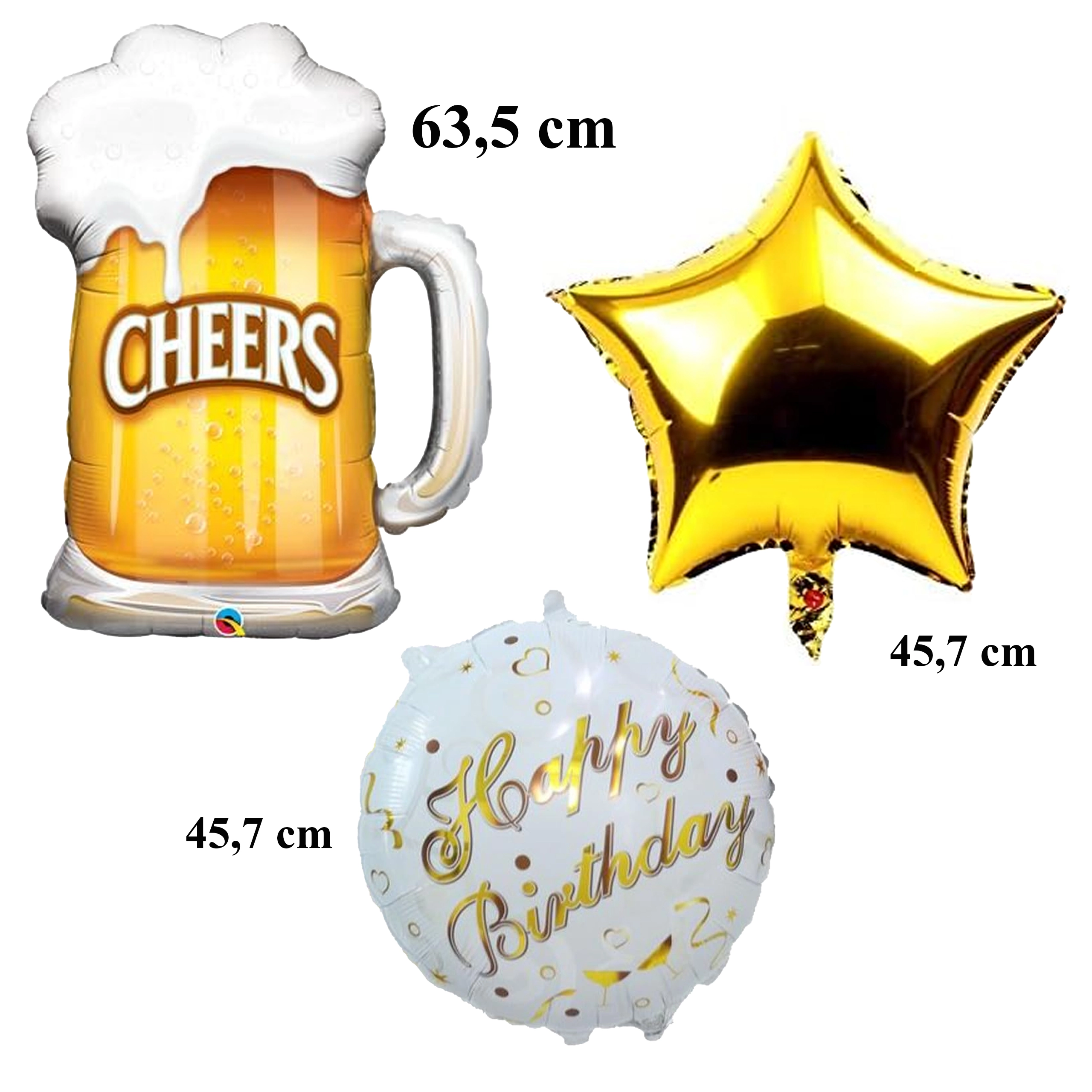 Ta dizajnerski komplet balonov »CHEERS« bo vaši zabavi dodal edinstveno vzdušje. Dominanta je folijski balon v obliki vrčka piva, ki ga dopolnjujeta dva balona z napisom Happy Birthday ter dve zlati zvezdi. Kombinacija motivov je idealna za praznovanja odraslih.