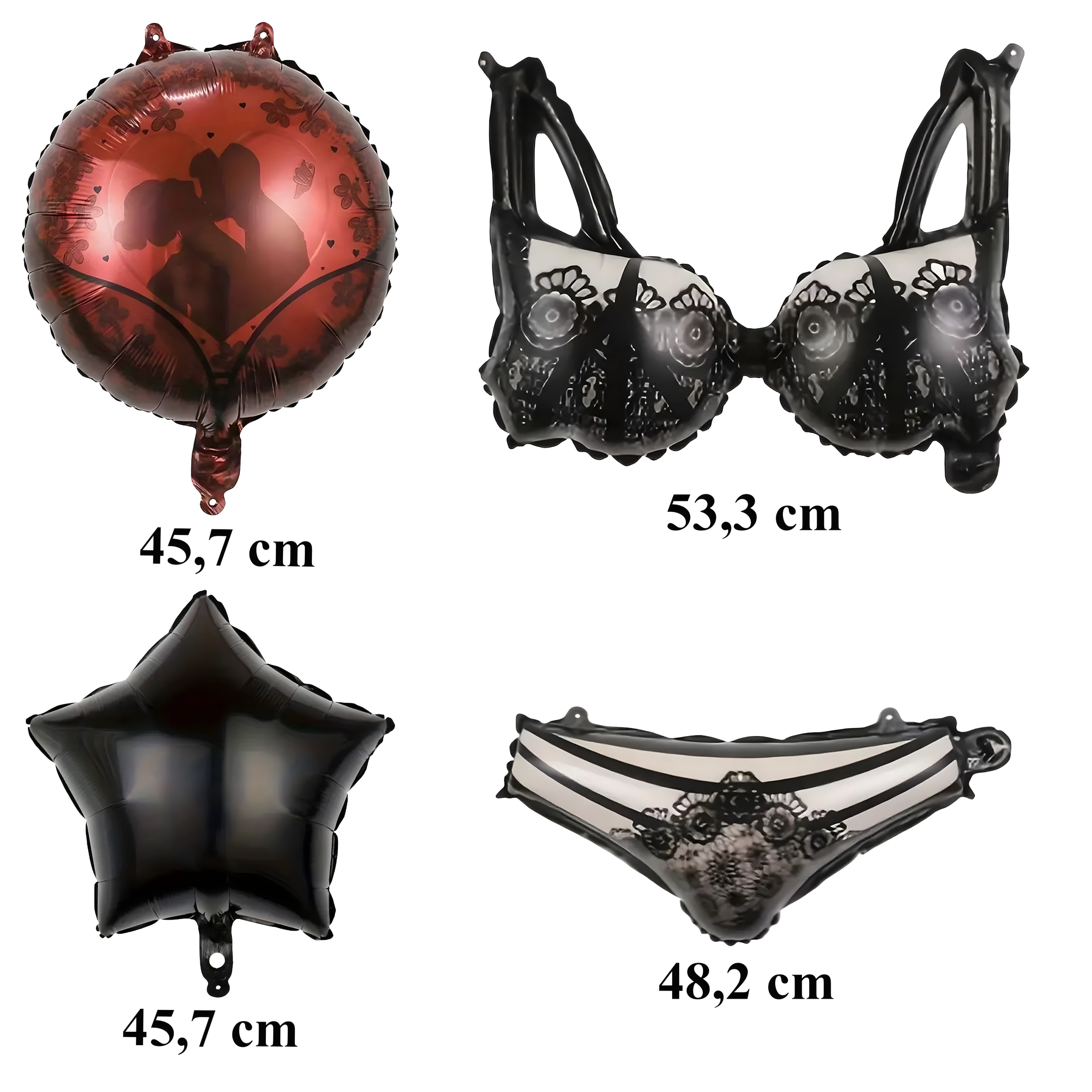 Vesel komplet balonov za fantovščino z motivom ženskega perila bo poživili vsako zabavo. Vsebuje balon v obliki modrčka (53,3 cm), balon v obliki hlačk (48,2 cm), 2 okrogla balona in 2 balona s potiskom. Idealno kot dekoracija za fotokotiček in za zabavo Bride‑to‑Be.