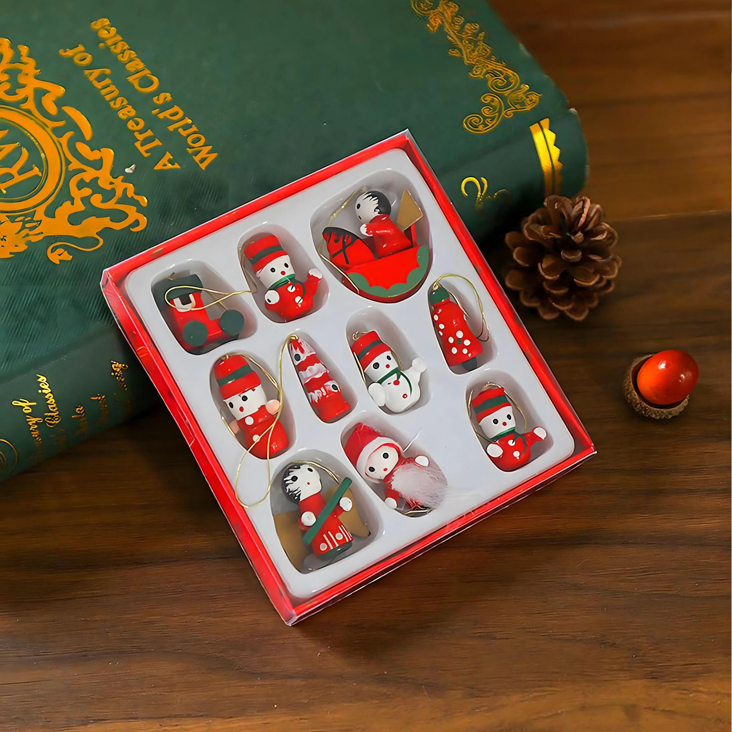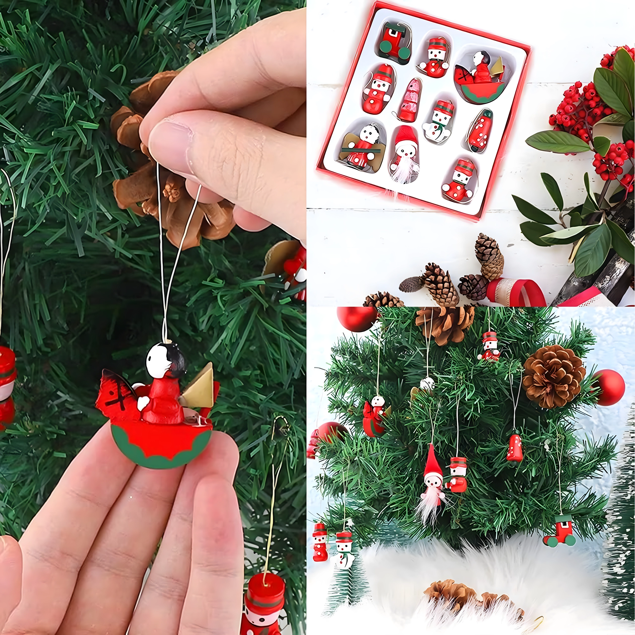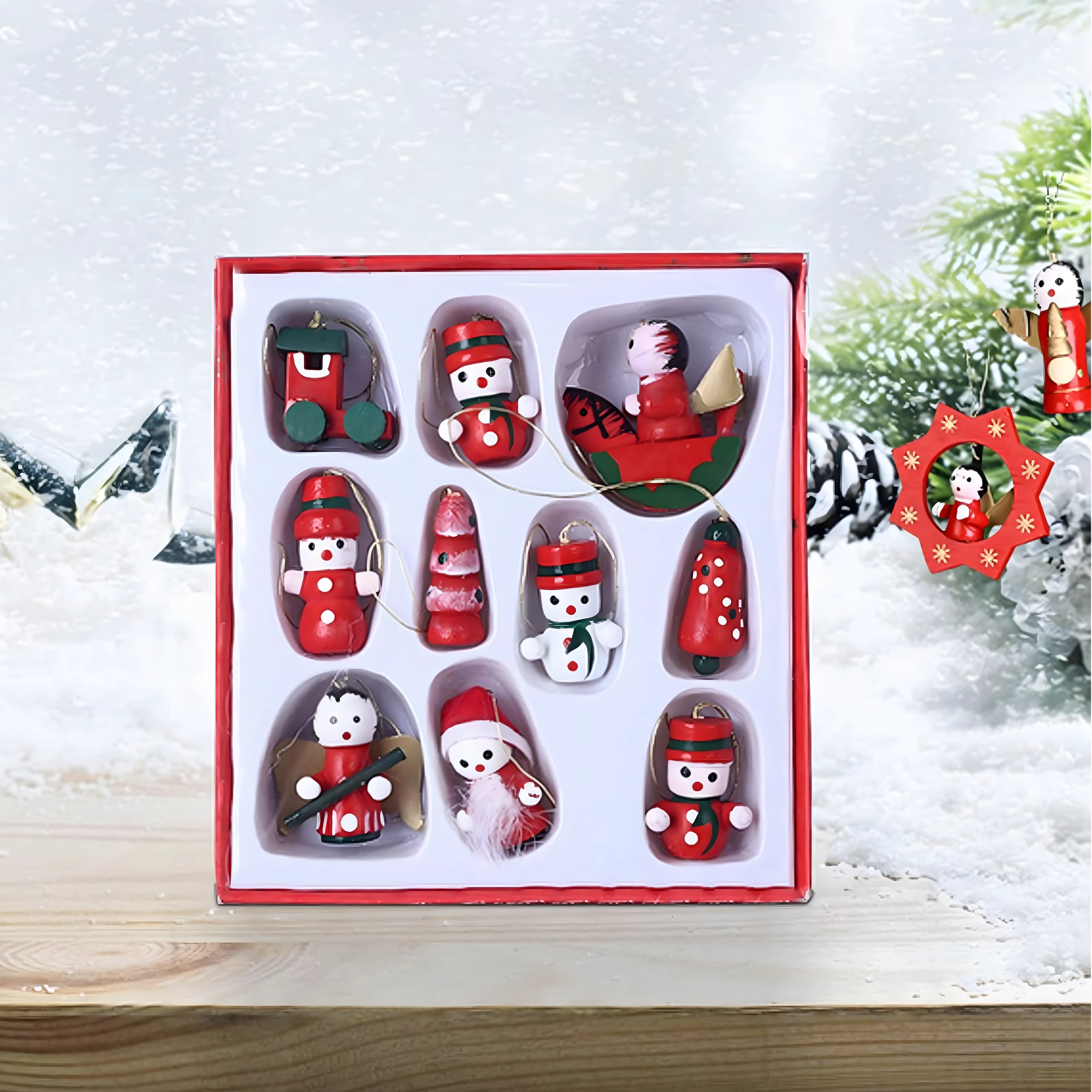 Oživite svojo božično dekoracijo s stilskim kompletom lesenih visečih okraskov. Naravni videz in natančna izdelava se podata tako tradicionalnim kot modernim aranžmajem, zaradi nizke teže pa jih zlahka obesite na katerokoli vejo.