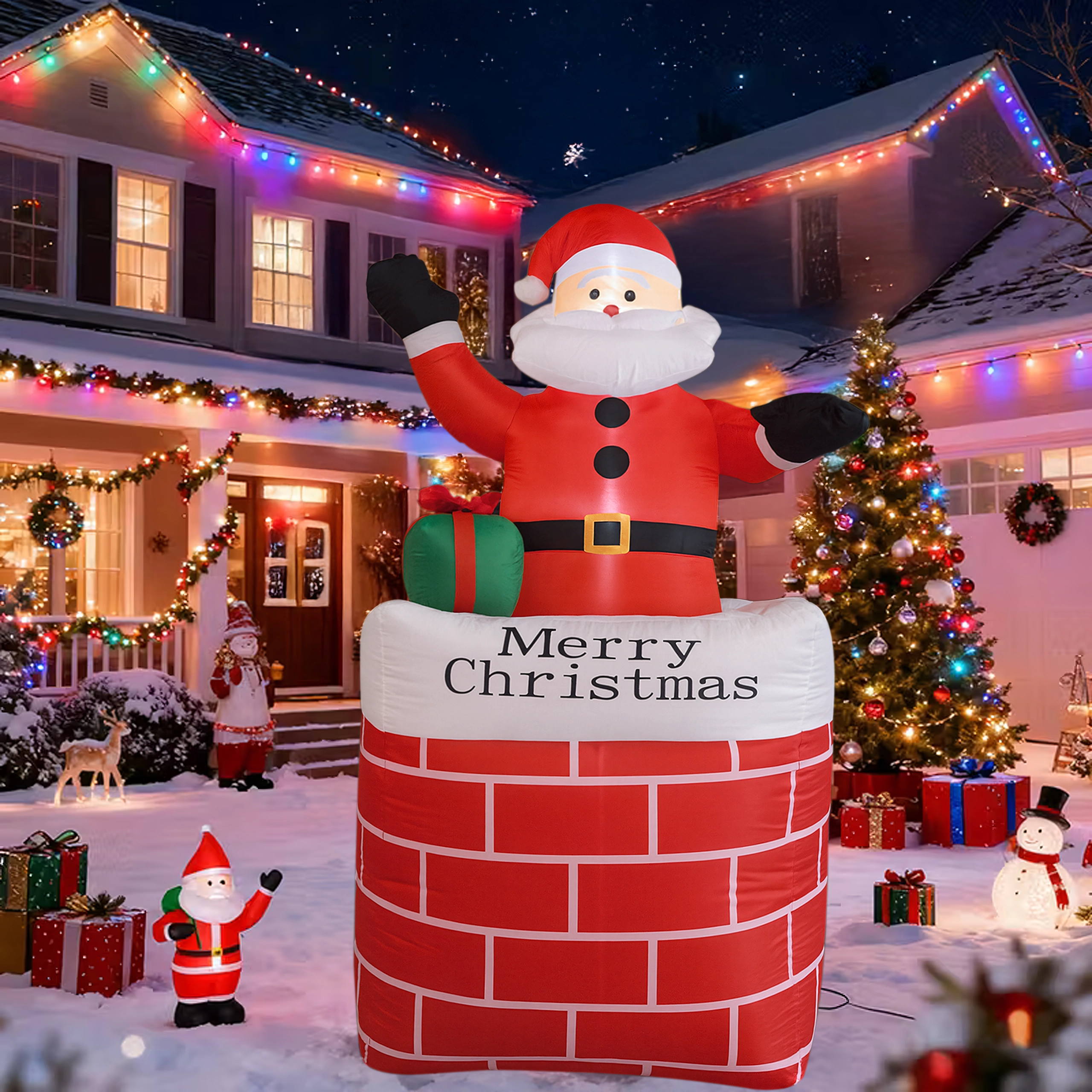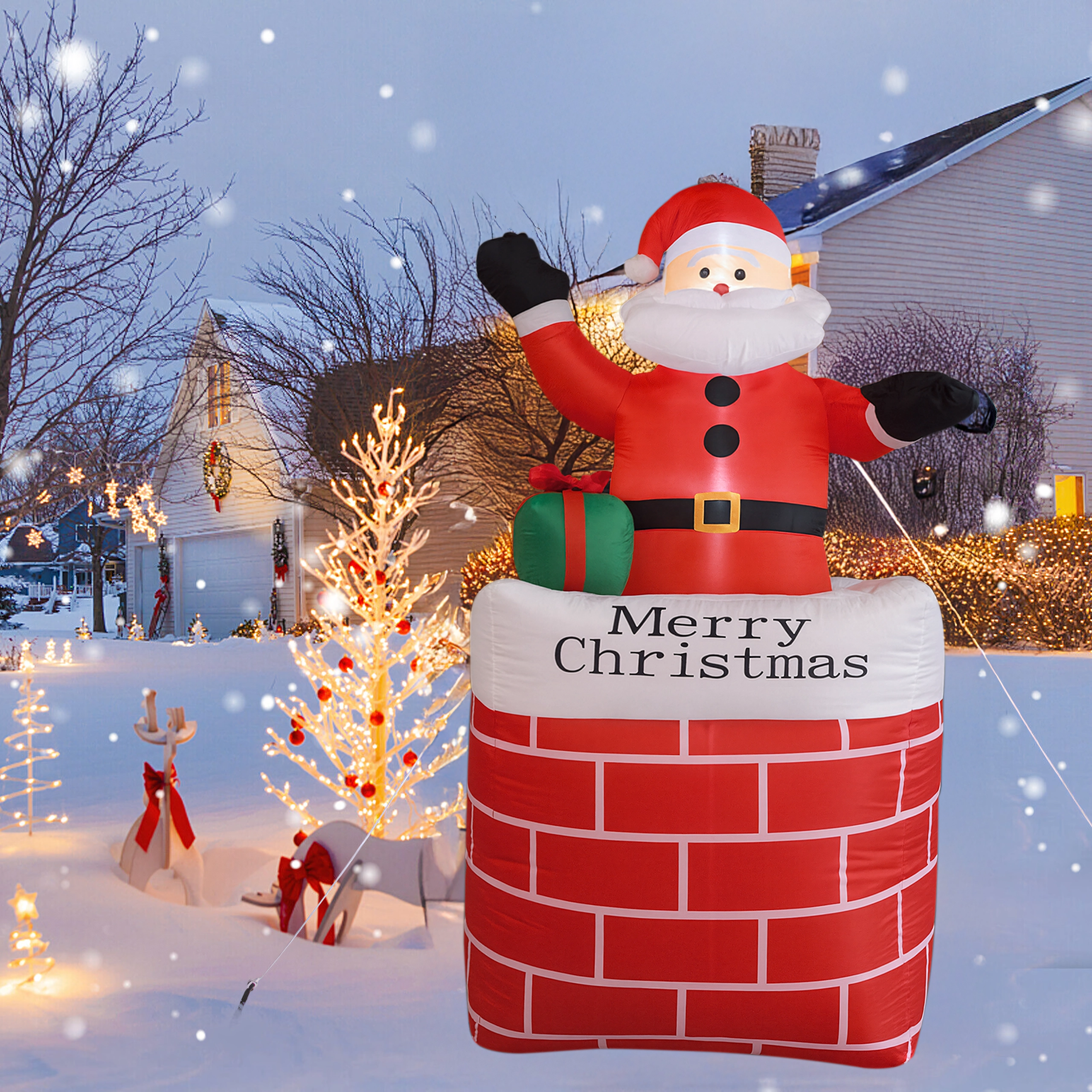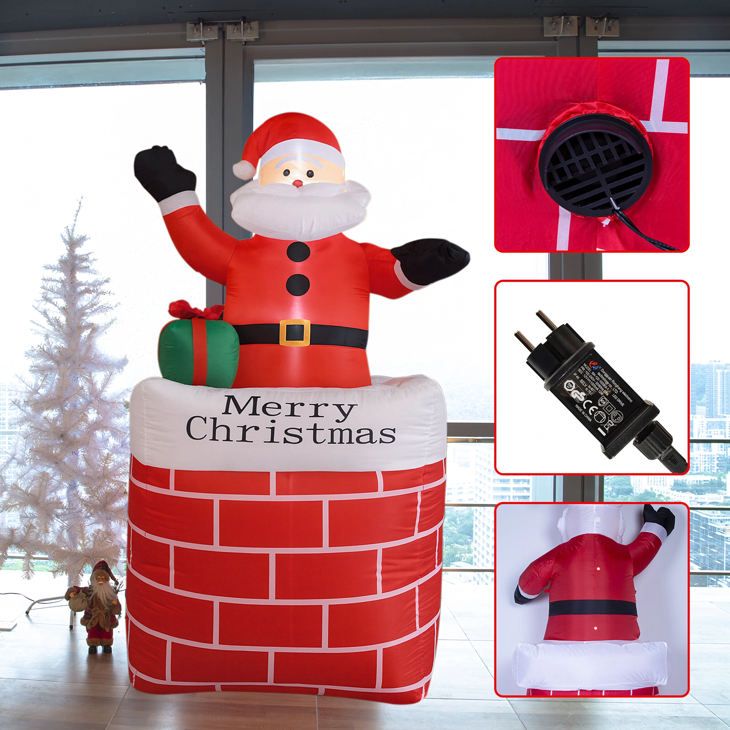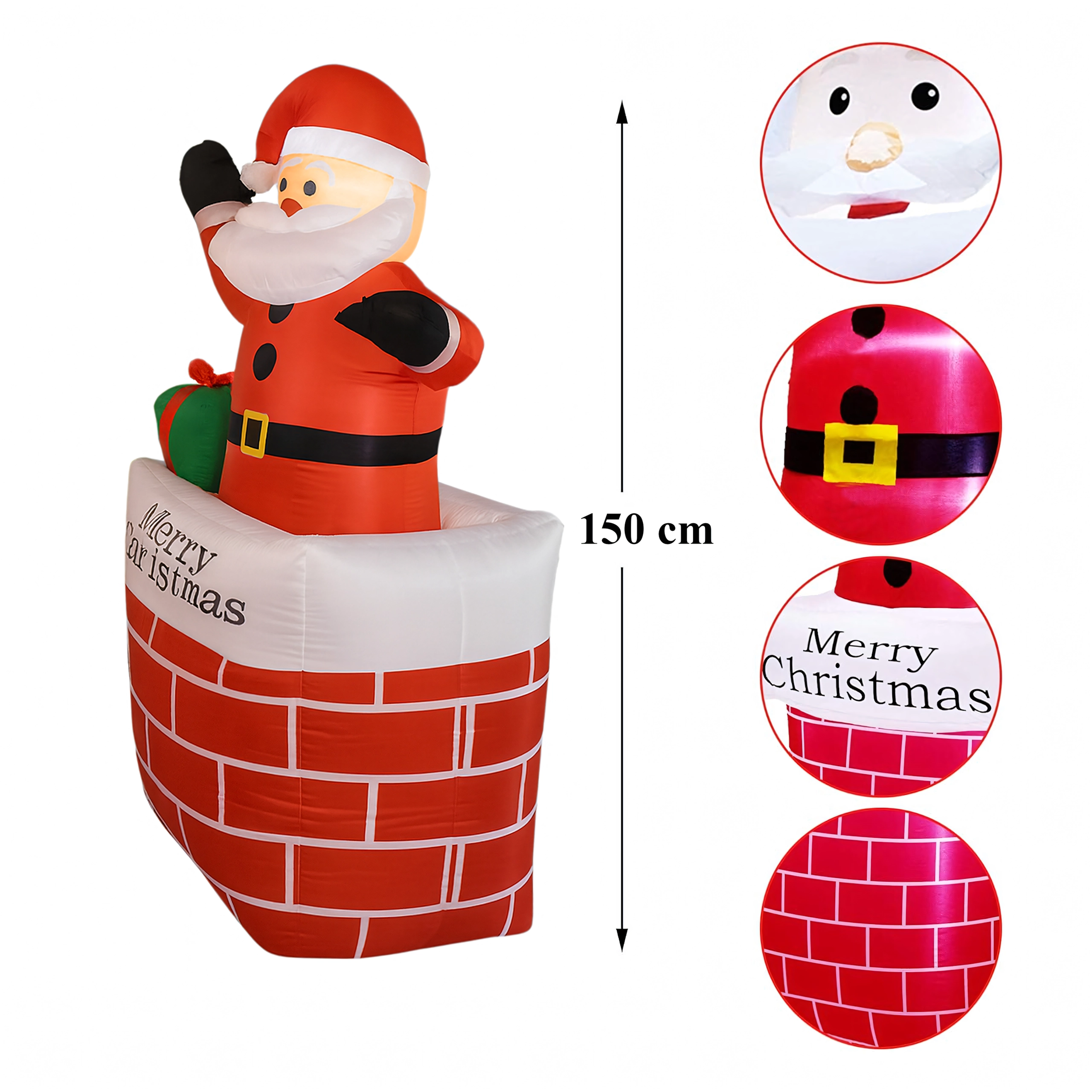 Ustvarite čarobno praznično vzdušje z dekoracijo napihljivi Božiček v dimniku v višini 150 cm. Zahvaljujoč vgrajeni LED osvetlitvi in samodejnemu napihovanju je ta okras učinkovit, varen in preprost za uporabo. Odlično se poda v dom, na vrt, v trgovino in na božične dogodke ter razveseli tako otroke kot odrasle.