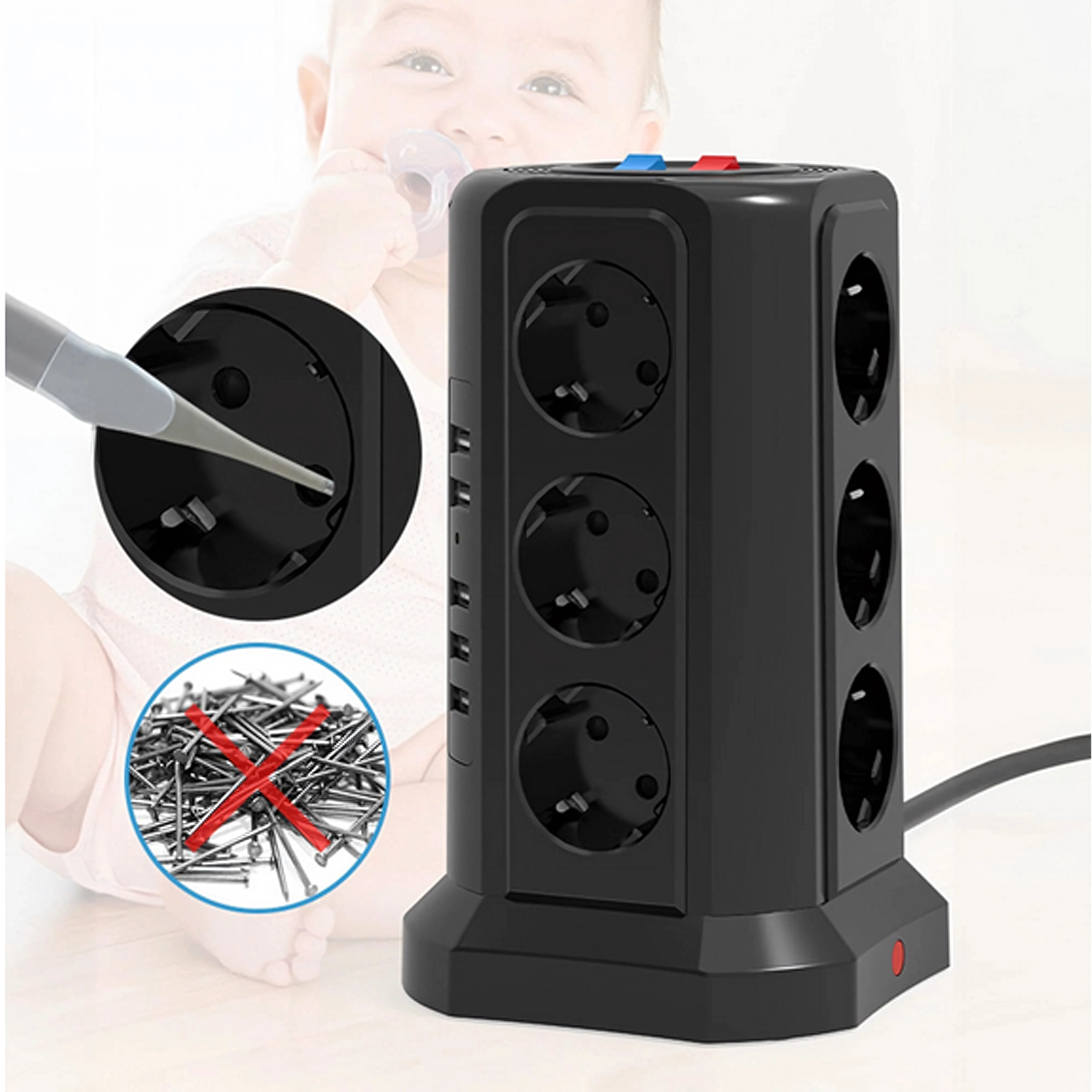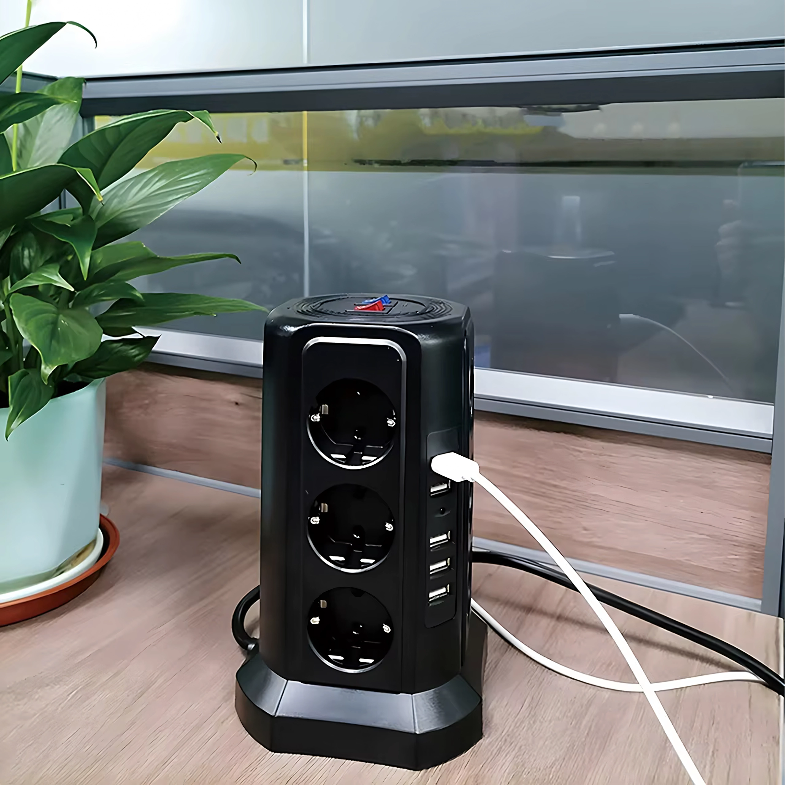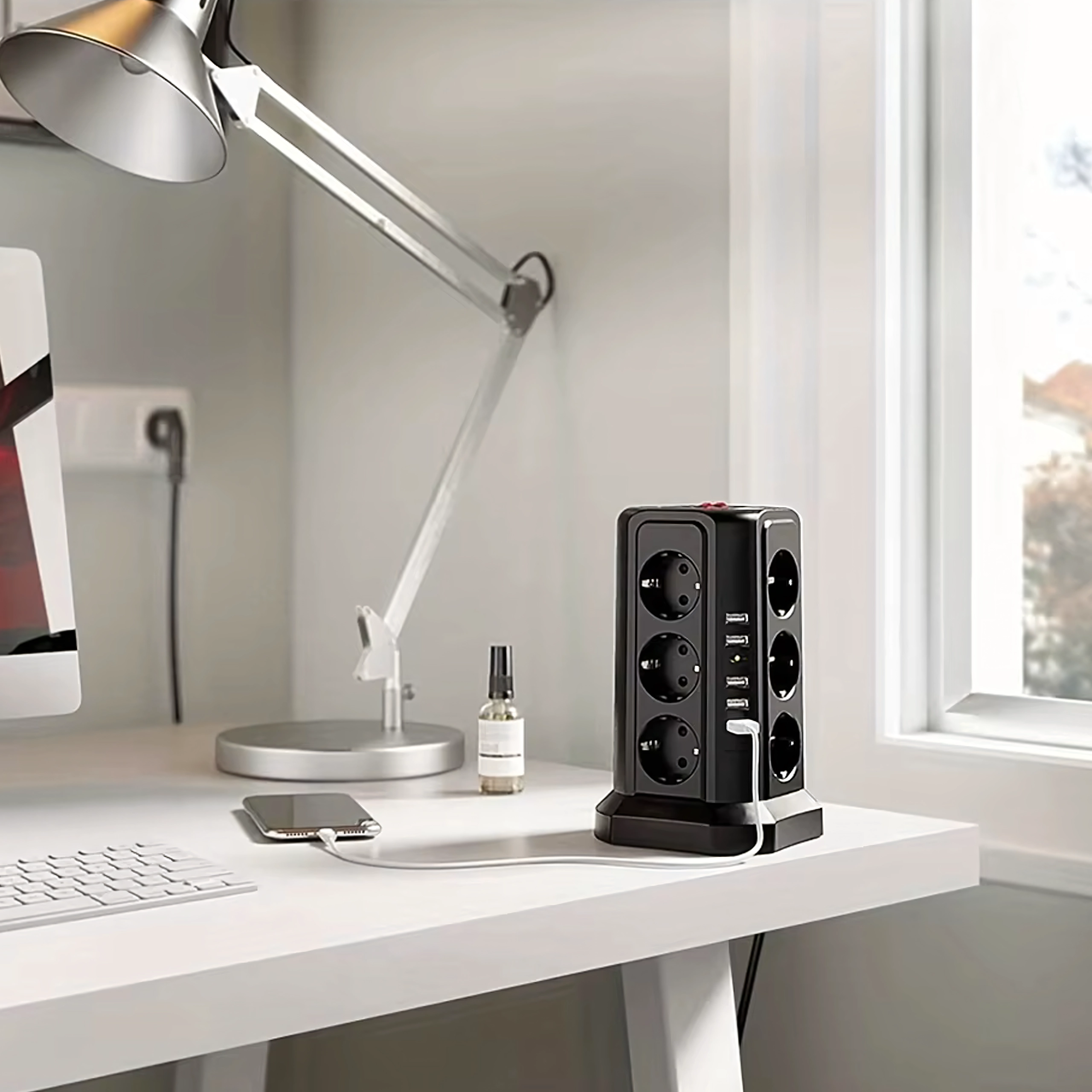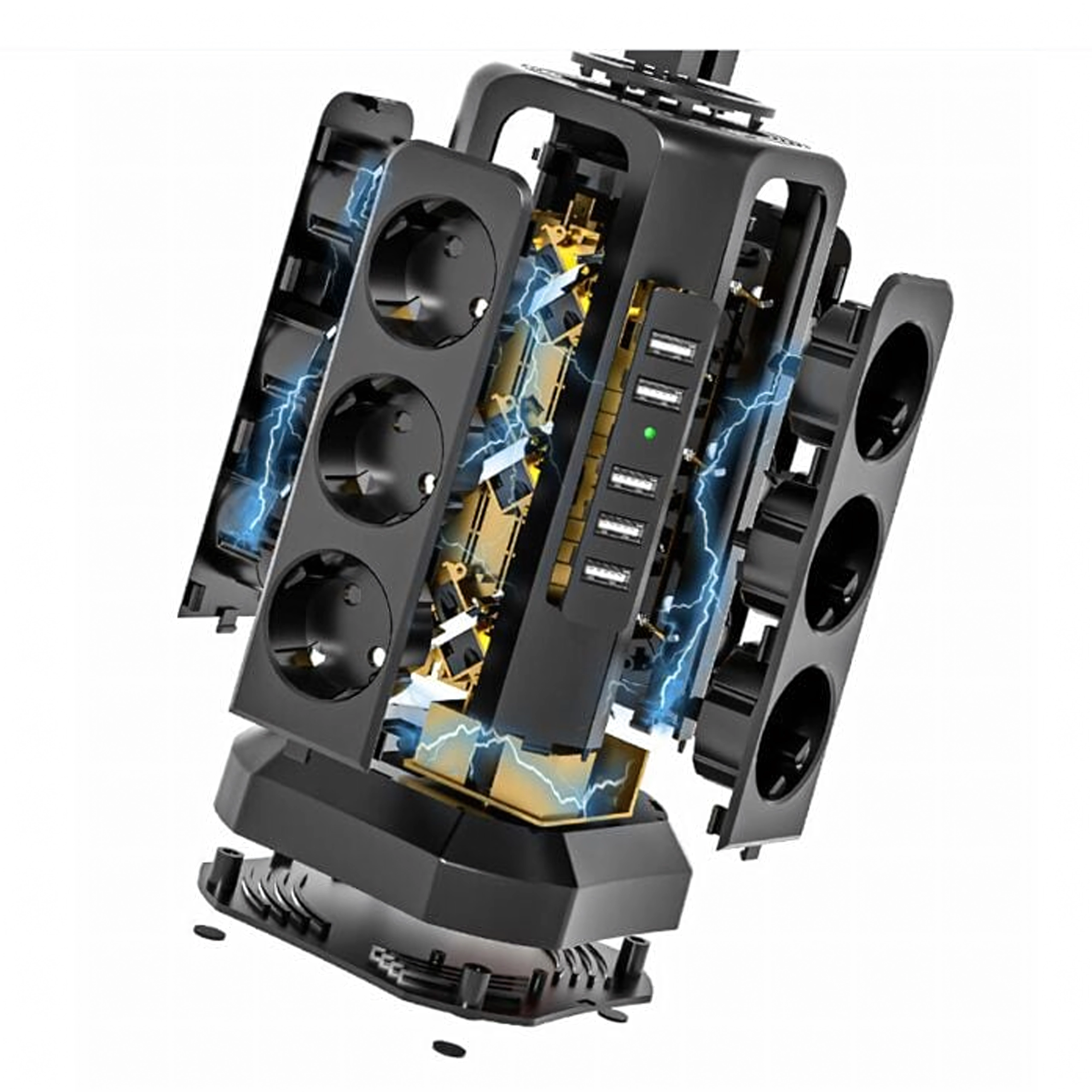 Ta stoječi stolp združuje visoko priklopno kapaciteto in varnost. Vertikalna zasnova prihrani prostor na mizi in tleh ter omogoča enostaven dostop do vseh vtičnic in USB vrat. Prenapetostna (zaščitna) zaščita ščiti občutljivo elektroniko pred nenadnimi napetostnimi sunki.