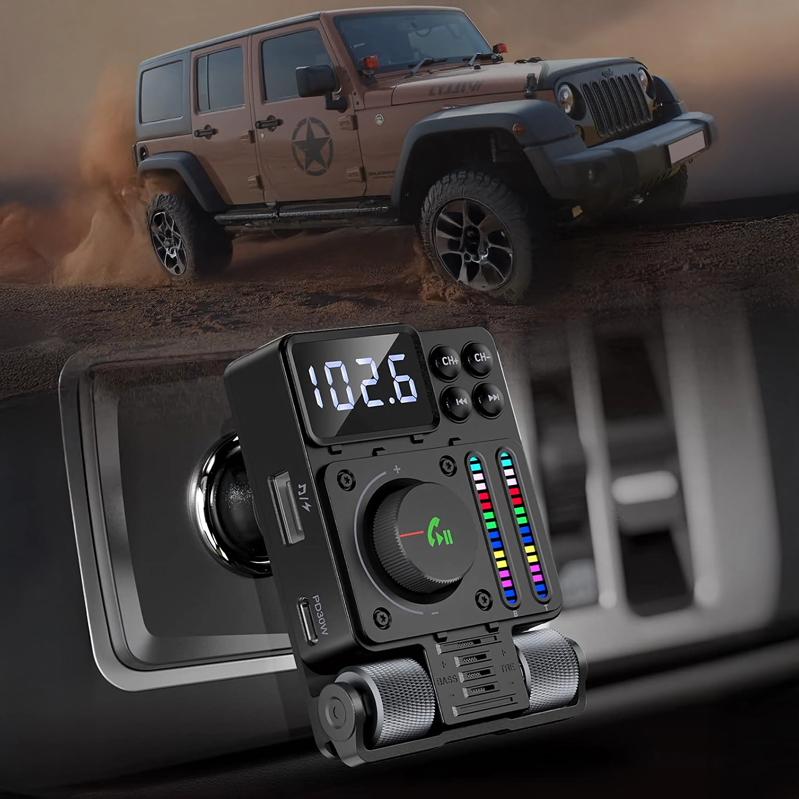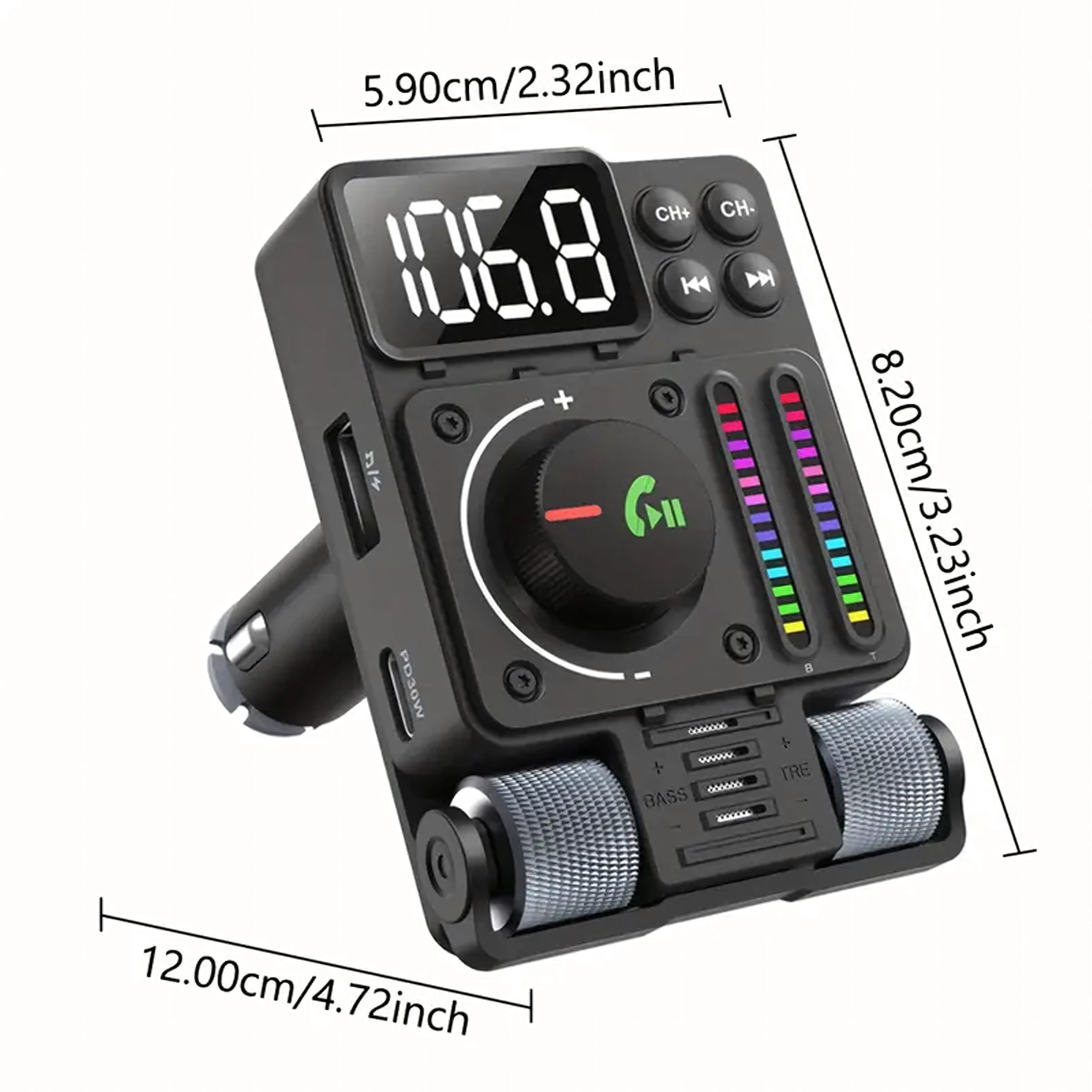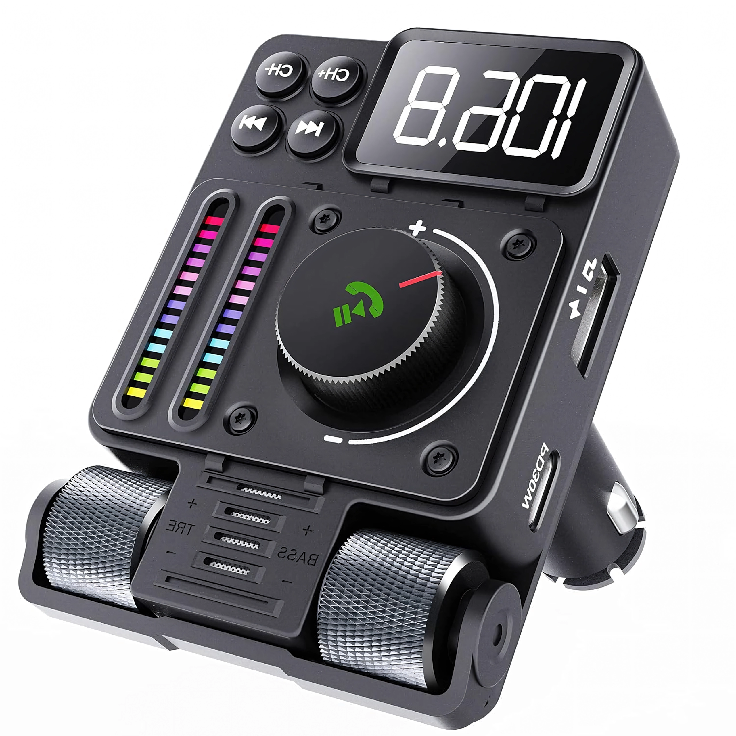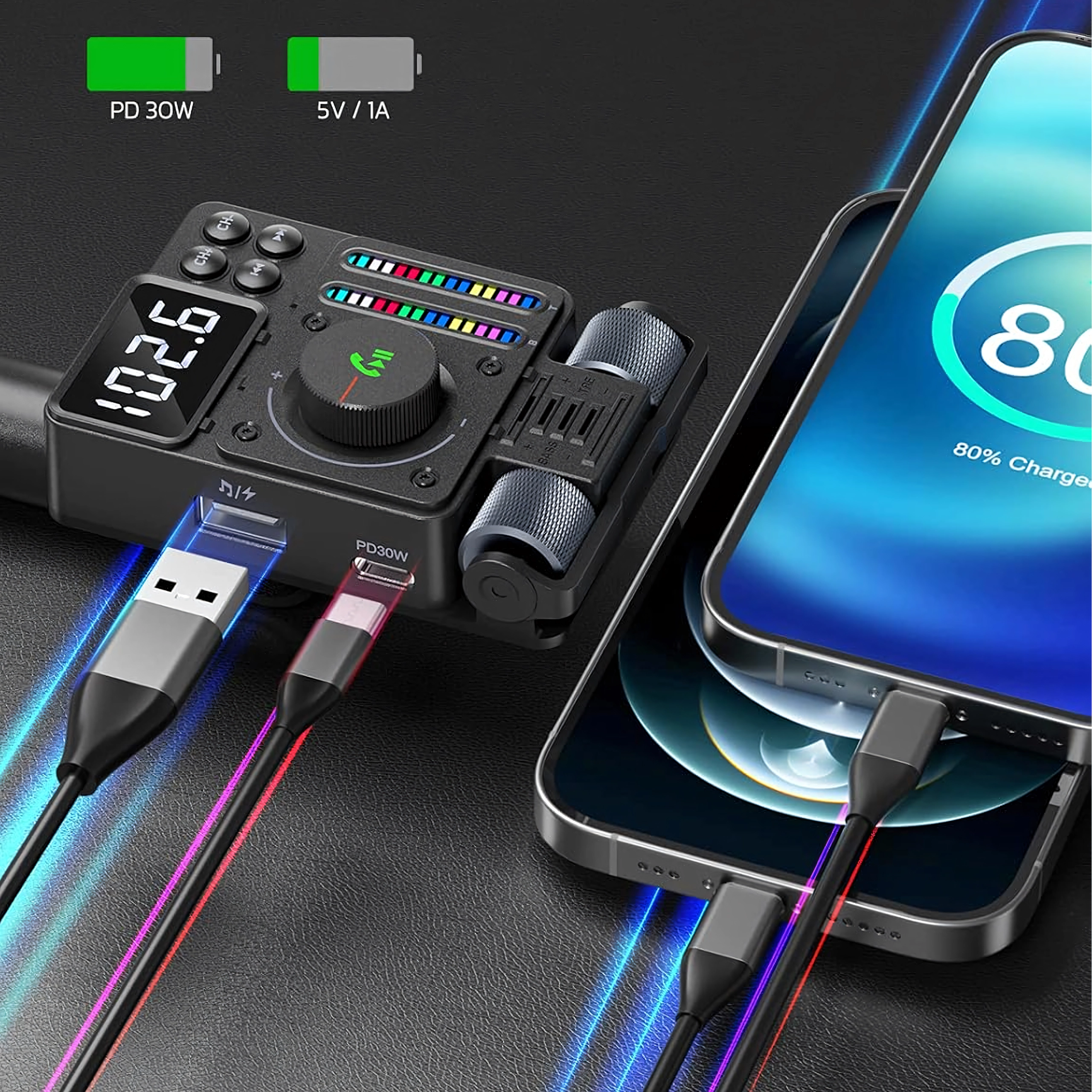 Večnamenski Bluetooth 5.3 FM oddajnik za avto s hitrim polnjenjem PD 30 W ponuja pretakanje glasbe, čiste prostoročne klice in barvno LED osvetlitev. Idealen za udobno in moderno uporabo opreme v vašem vozilu.