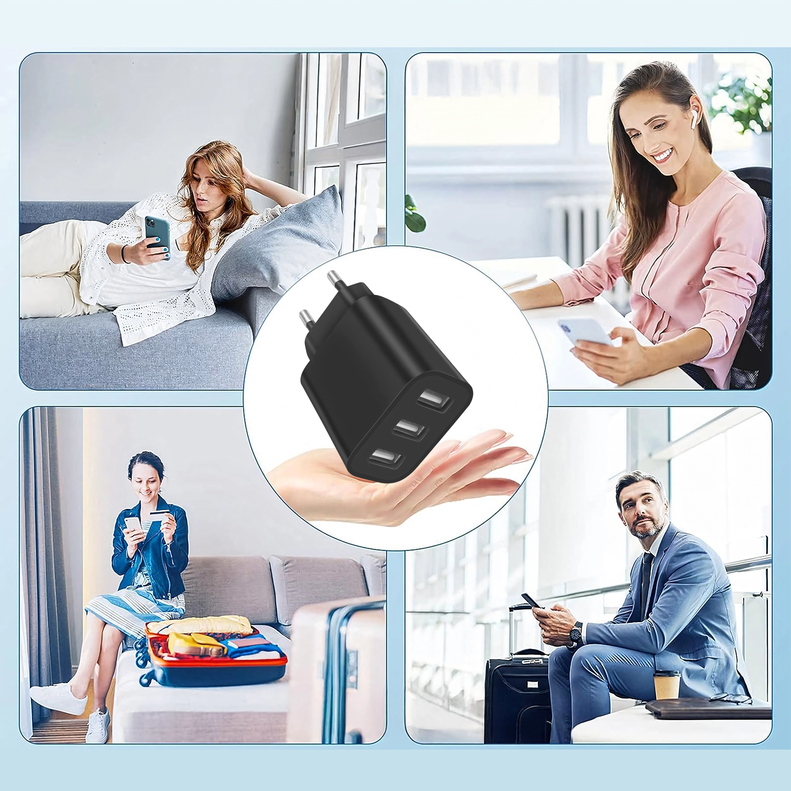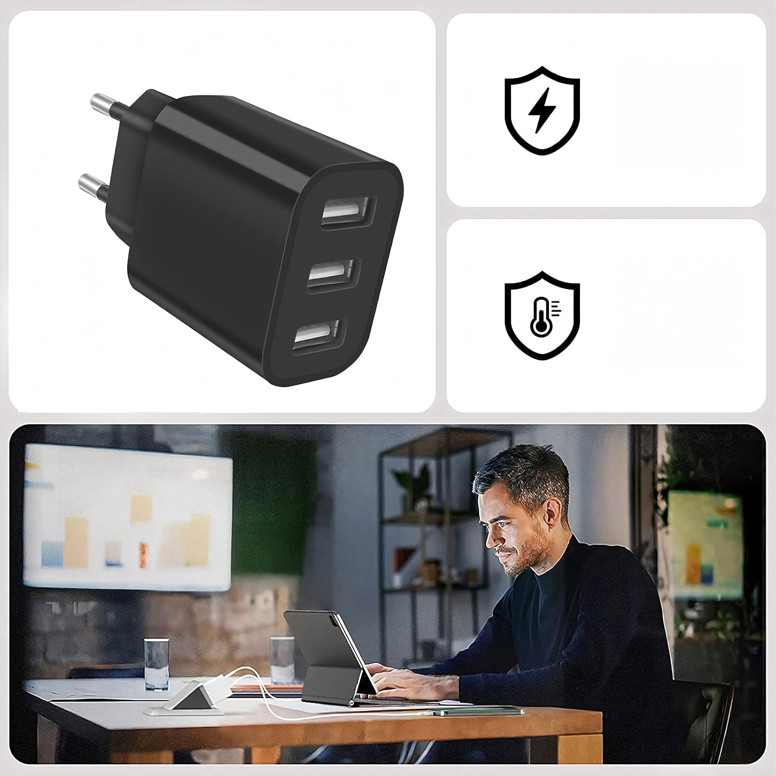 Kompakten in zmogljiv omrežni polnilec s 3 USB vrati omogoča hitro in varno polnjenje do treh naprav hkrati. Zahvaljujoč skupnemu izhodu 5V/3,4A in zaščiti pred prenapetostjo je idealen za dom in potovanja.