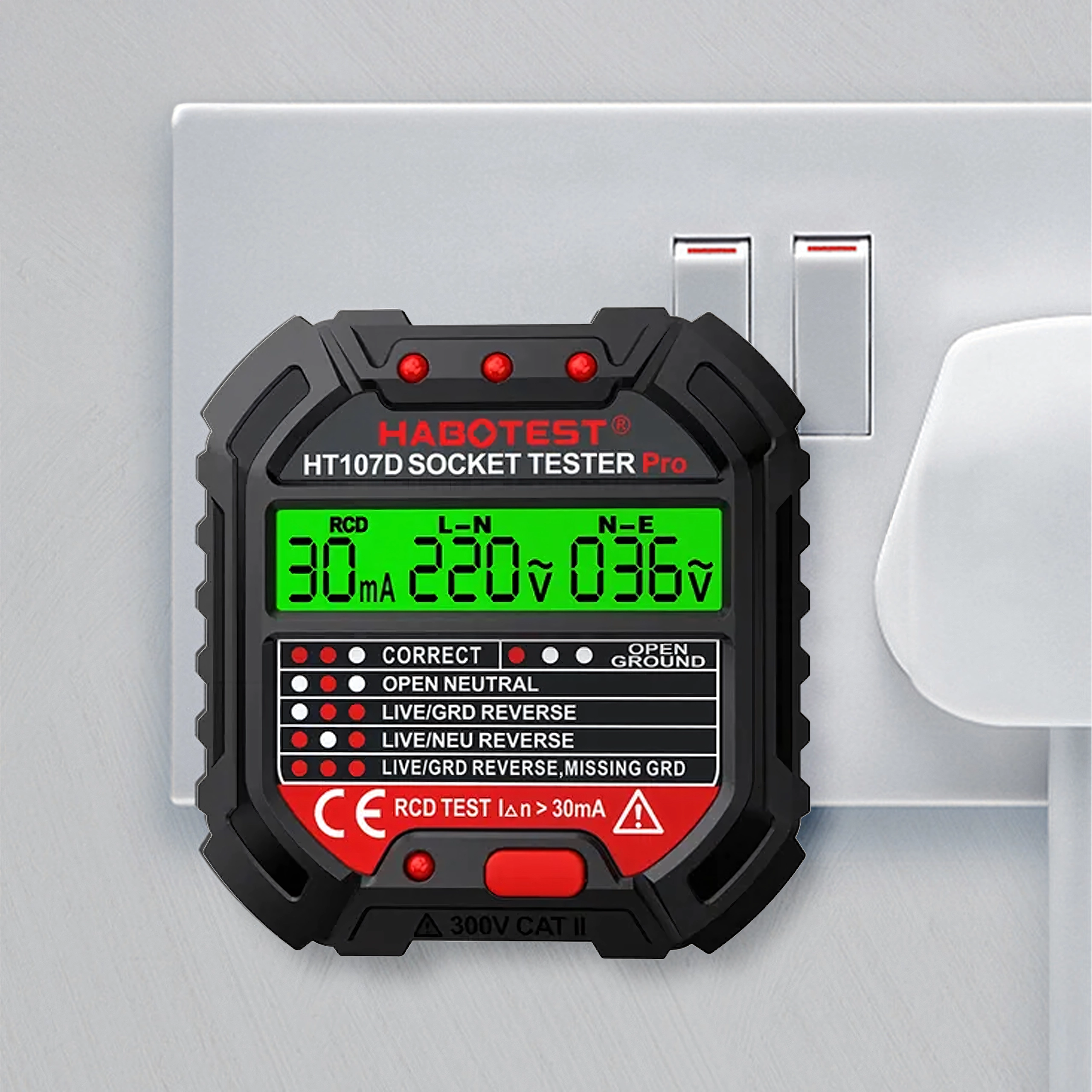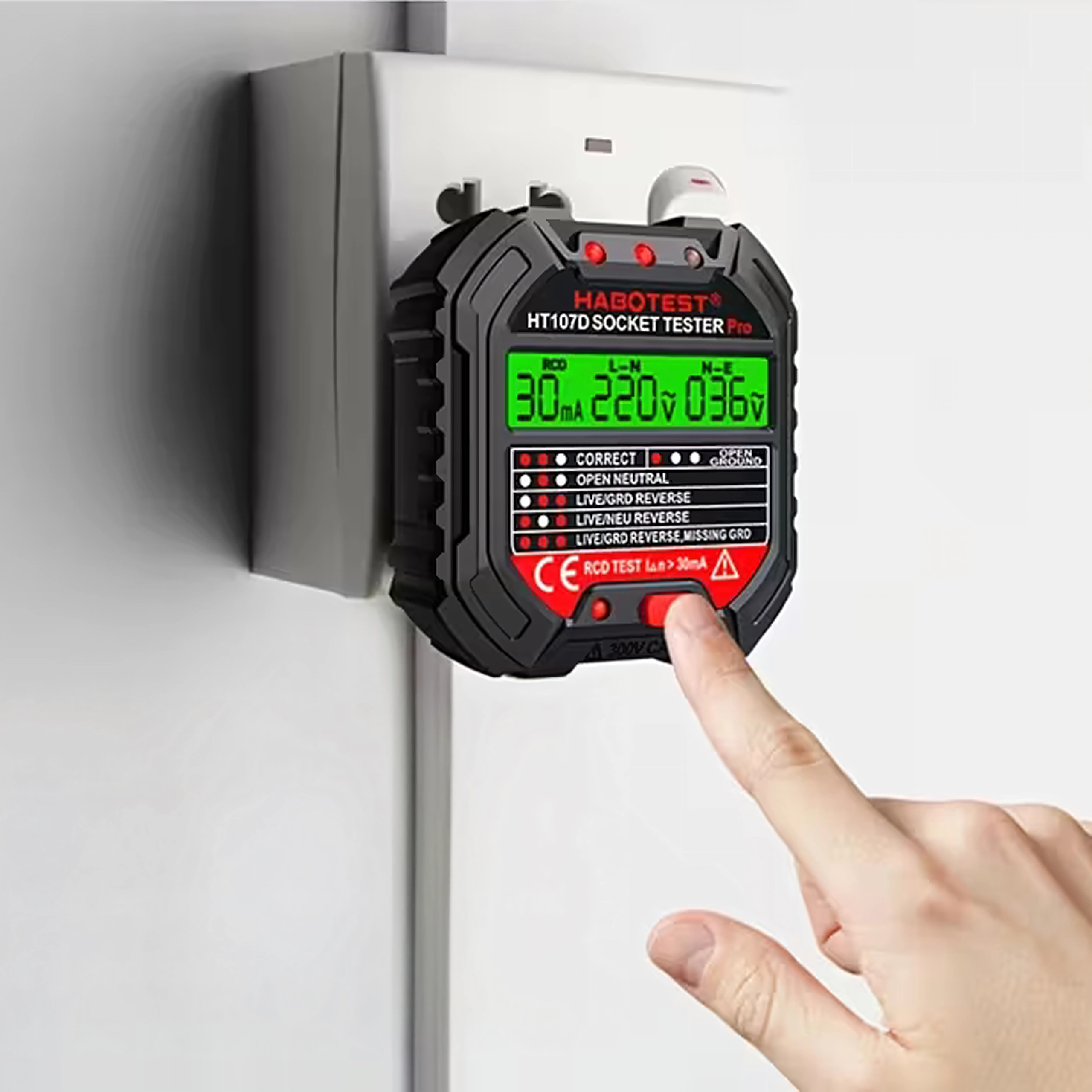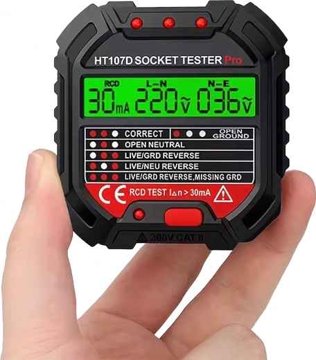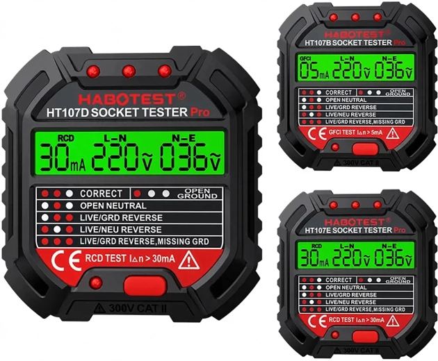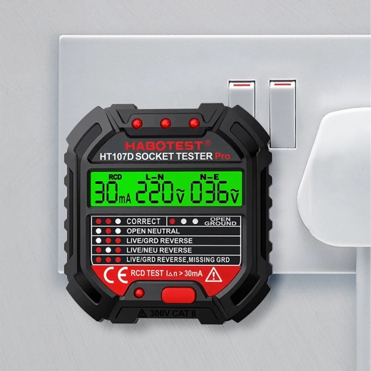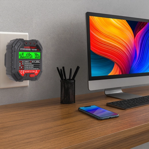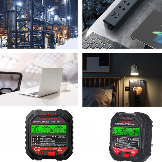 HABOTEST HT107D je praktično orodje za hitro preverjanje omrežnih vtičnic. Zahvaljujoč jasnemu LCD zaslonu nudi pregledne informacije o stanju ožičenja in napetosti, zato takoj ugotovite, ali je vtičnica varna za uporabo. Vgrajen RCD test omogoča preveriti delovanje FID-stikala in povečati zaščito pred električnim udarom.