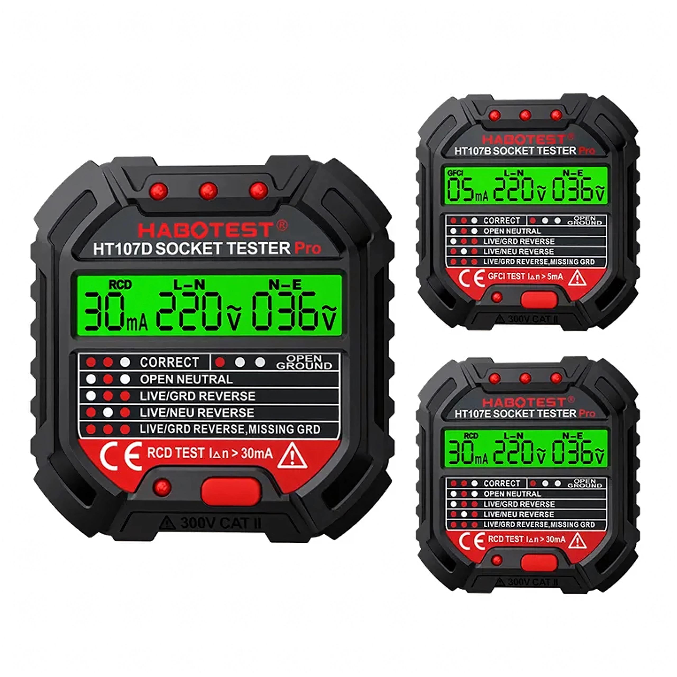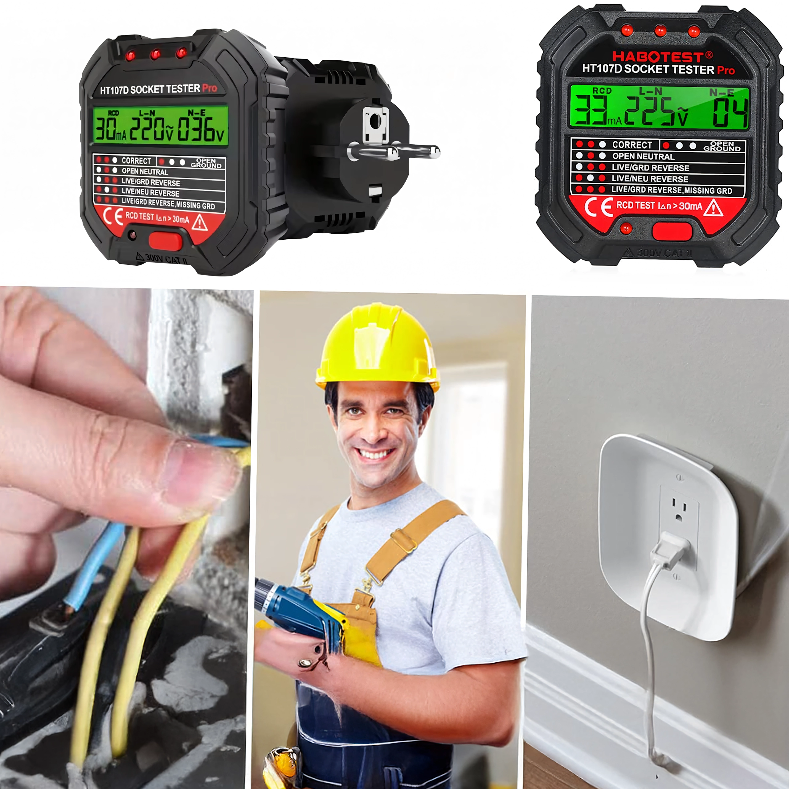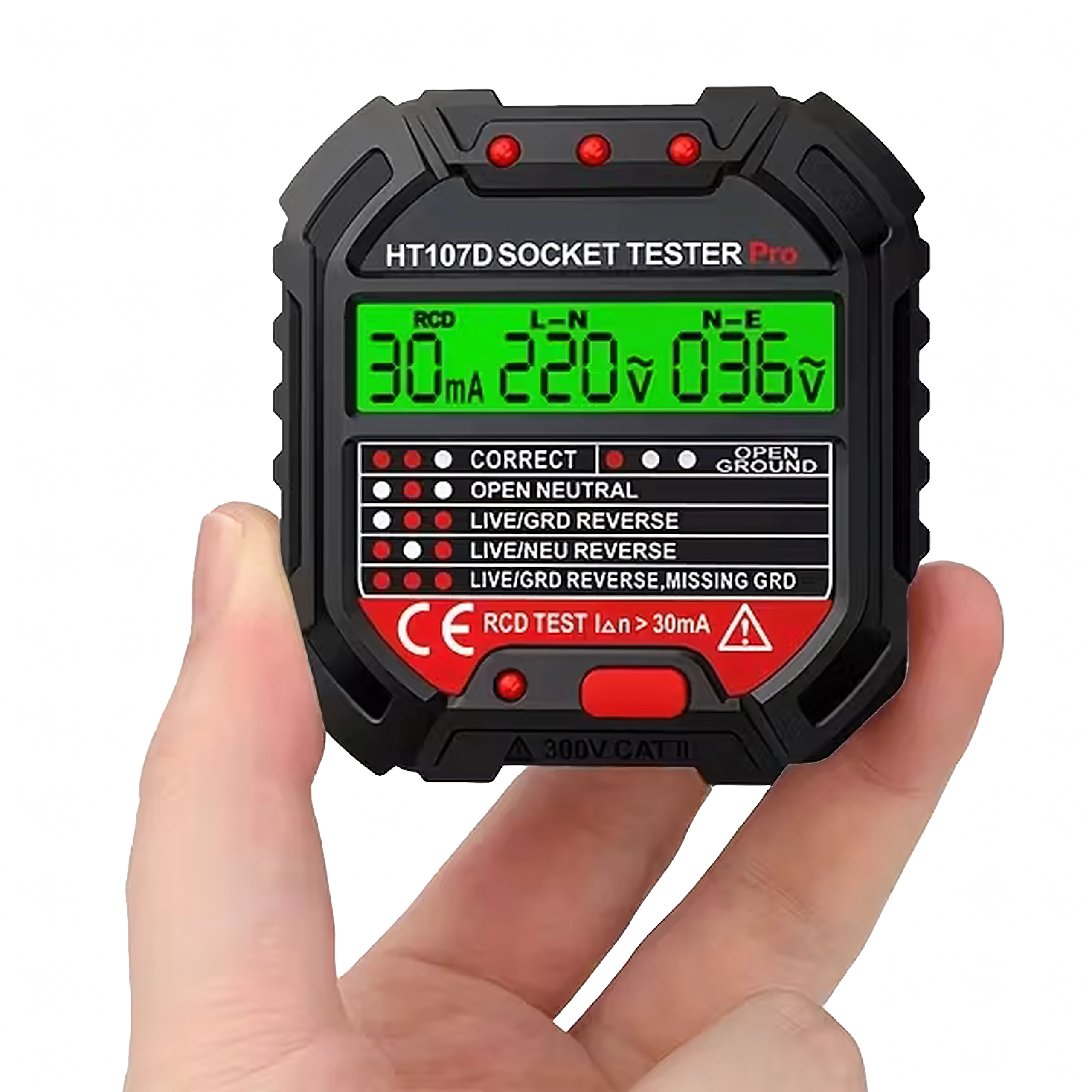 HABOTEST HT107D je praktično orodje za hitro preverjanje omrežnih vtičnic. Zahvaljujoč jasnemu LCD zaslonu nudi pregledne informacije o stanju ožičenja in napetosti, zato takoj ugotovite, ali je vtičnica varna za uporabo. Vgrajen RCD test omogoča preveriti delovanje FID-stikala in povečati zaščito pred električnim udarom.