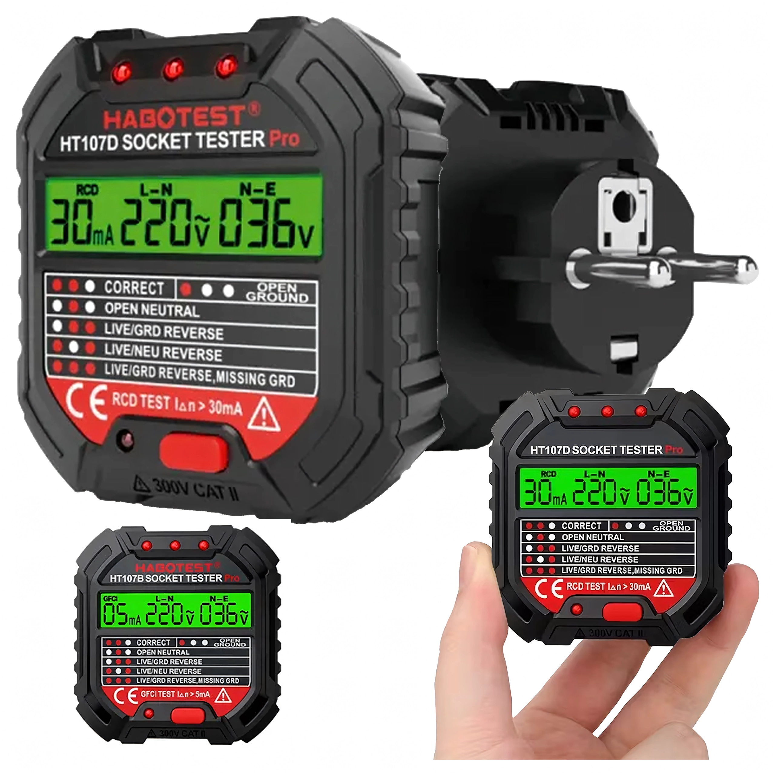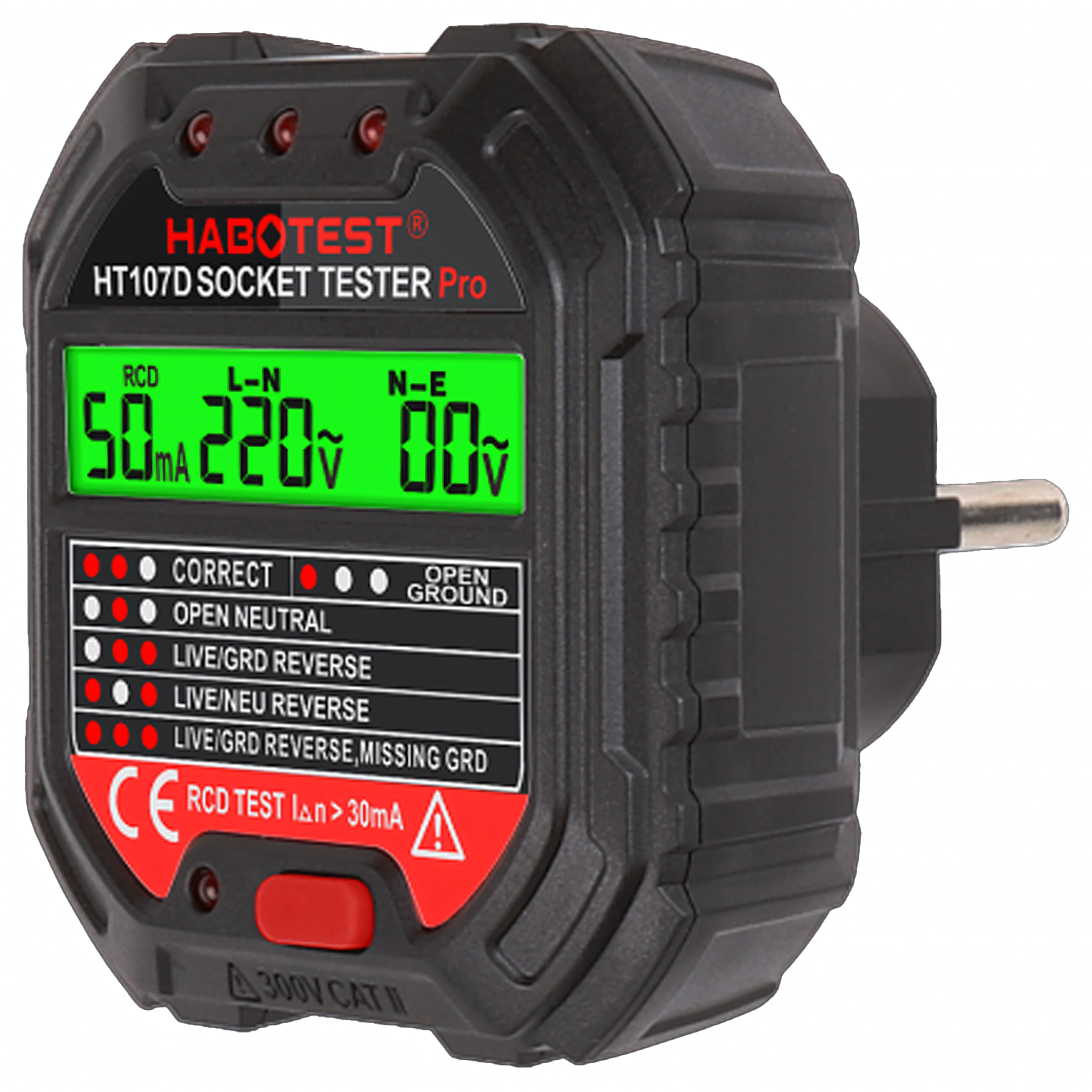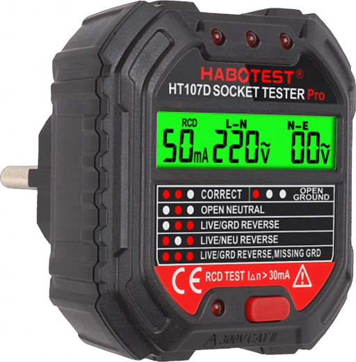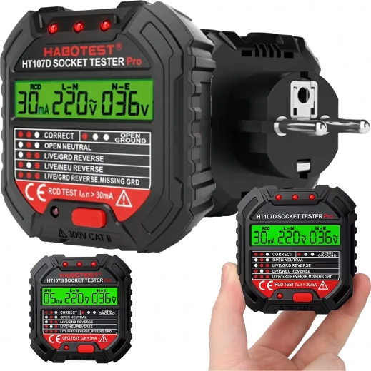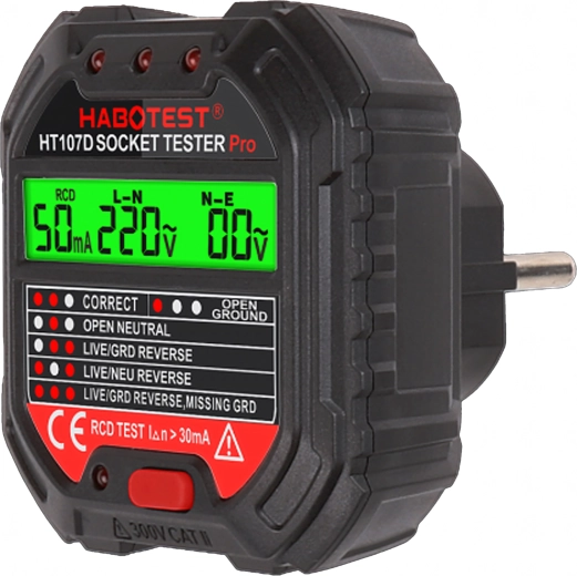 Poskrbite za varnost doma, v pisarni in delavnici s pametnim testerjem napetosti HABOTEST HT107D. Ta kompaktni in zelo funkcionalni tester vtičnic z LCD zaslonom hitro odkrije napake v elektroinštalaciji in pomaga preprečiti okvare ter draga popravila. Podpira tudi test RCD (FID-stikalo) za preverjanje pravilne zaščite tokokroga.