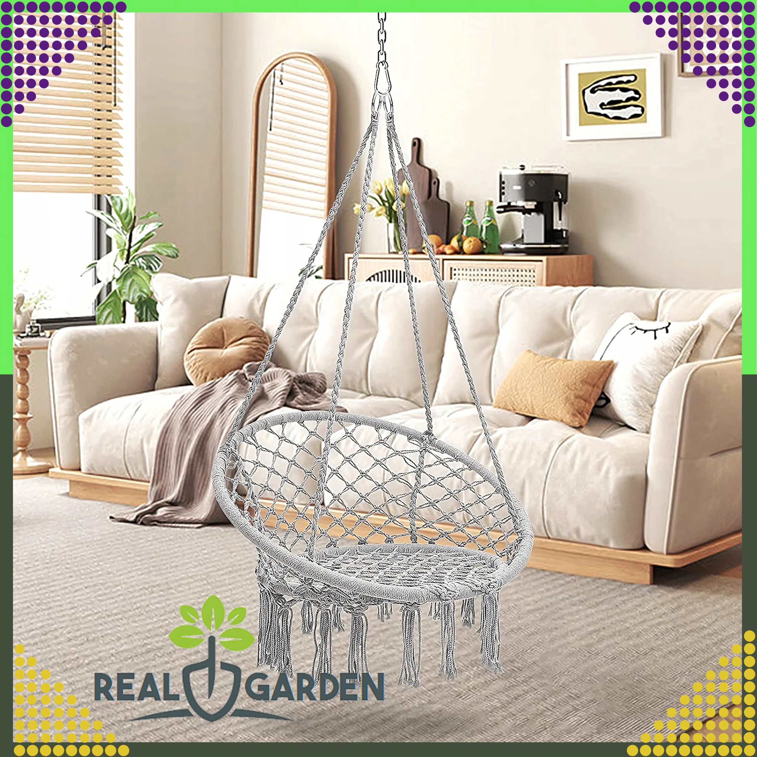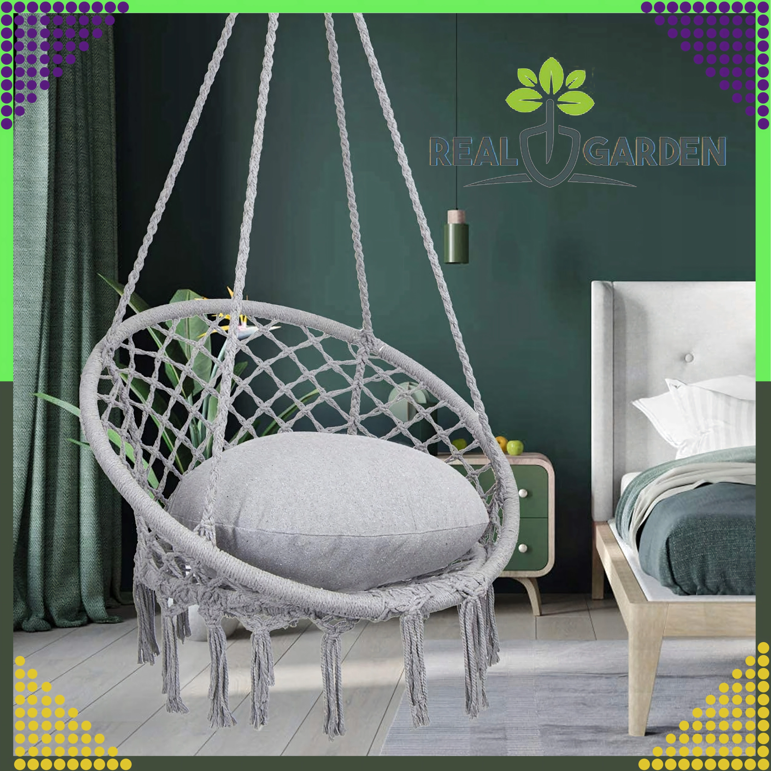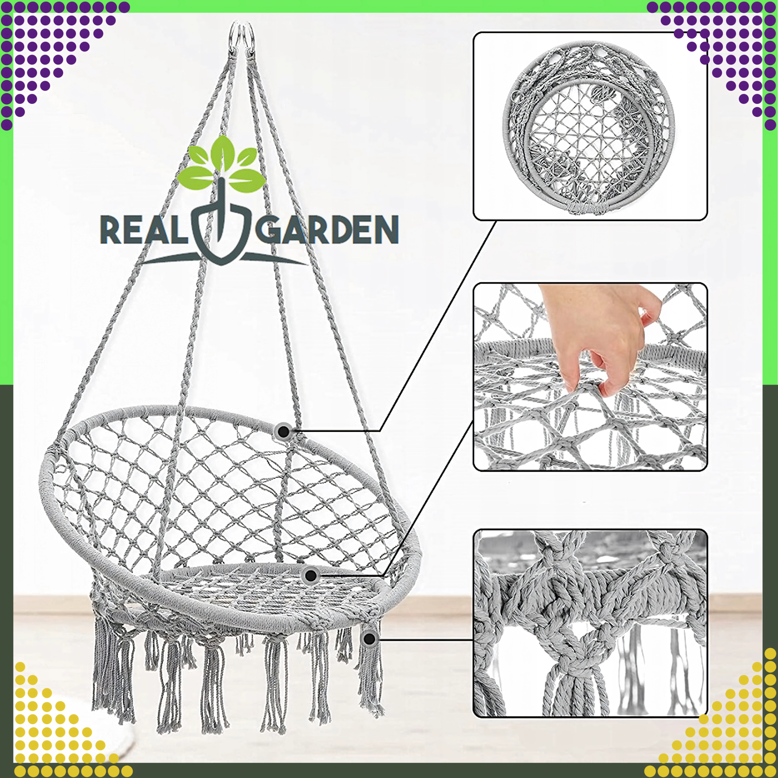Uživajte v sprostitvi v visečem gnezdu, ki se zaradi modernega boho videza poda v dnevno sobo, na teraso, balkon in na potovanja. Močne vrvi in odporna zračna bombažna tkanina zagotavljajo stabilnost in udobje tudi pri daljšem sedenju.