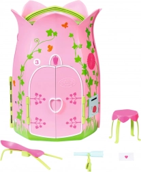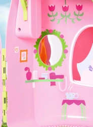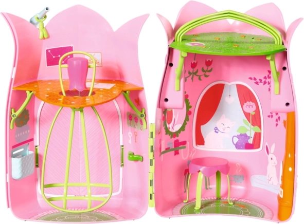 Odkrijte svet domišljije s Hišico Pisalne Zgodbe BABY born, kjer vsak kotiček spodbuja nove zgodbe. Z odpiranjem hišice v obliki cveta se razkrije prečudovita notranjost z mizico, kaminom in gugalnico, obešeno s stropa igralnice. Na steni je predalček za shranjevanje čarobne paličice, zato igre nikoli ne zmanjka.