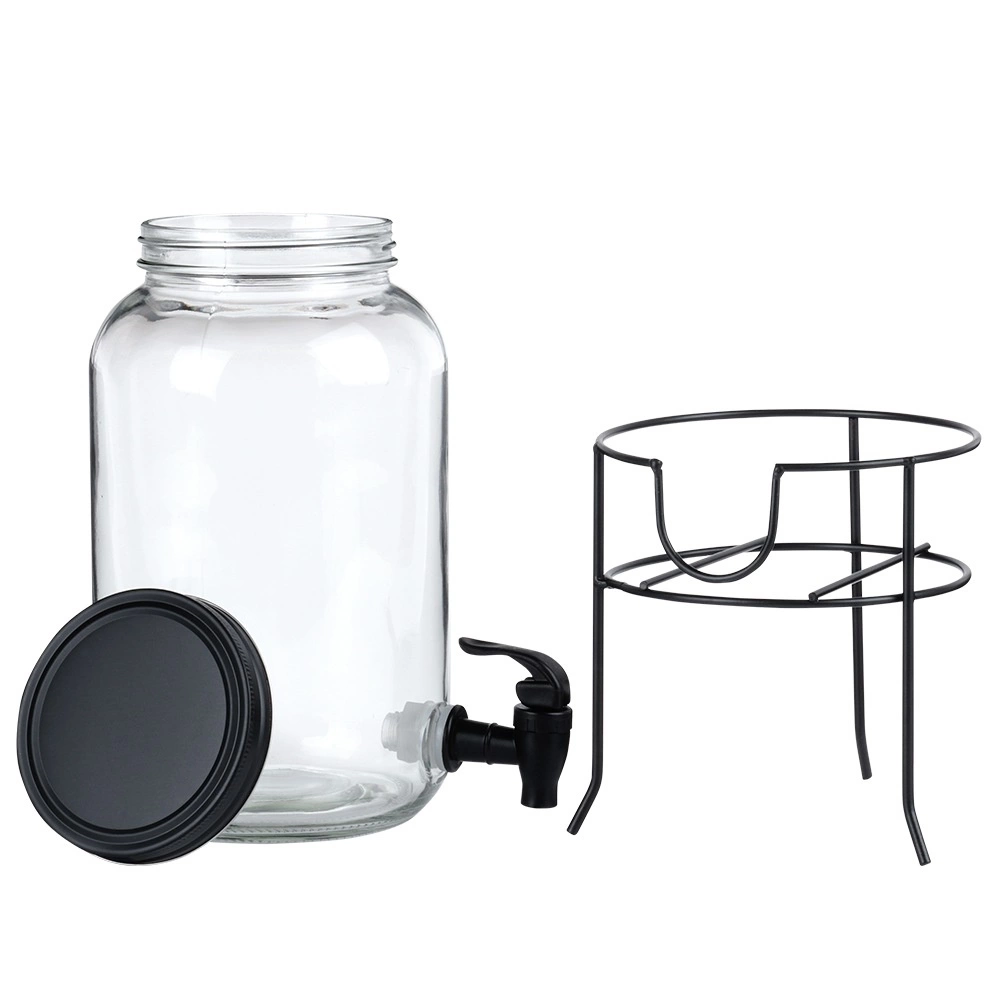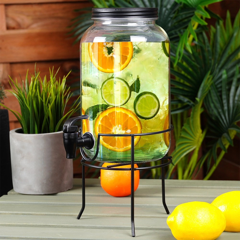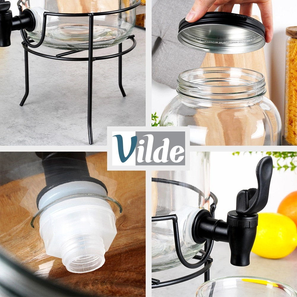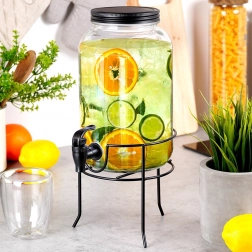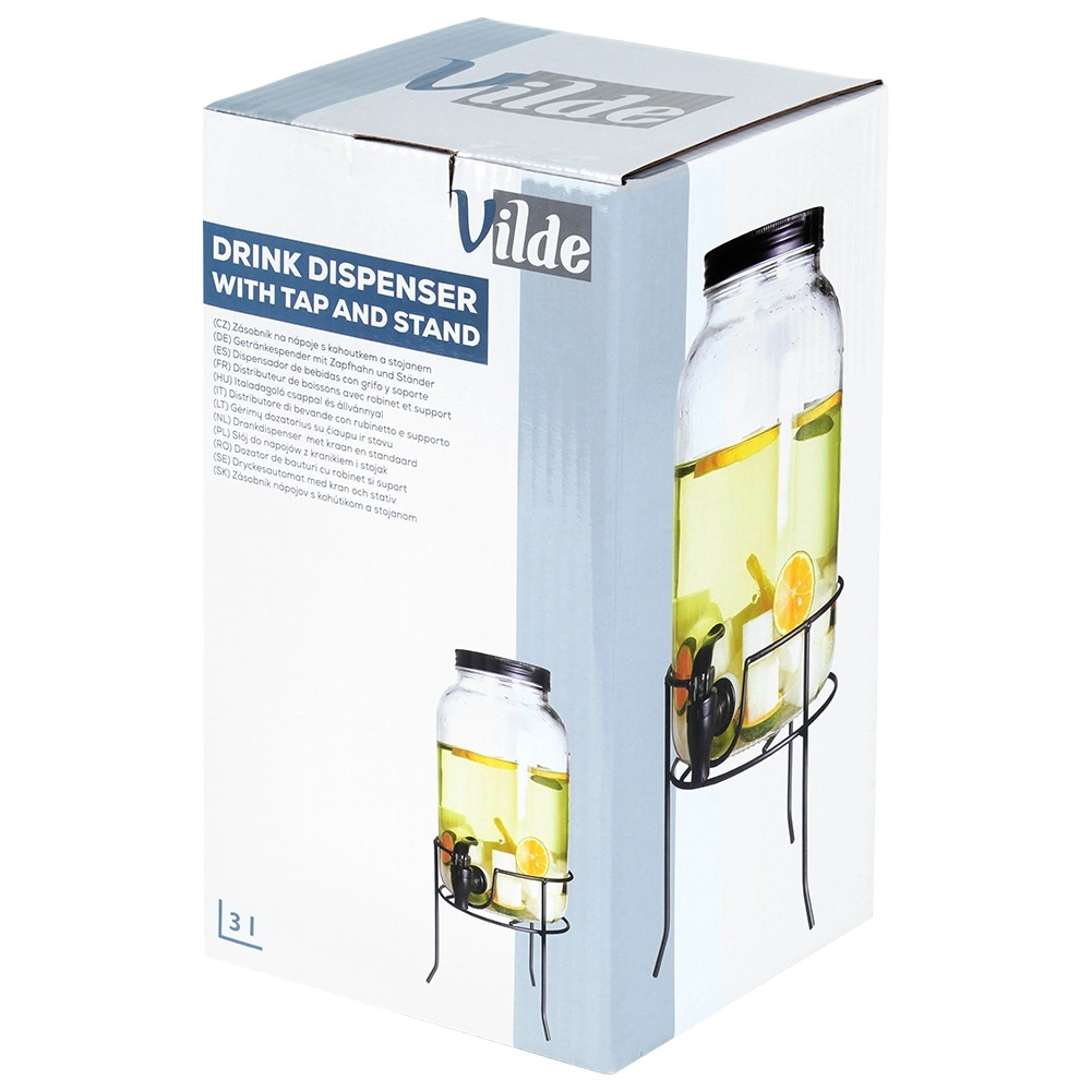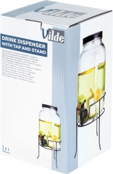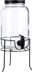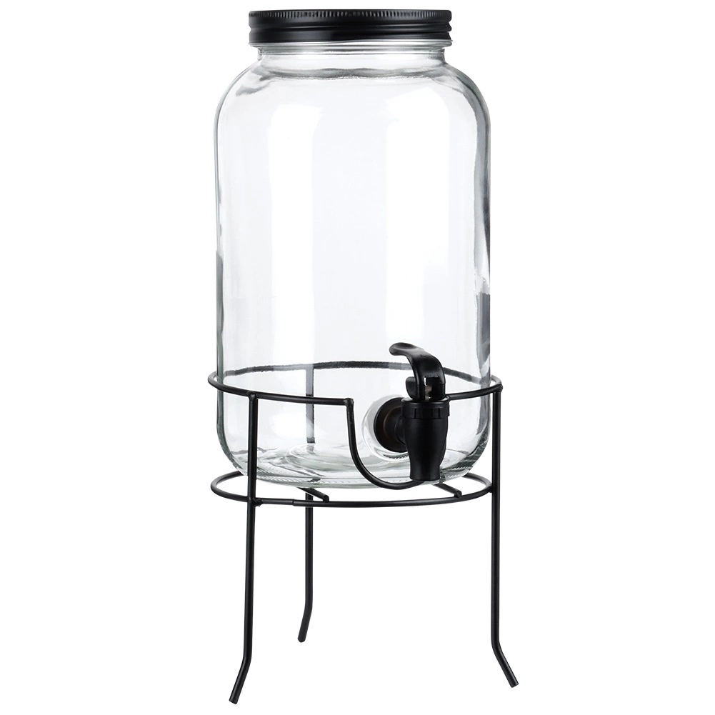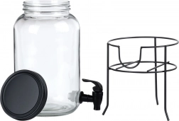 Praktični dozirnik pijač iz kakovostnega debelega stekla s črno pipo in mat črnim pokrovčkom ohranja vaše osvežilne napitke zaščitene pred insekti in nečistočami. Stabilno kovinsko stojalo dvigne posodo na idealno višino za kozarce, zato je točenje čisto in udobno.