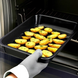 Oblika in površina zagotavljata enakomerno zapečenost ter udobno vstavljanje v pečico. Odličen za vsakodnevno kuhanje in pečenje.