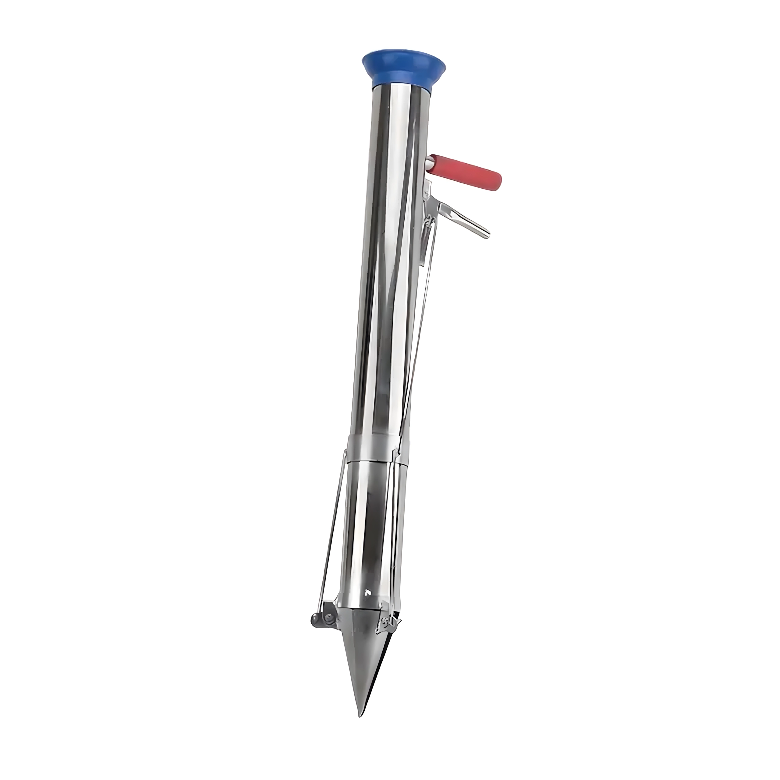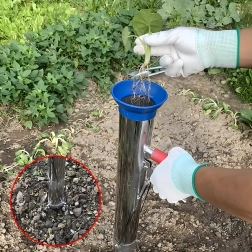 Konica stožčaste oblike in valjasto telo z enim pritiskom ustvarita čistino, vanjo vstavite sadiko, nato pa s pomočjo ročice zemljo zlahka sprostite nazaj.