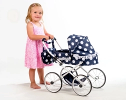 Ta prikupen retro voziček za punčke je odlična izbira za otroke, ki imajo radi igro vlog. Kombinacija črne barve z belimi pikami in okrasno čipko deluje stilsko in brezčasno, ratanova zibelka vozičku doda čaroben videz. Zahvaljujoč nastavljivemu ročaju (55 cm) se voziček dobro prilagodi otrokovi višini.