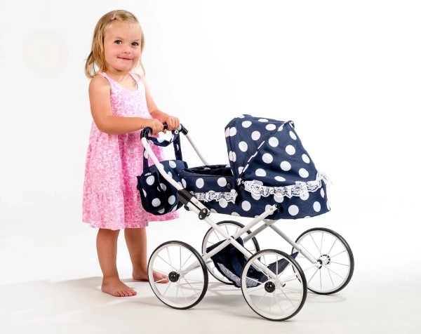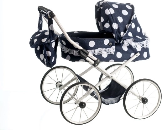 Stilski voziček za punčke v retro dizajnu bo navdušil vsako malo mamico. Ponuja črno izvedbo s pikami in elegantno čipko, nastavljiv ročaj 55 cm za udobno vodenje in zložljivo strešico za enostavno uporabo. Priloženi so torbica preko ročaja in praktična spodnja košara za drobnarije.