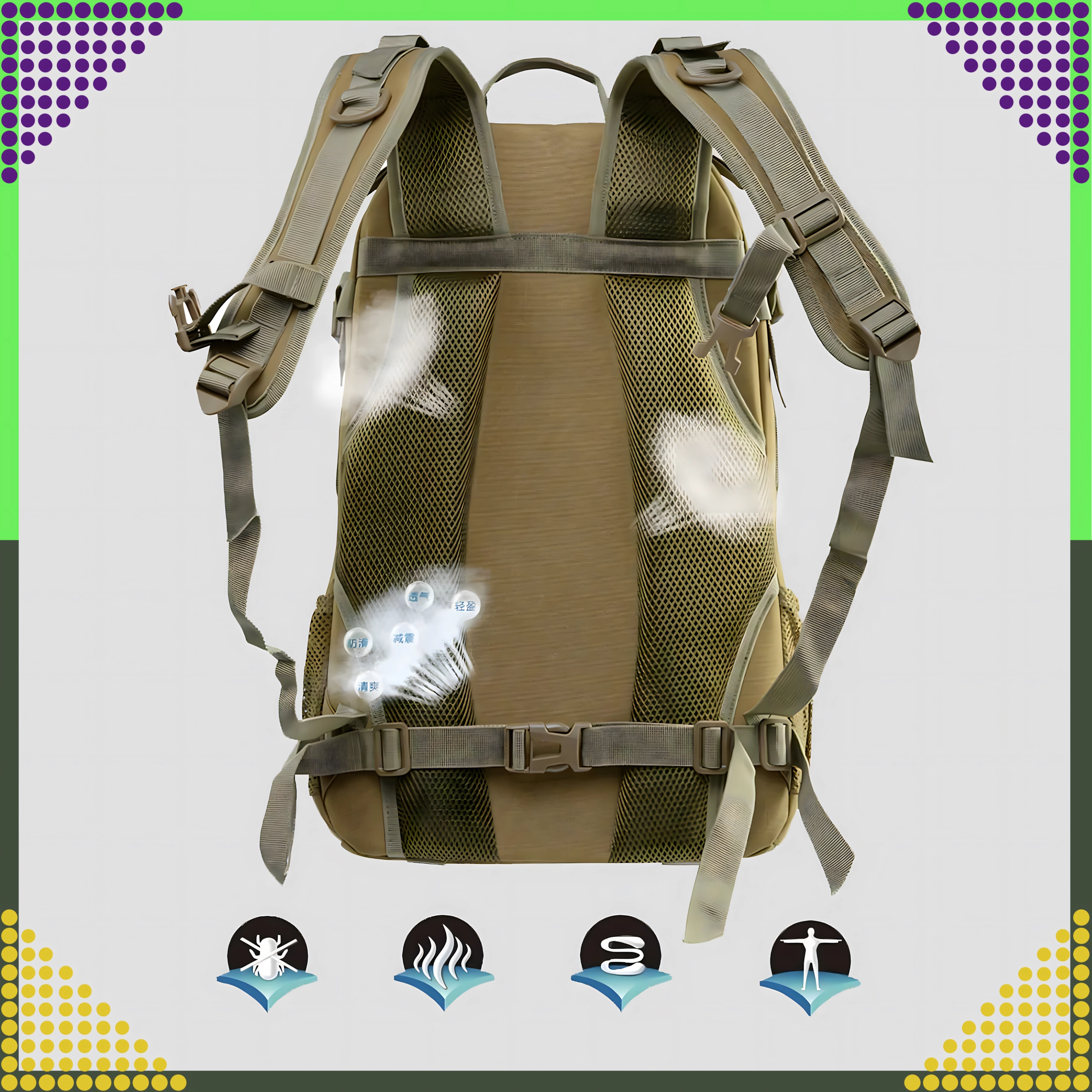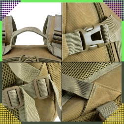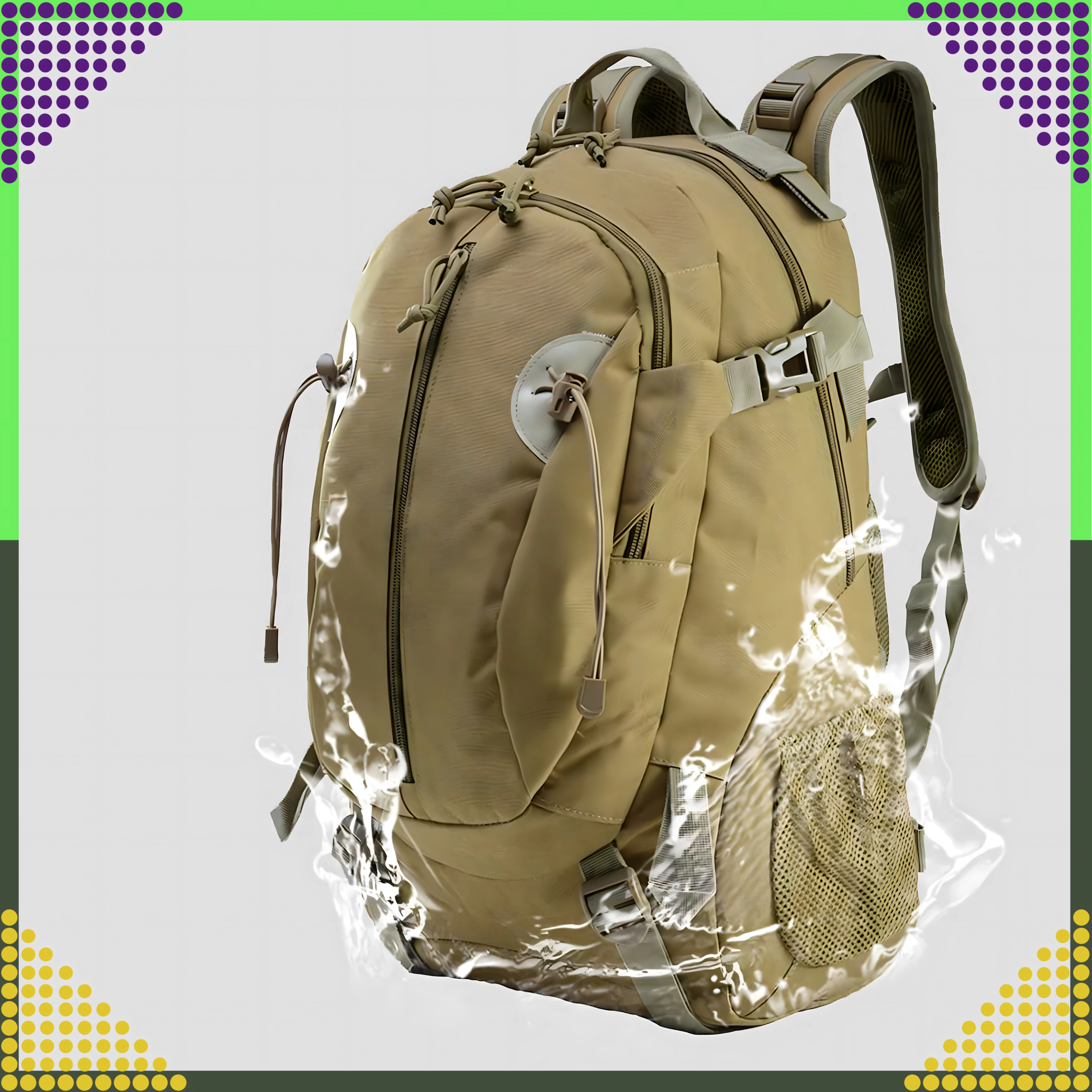 Ta taktični nahrbtnik v univerzalni barvi kaki je zasnovan za zanesljivo vsakodnevno uporabo v naravi in mestu. Vzdržljiv 900D poliester z notranjo PVC laminacijo povečuje vodoodpornost in ščiti vsebino pred vlago. Oblazinjeno hrbtišče in naramnice s prezračevalnim sistemom zagotavljajo udobje tudi pri daljšem nošenju.
