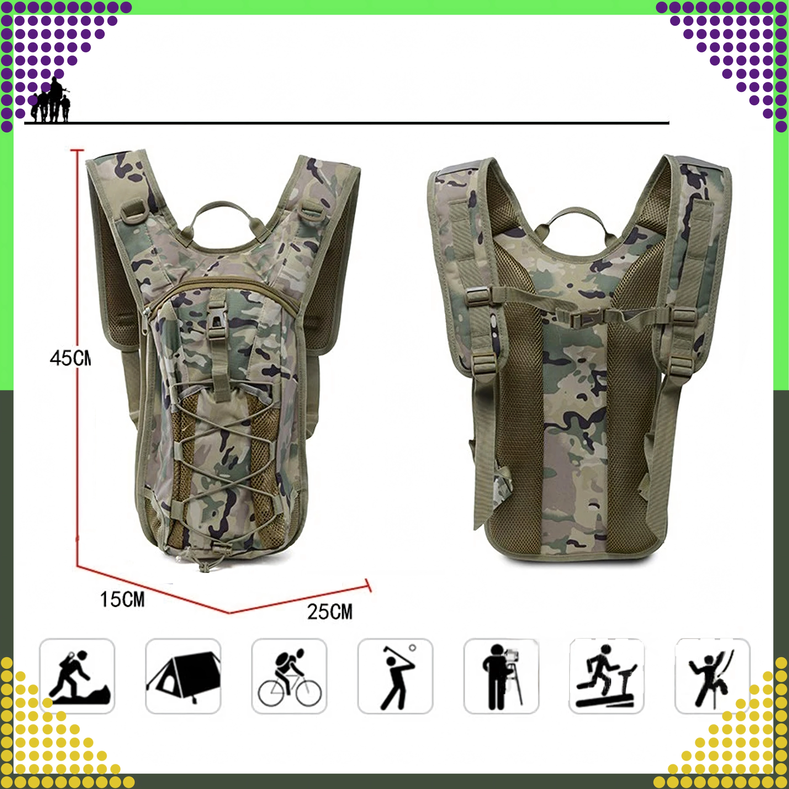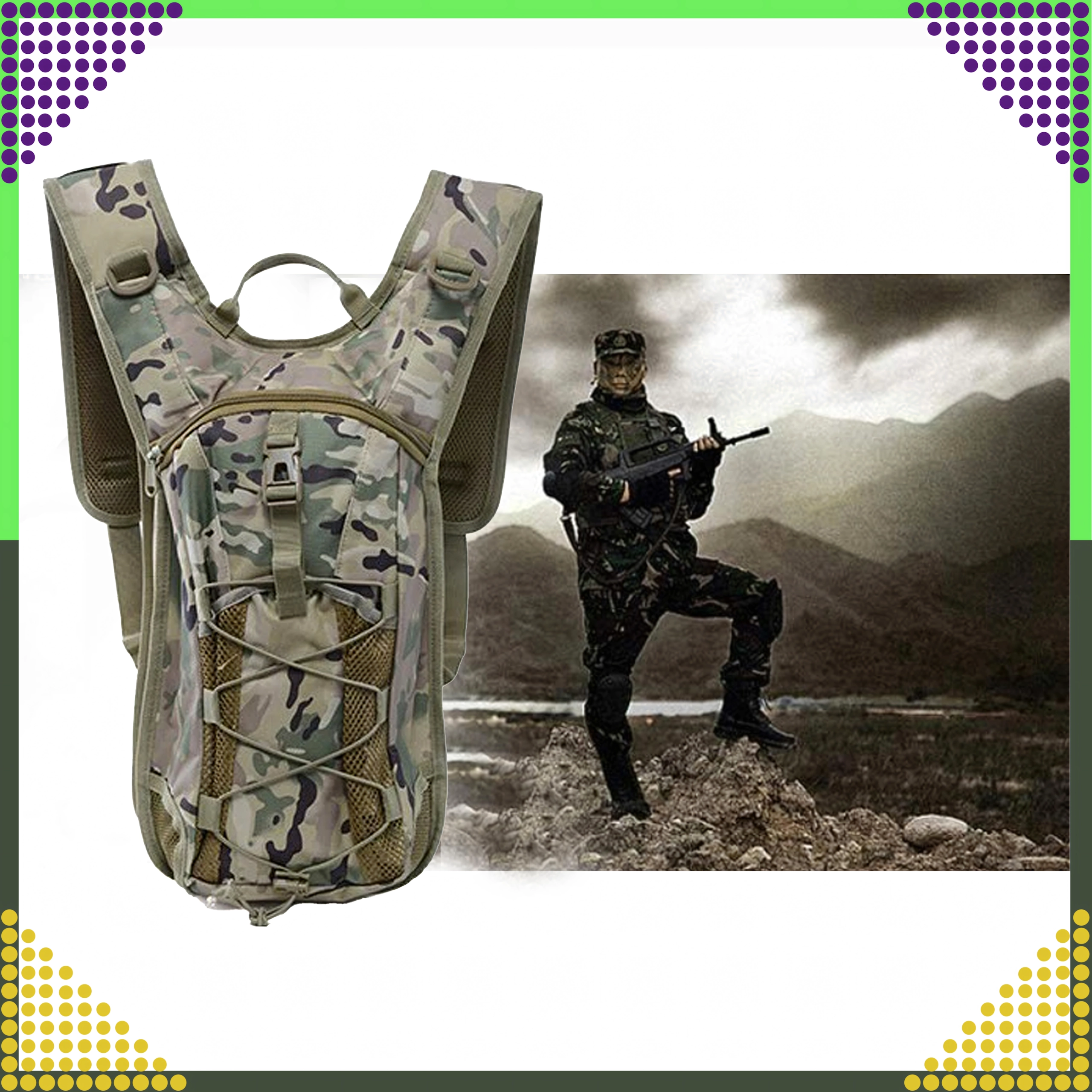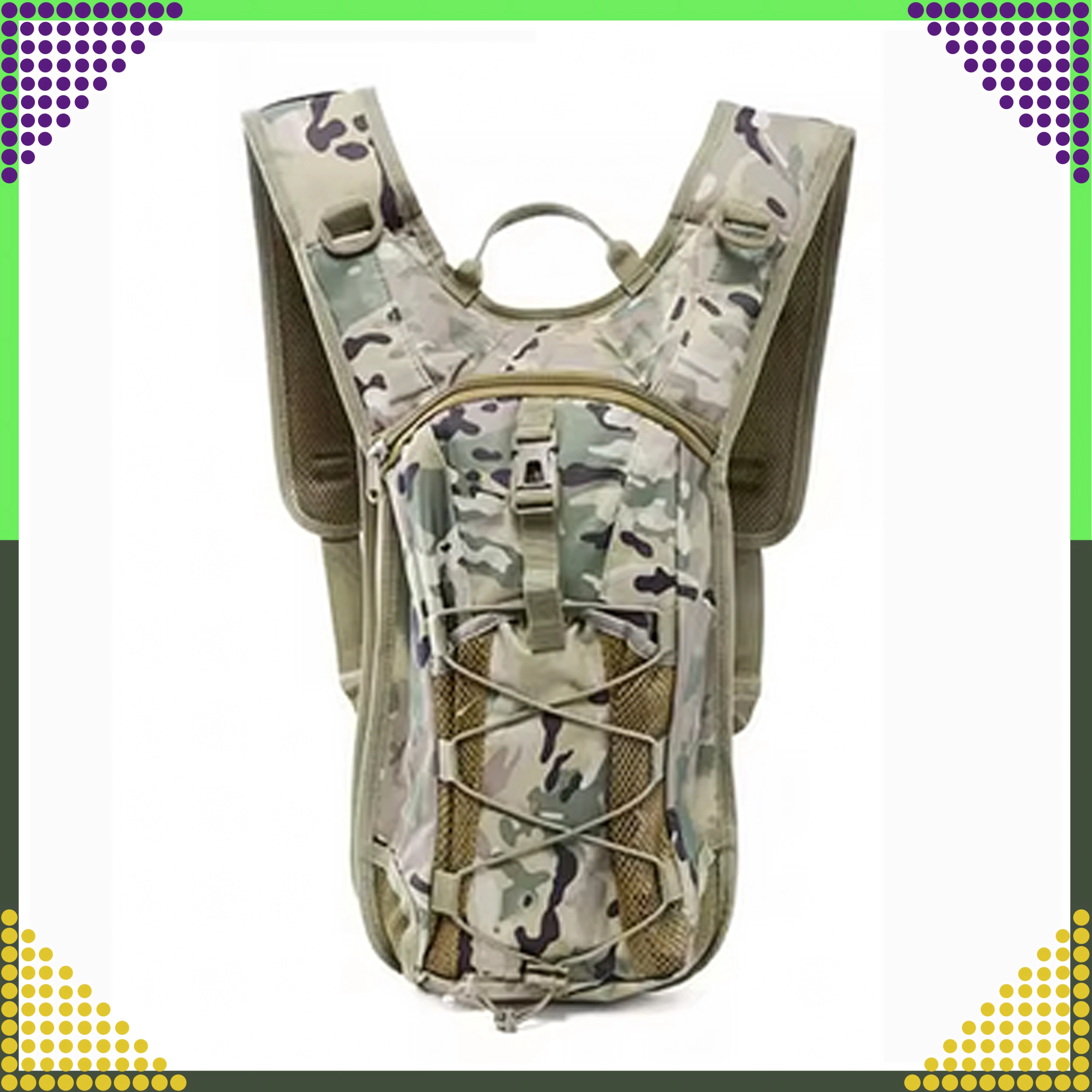 Sprednji žep z zadrgo, elastična bungee vrvica in stranski D-obročki za pritrjevanje drobnarij. Kamuflažni videz in trpežni šivi obvladajo zahtevne terene.