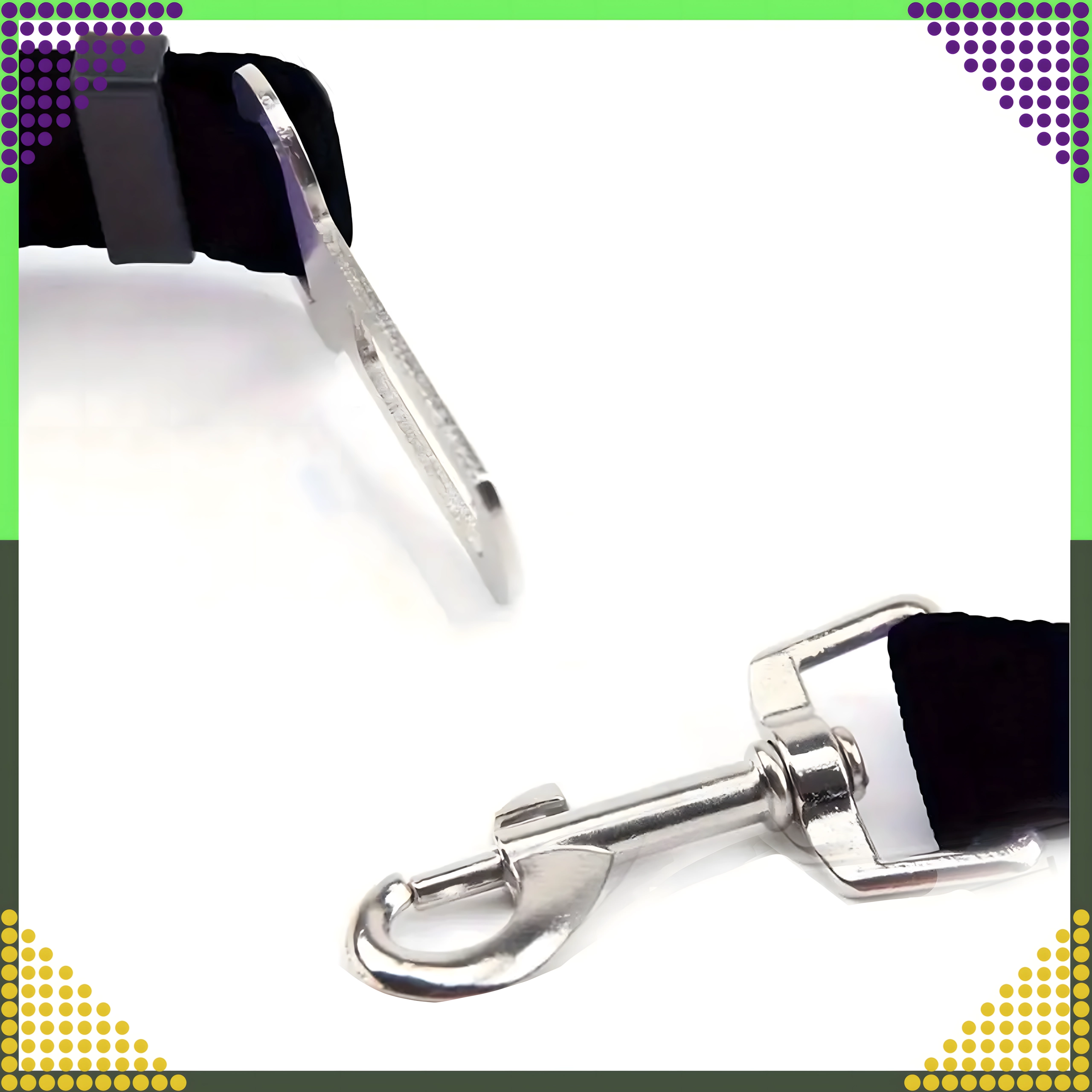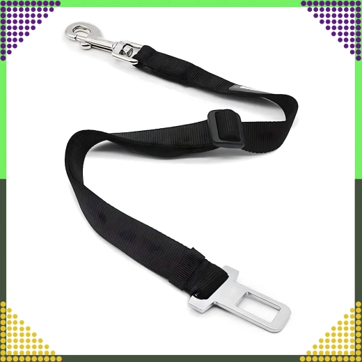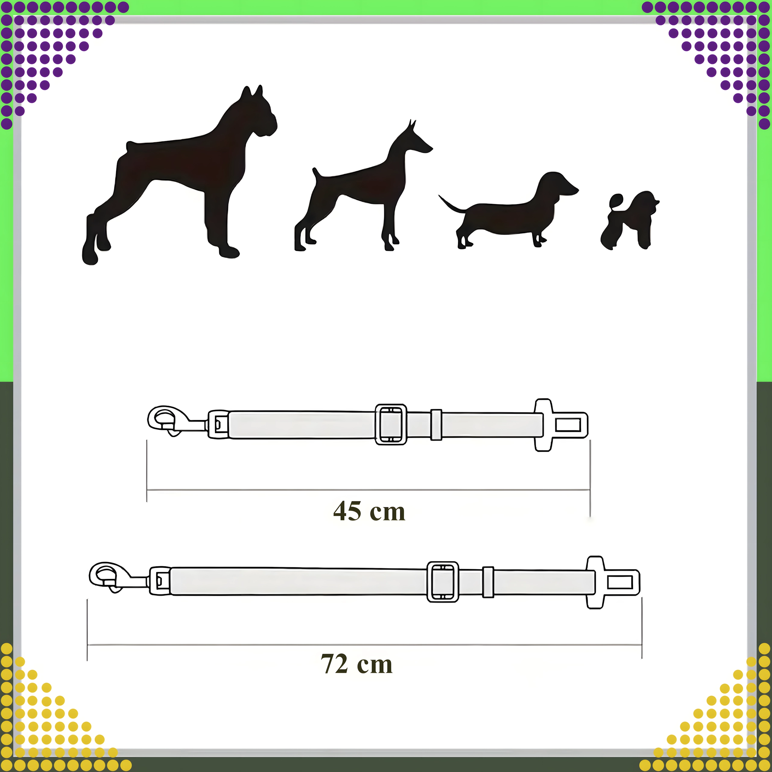 Praktičen pas za zavarovanje psa ali mačke med vožnjo z avtomobilom. Preprosto ga vstavite v standardno režo varnostnega pasu, drugi konec pa z vrtljivim karabinom pripnete na oprtnico (priporočljivo namesto ovratnice). Nastavljiva dolžina 45–72 cm omogoča, da žival sedi ali leži, hkrati pa preprečuje nevarno premikanje po vozilu.