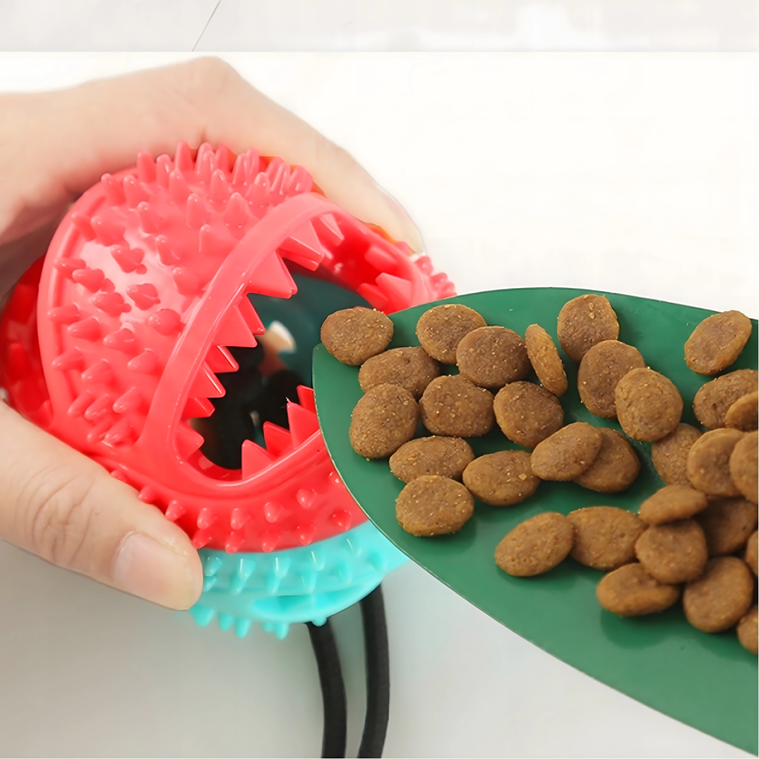 Žogica ima utore in odprtino za priboljške ali brikete. Pes si nagrade postopoma pridobi, kar upočasni prehranjevanje ter poveča motivacijo in mentalno stimulacijo.