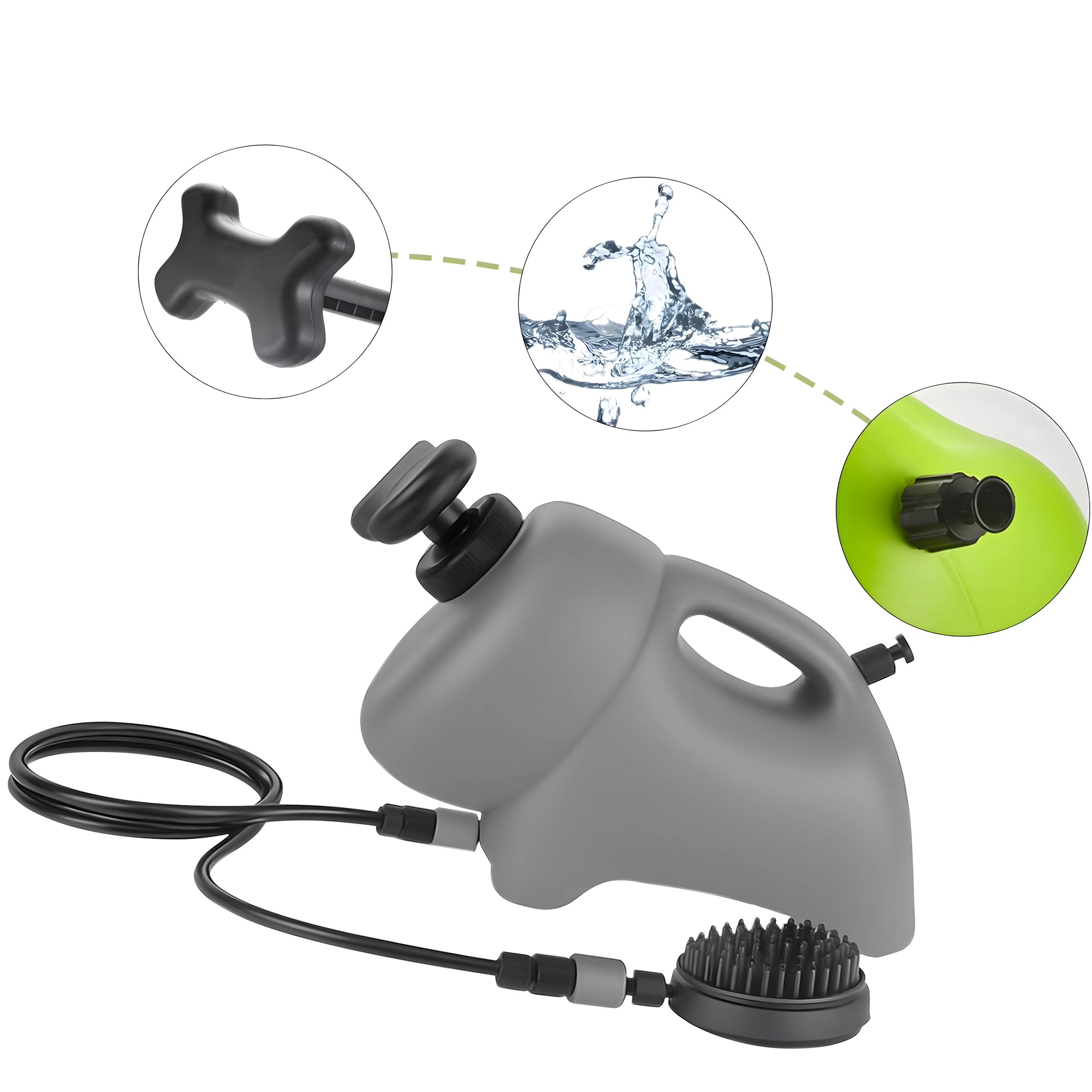 Lahak rezervoar z udobnim ročajem in cevjo zagotovi dovolj vode za celotno kopel tudi na terenu. Deluje brez napajanja – le napolnite in lahko uporabljate kjerkoli.