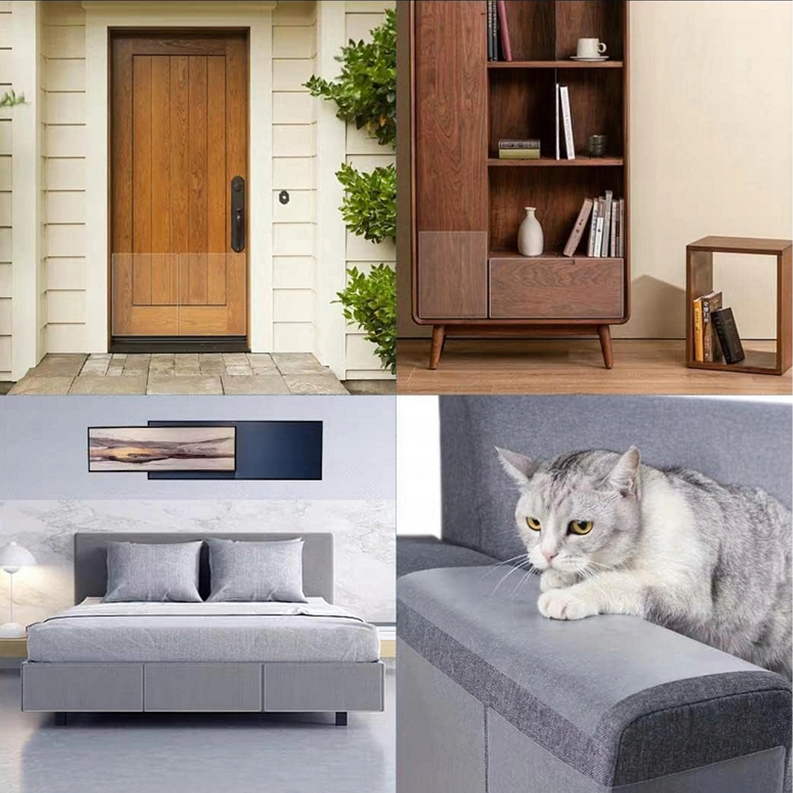 Zahvaljujoč prilagodljivemu materialu se popolno prilega ravnim in rahlo ukrivljenim površinam. Zaščiti oblazinjeno pohištvo, vrata, posteljne okvirje in leseno pohištvo, pri tem pa ohrani videz interierja. Folija je trpežna, pralna in ob pravilni namestitvi dobro drži, vendar jo je mogoče nežno odstraniti in ponovno uporabiti.