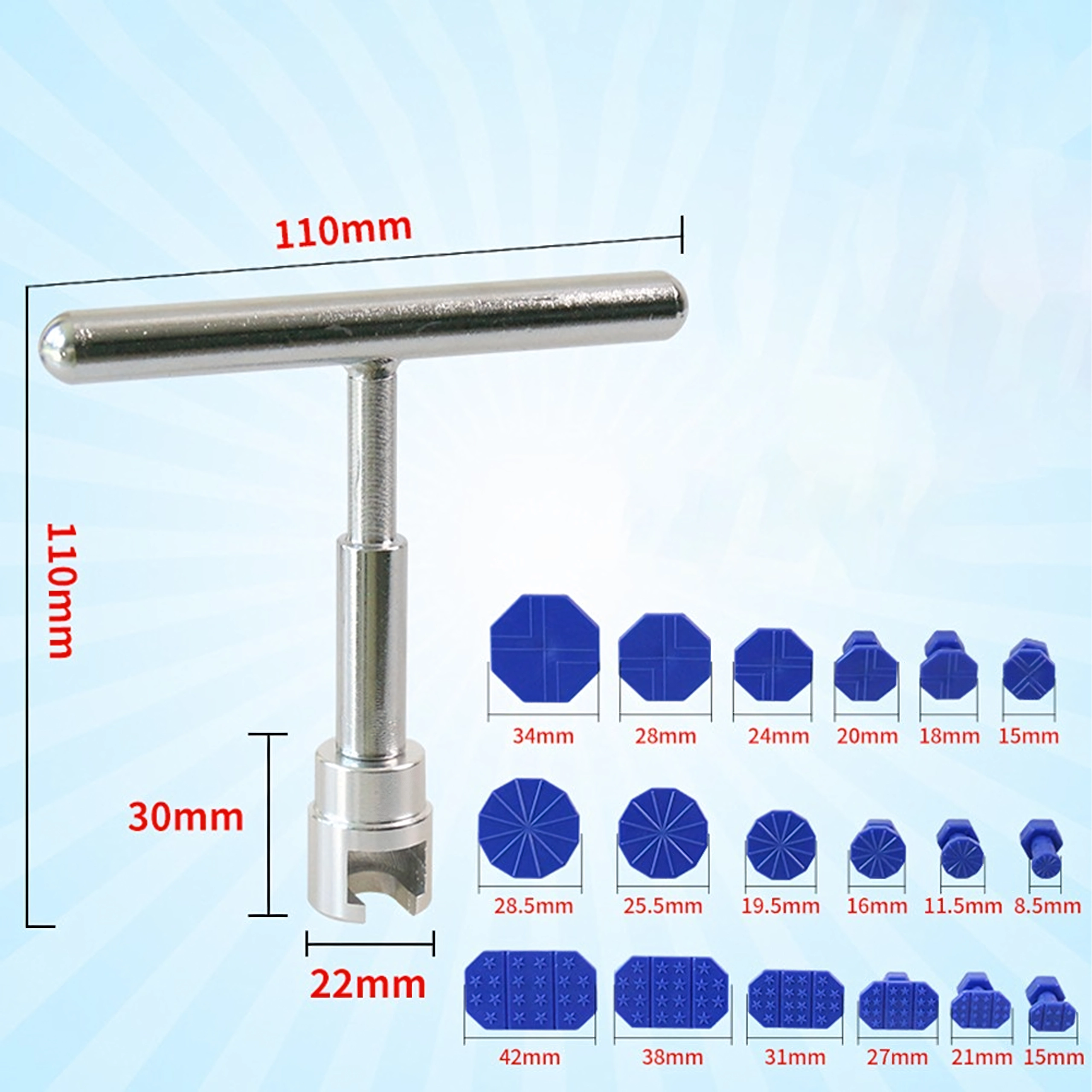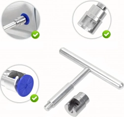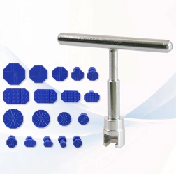 Praktičen komplet za popravila udrtin brez lakiranja (PDR) vam omogoča, da karoserijo hitro poravnate doma ali v delavnici. Kovinsko vlečno orodje z T-ročajem/drsnim kladivom zagotavlja natančno in nadzorovano silo, medtem ko 18 lepilnih vlečnih čepov različnih oblik in velikosti pokriva širok nabor vrst poškodb.