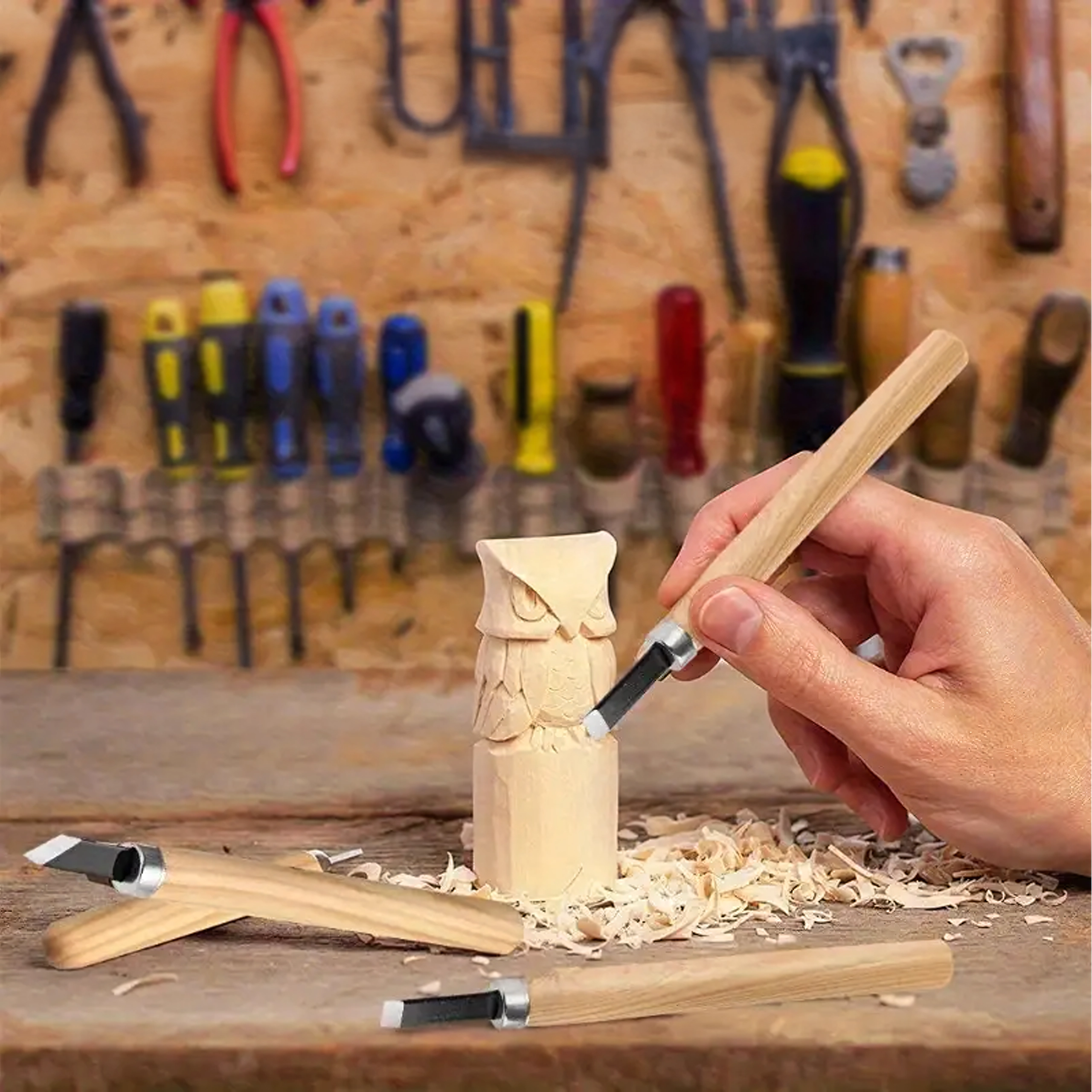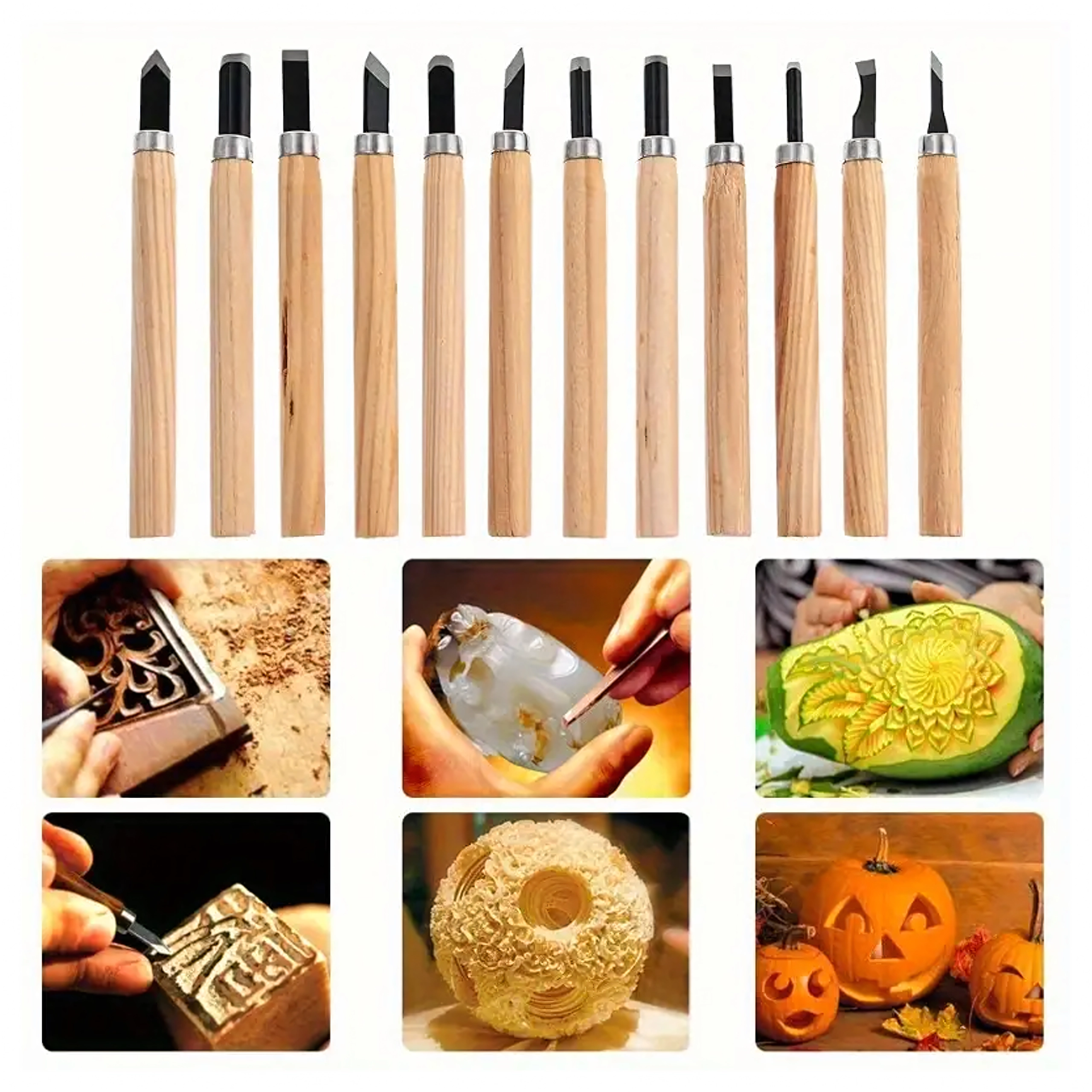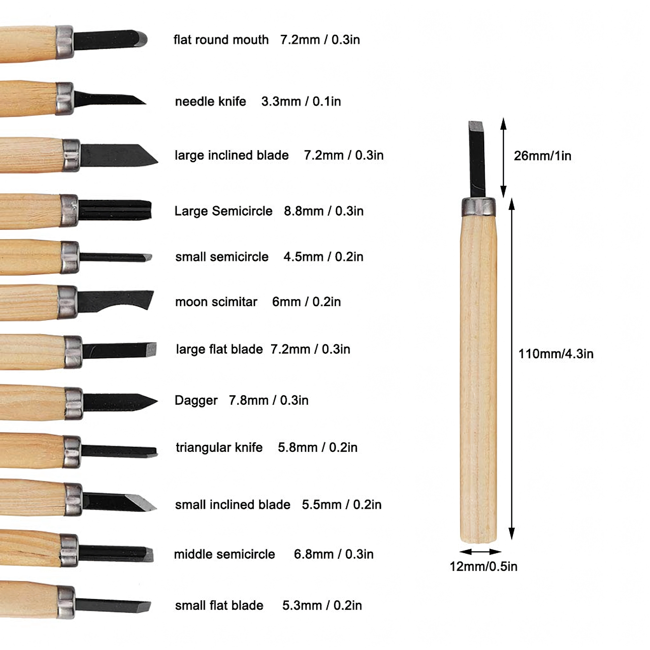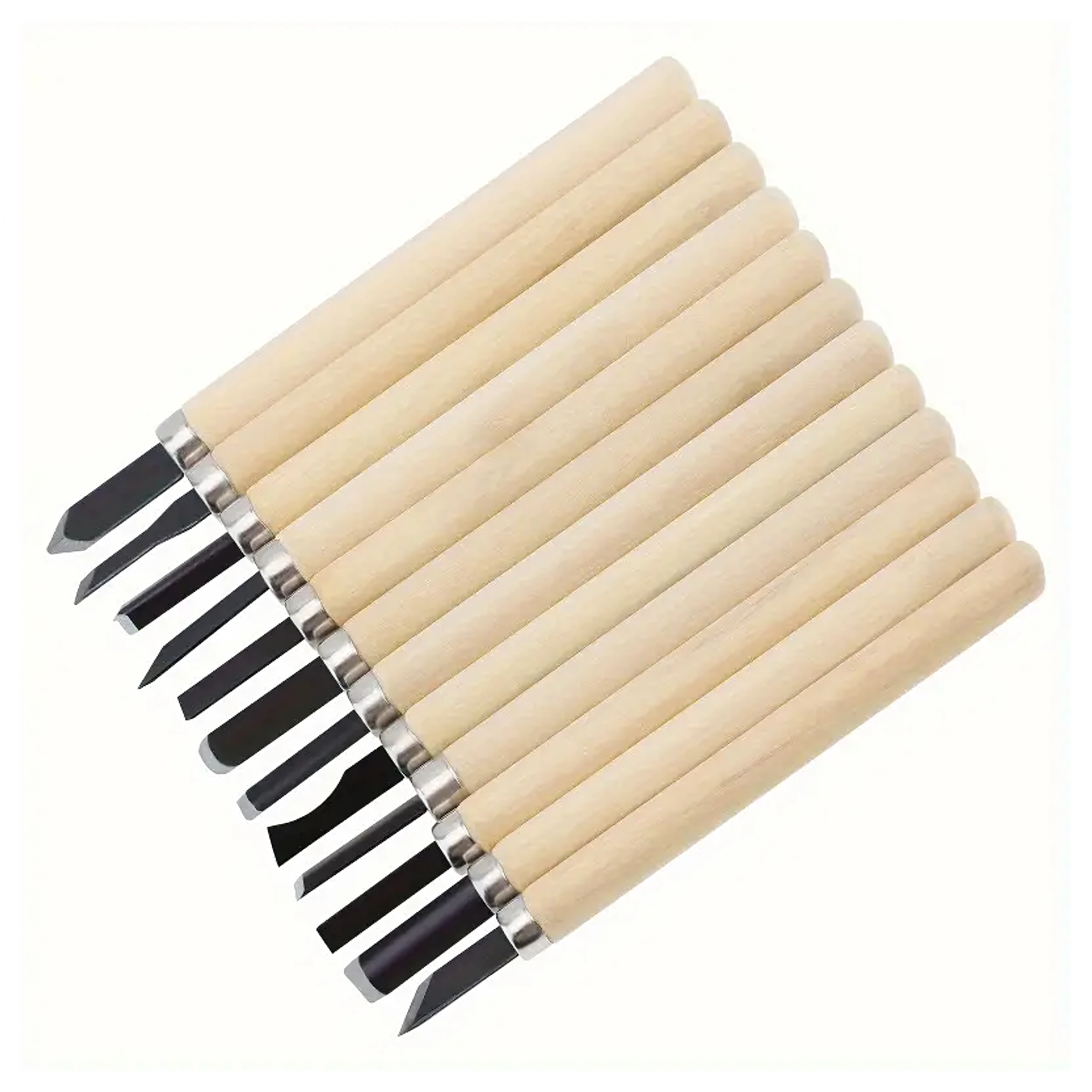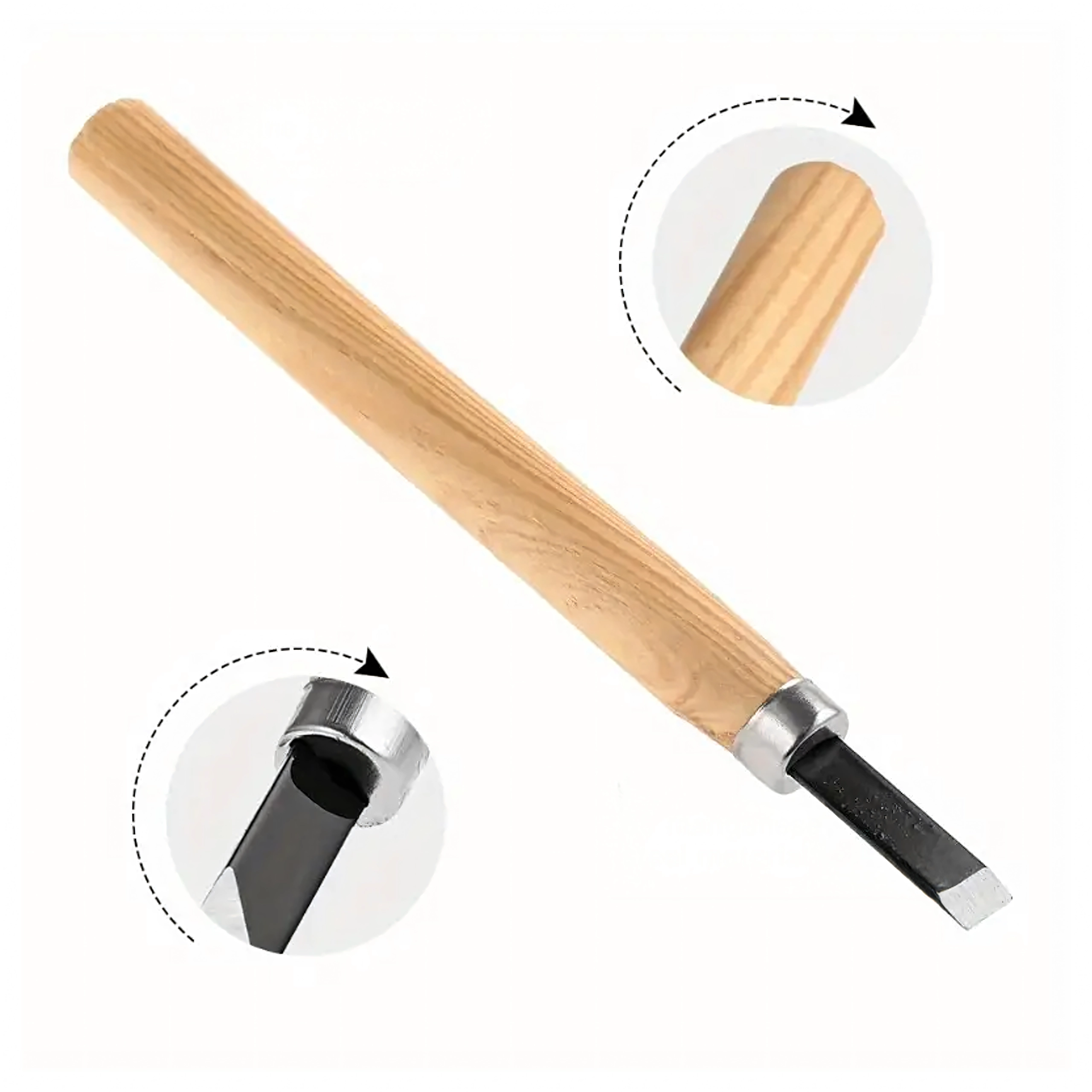 Set vključuje ravna, V in U dleta za detajle, poglobitve in ravno odstranjevanje materiala – vse, kar potrebujete za rezbarske projekte.