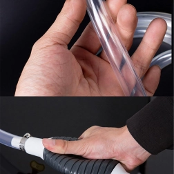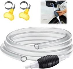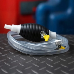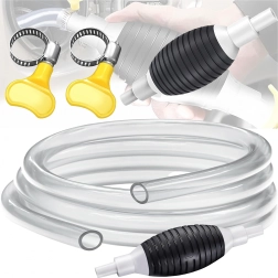 Stiskalni balonček takoj ustvari podtlak in zažene pretok brez polivanja. Prosojna cev omogoča nadzor pretoka in preprečevanje prelivanja.
