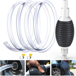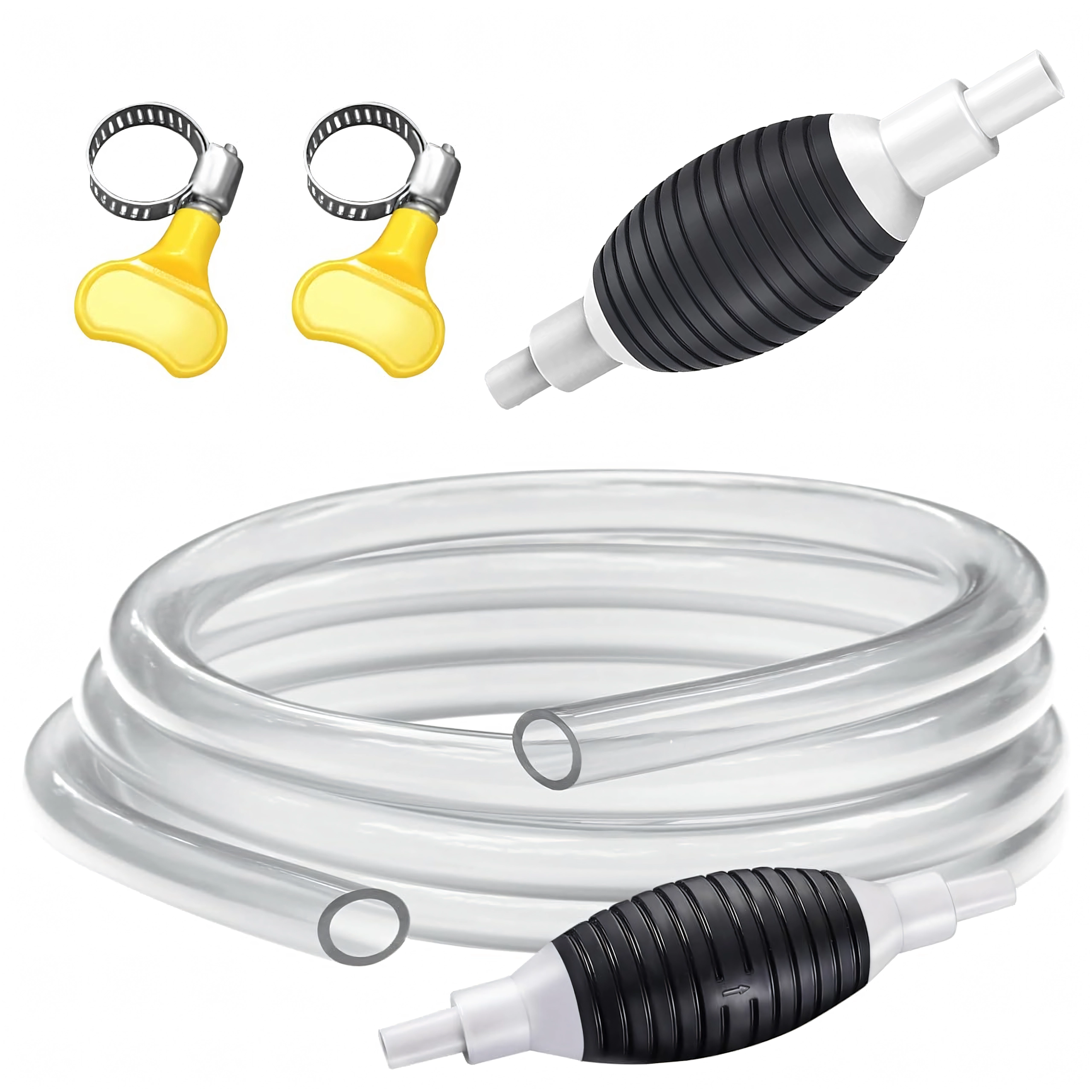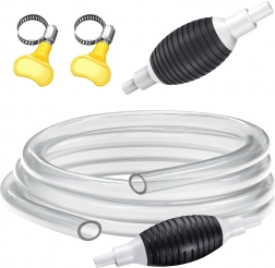 Ročna črpalka s stiskalnim balončkom in prosojno cevjo je zanesljiva rešitev za pretakanje tekočin med posodami, iz rezervoarjev ali akvarijev. Prosojna cev omogoča vizualni nadzor pretoka, medtem ko vgrajen povratni ventil preprečuje neželeno vračanje tekočine.