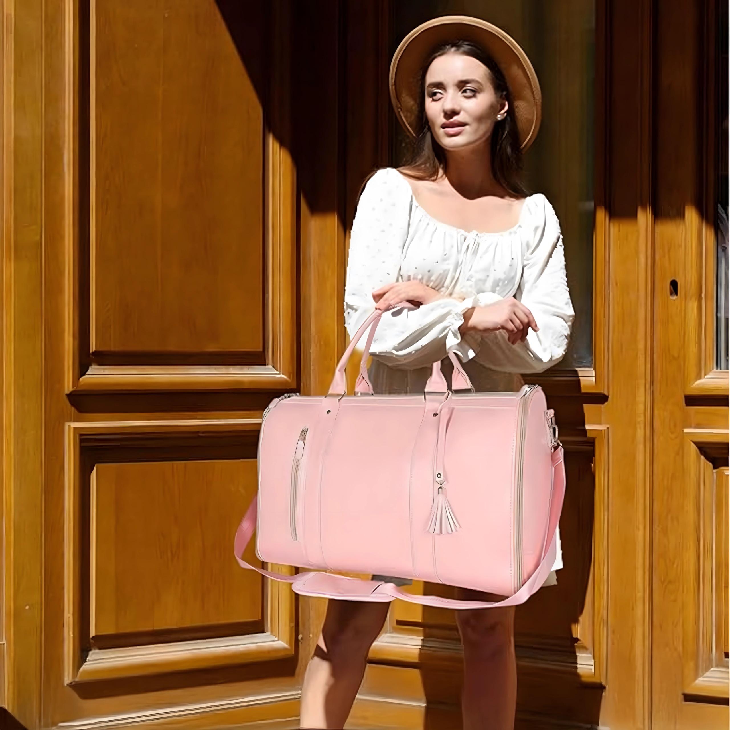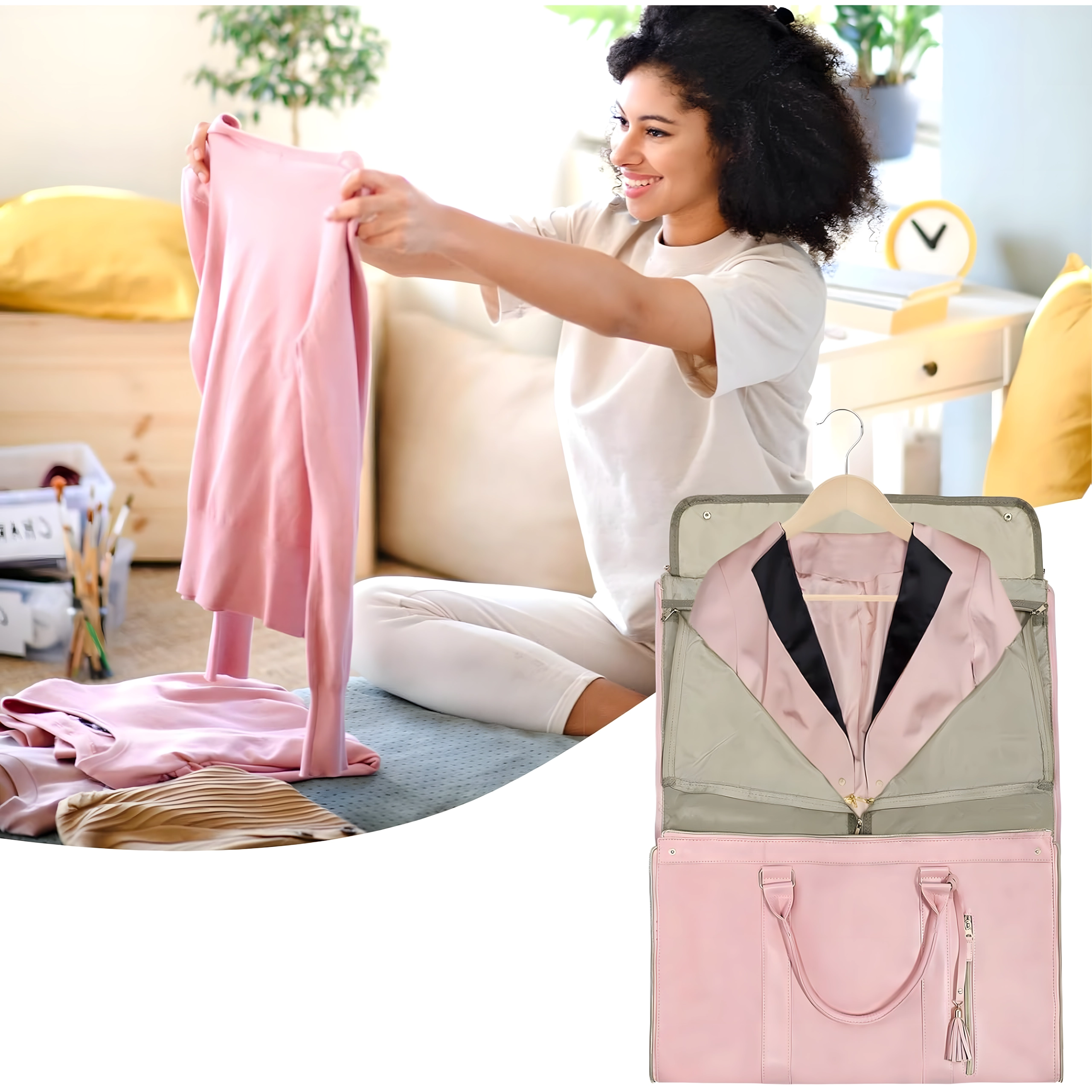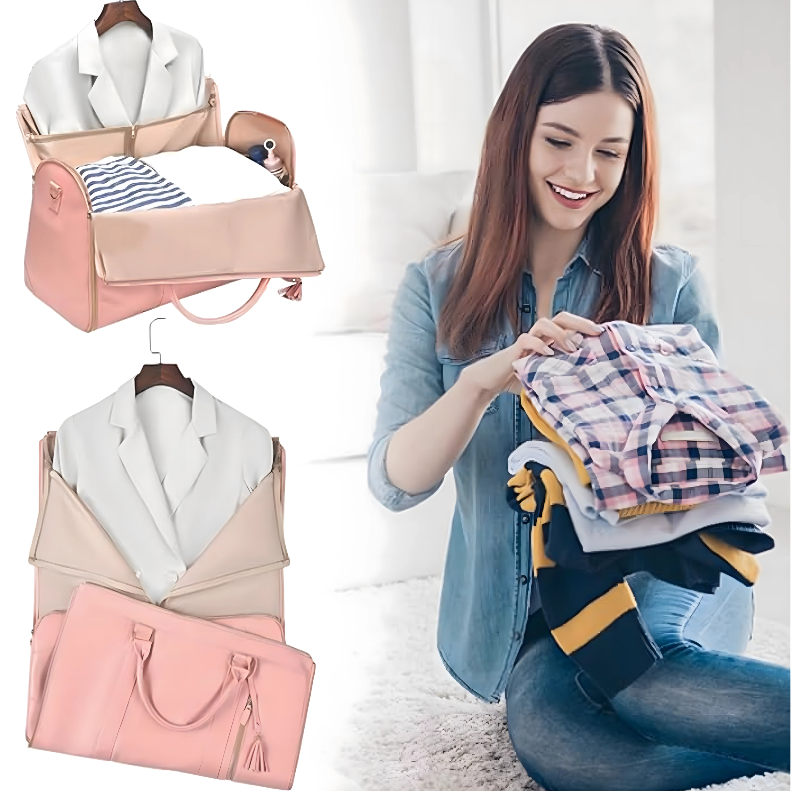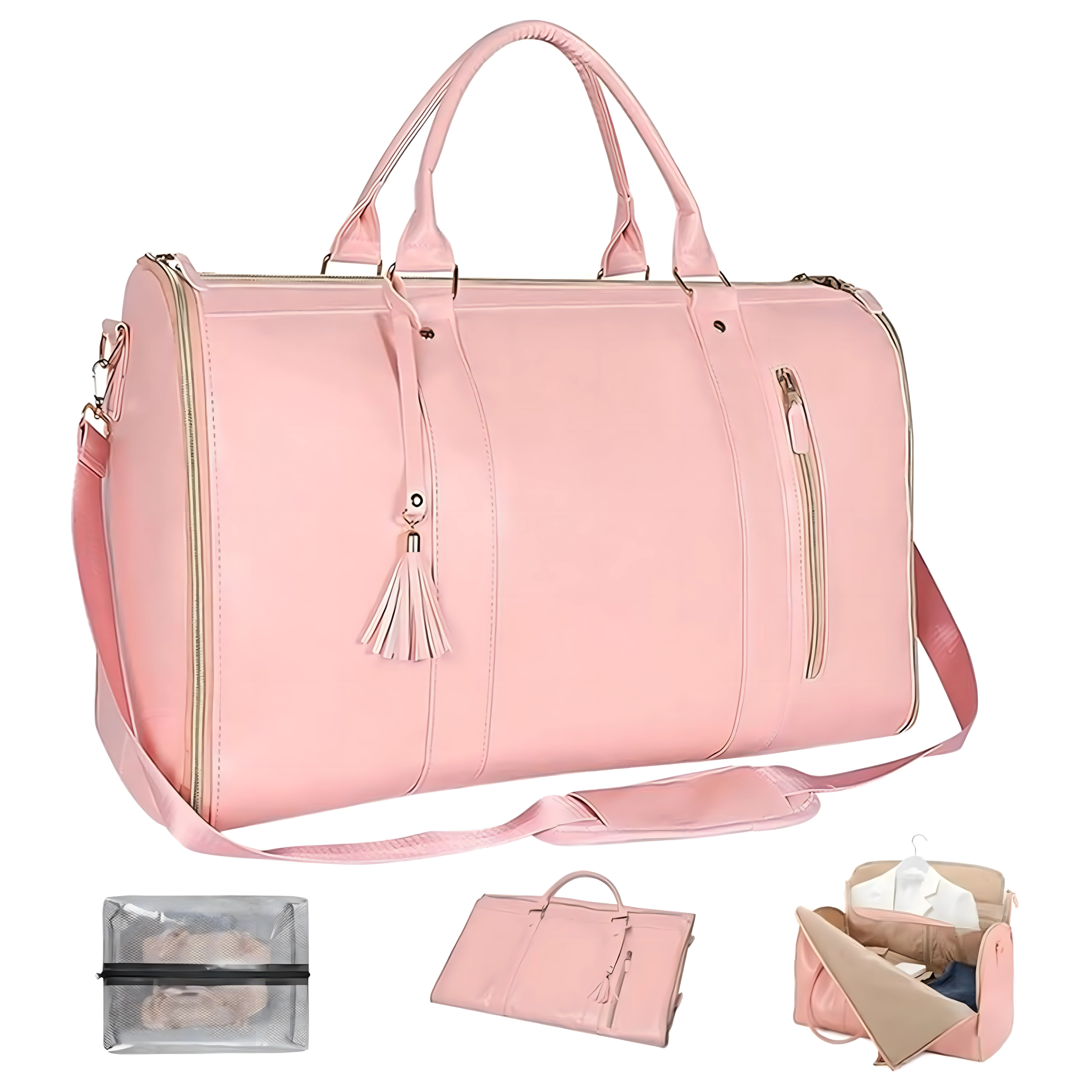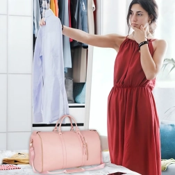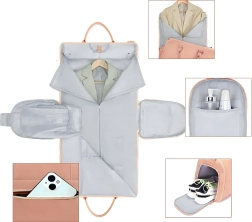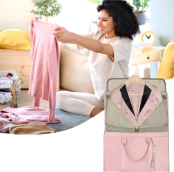 Ta elegantna potovalna torba 2v1 se razpre v praktičen ovitek za obleko, obleko ali suknjič, ki ščiti pred mečkanjem. Po zlaganju ustvari prostorno weekender/duffel torbo z pametnimi žepi za obutev, kozmetiko in drobnarije. Trpežen in vodoodporen material zagotavlja dolgo življenjsko dobo in brezskrbna potovanja.
