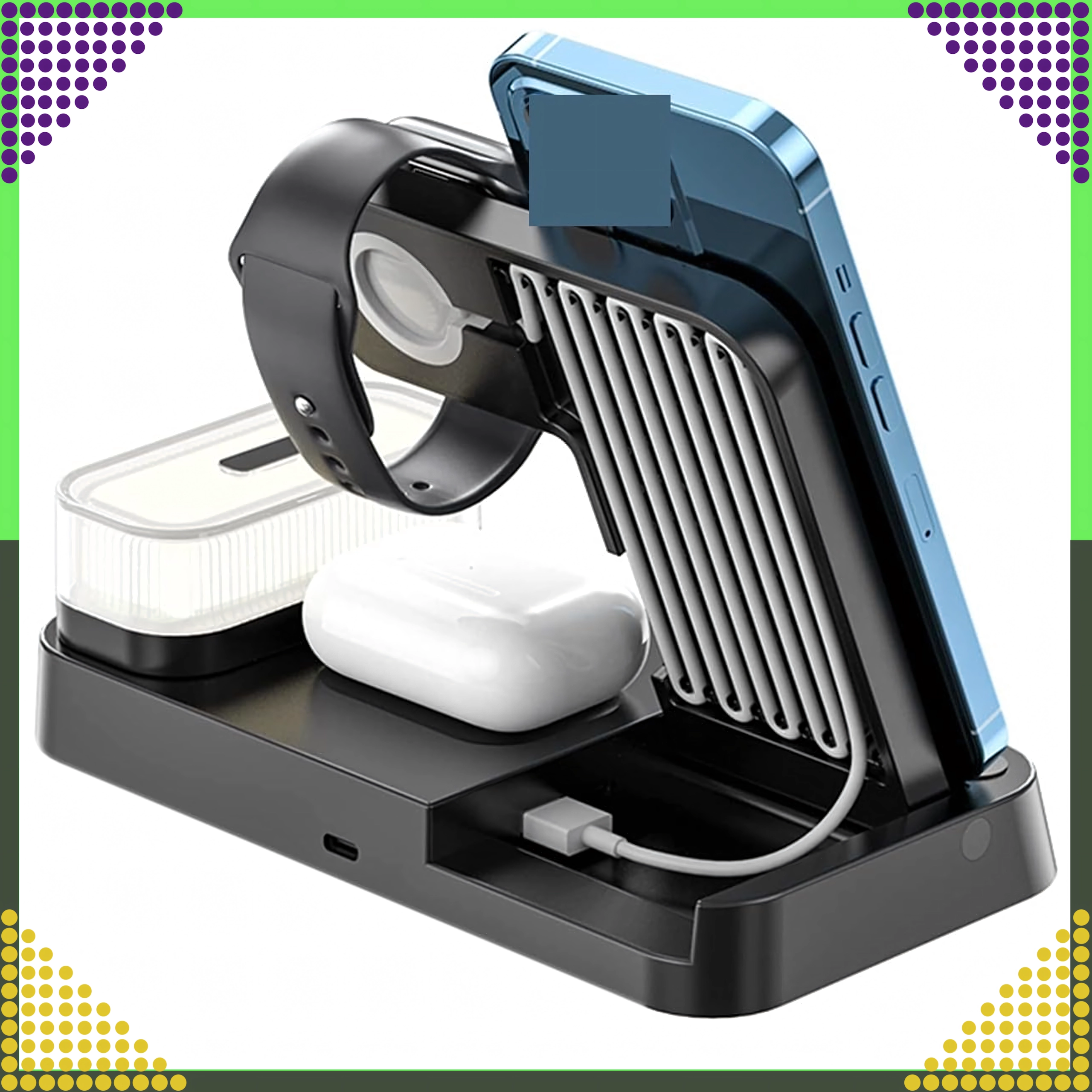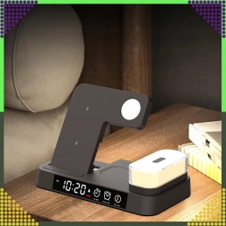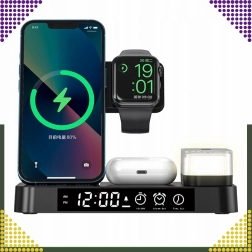 Ta sodobna brezžična polnilna postaja 4-v-1 omogoča udobno sočasno polnjenje telefona, pametne ure in brezžičnih slušalk. Podpira standard Qi do 15 W za hitro in varno polnjenje, magnetno držalo pa ohrani združljiv pametni telefon trdno v pokončnem položaju.