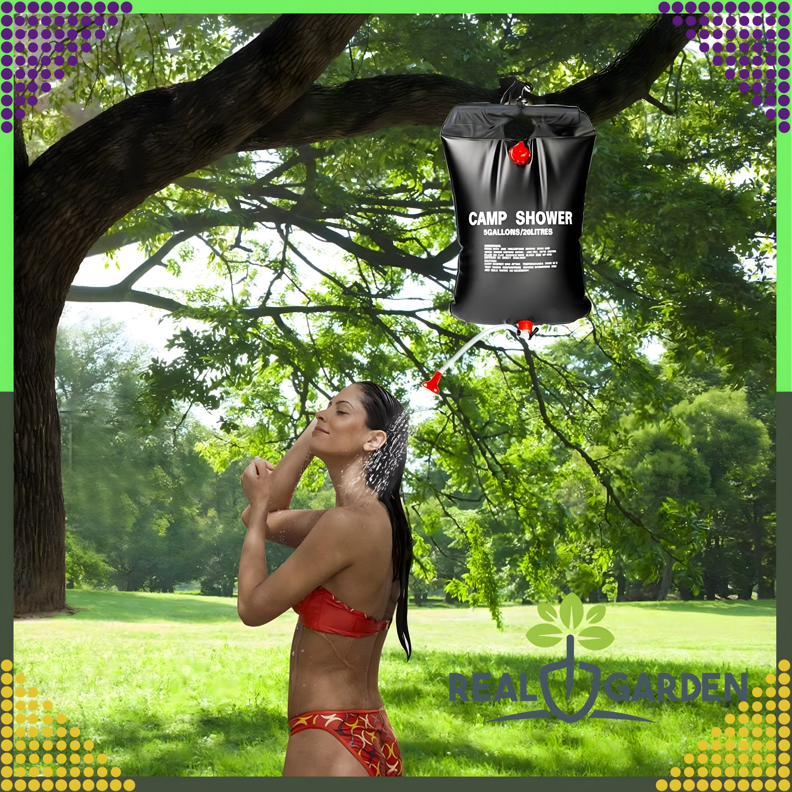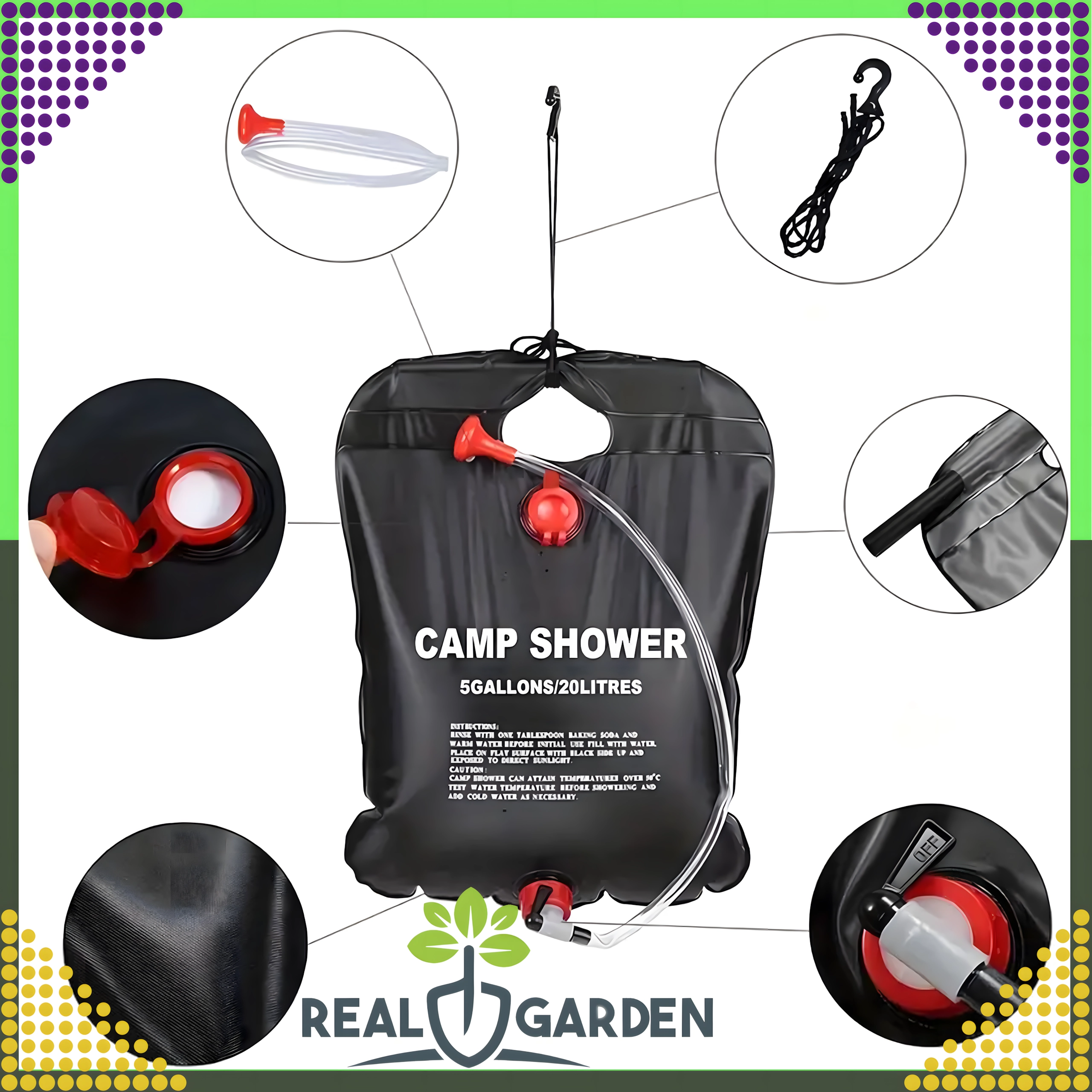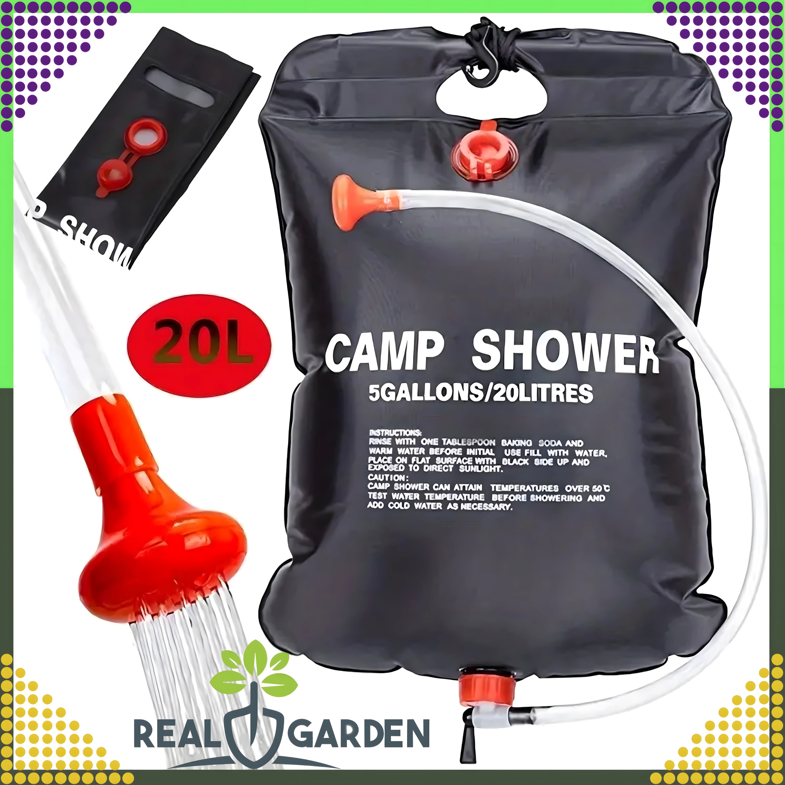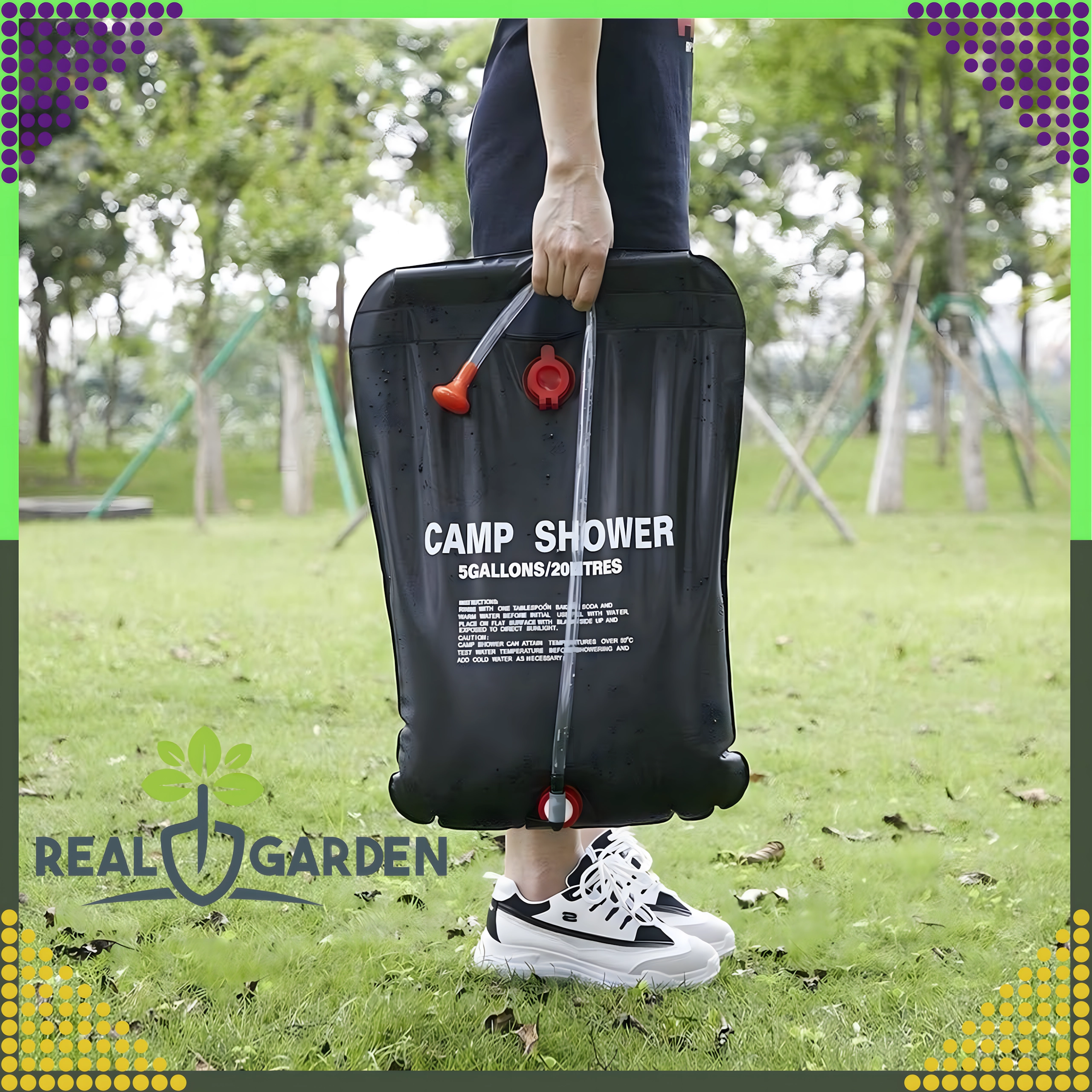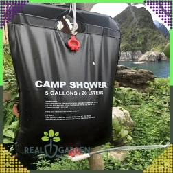 Prha je opremljena s čvrstim držalom za obešanje in praktično pršno glavo, kar zagotavlja udobno uporabo v kampu, ob vodi ali na vrtu.