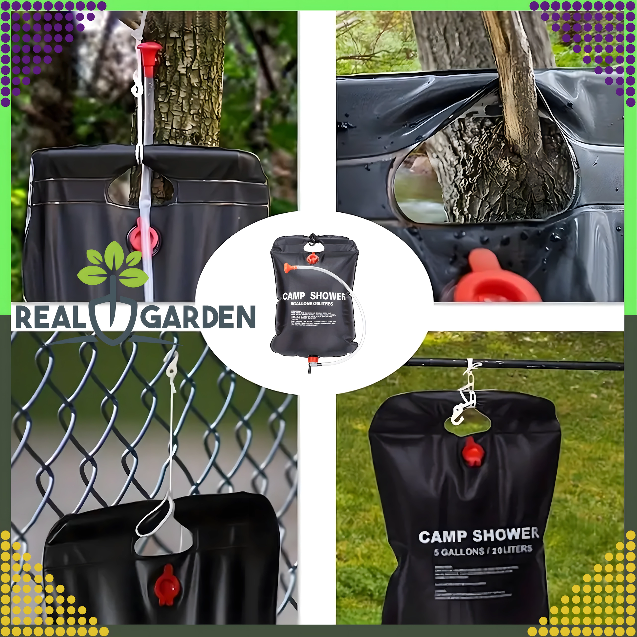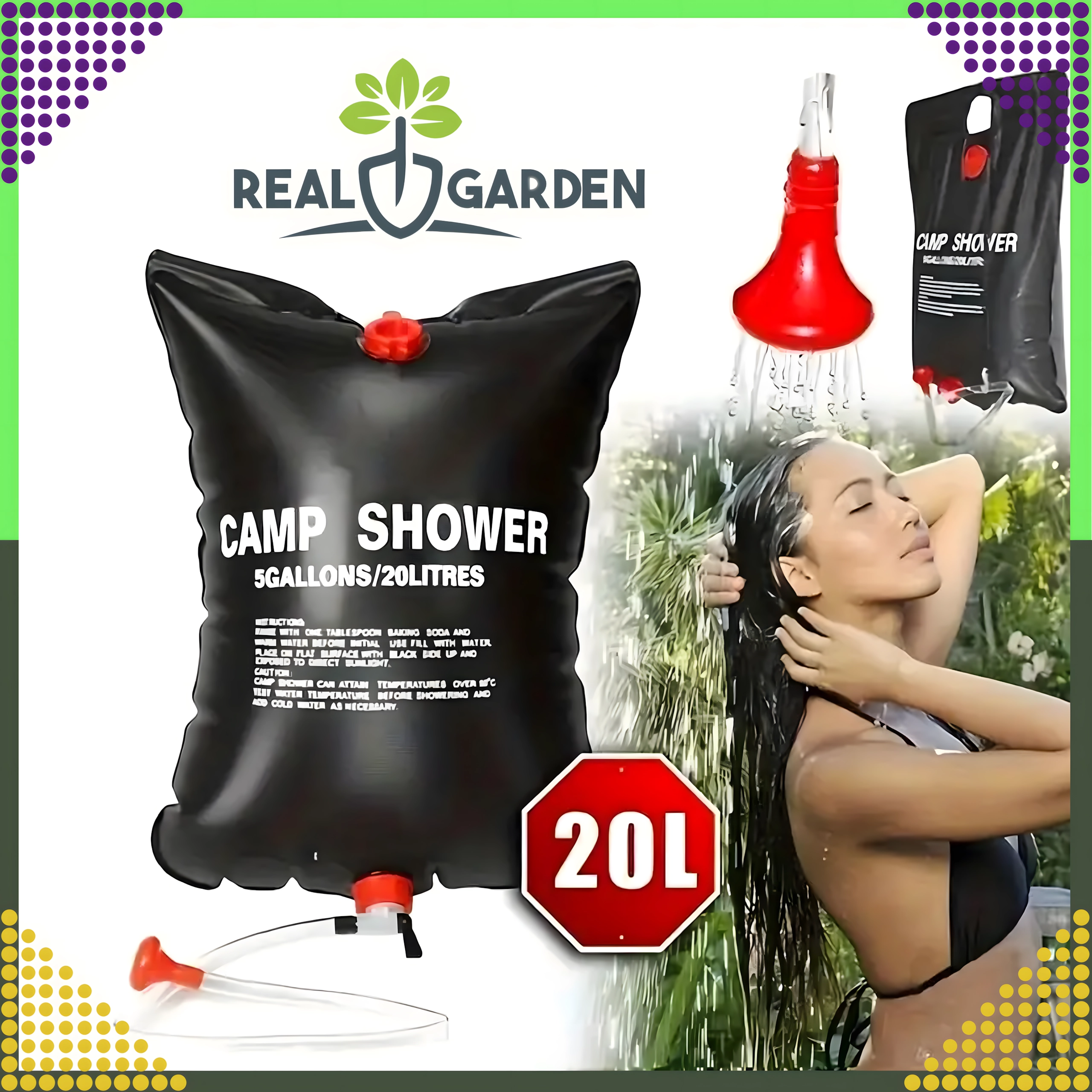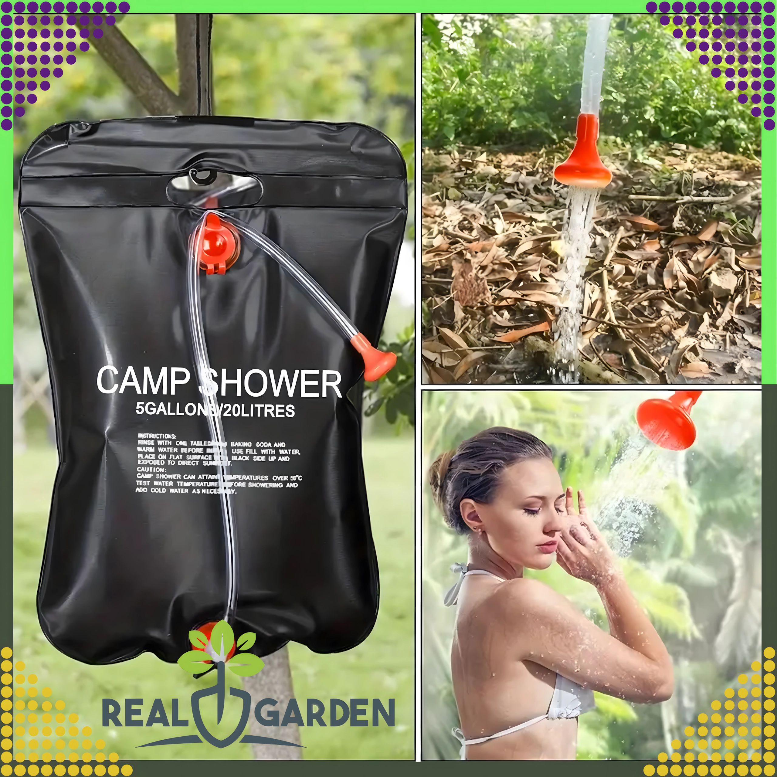 Prha je opremljena s čvrstim držalom za obešanje in praktično pršno glavo, kar zagotavlja udobno uporabo v kampu, ob vodi ali na vrtu.