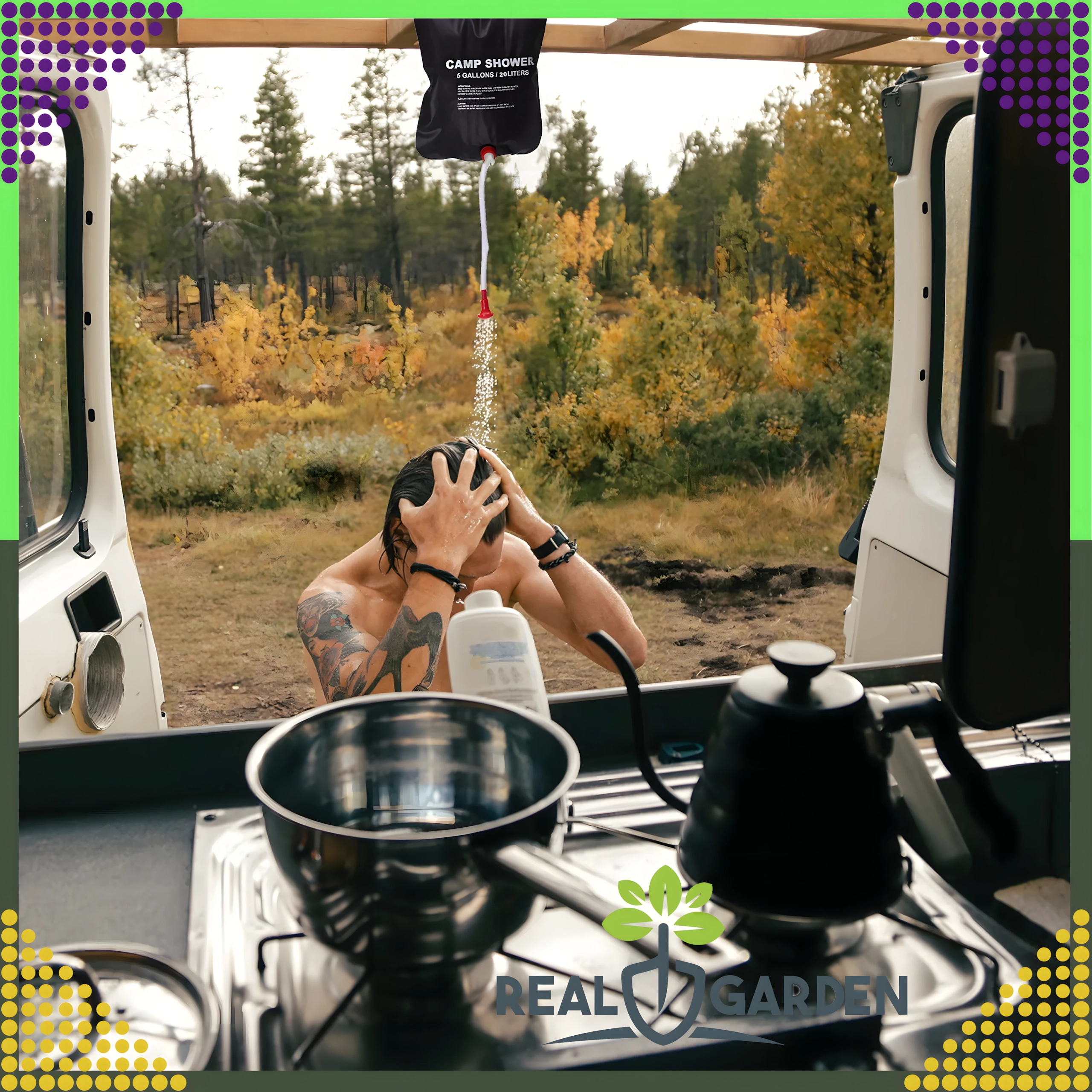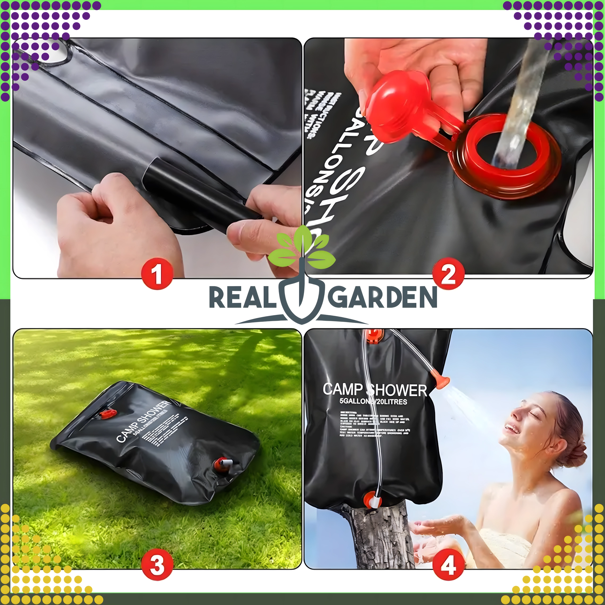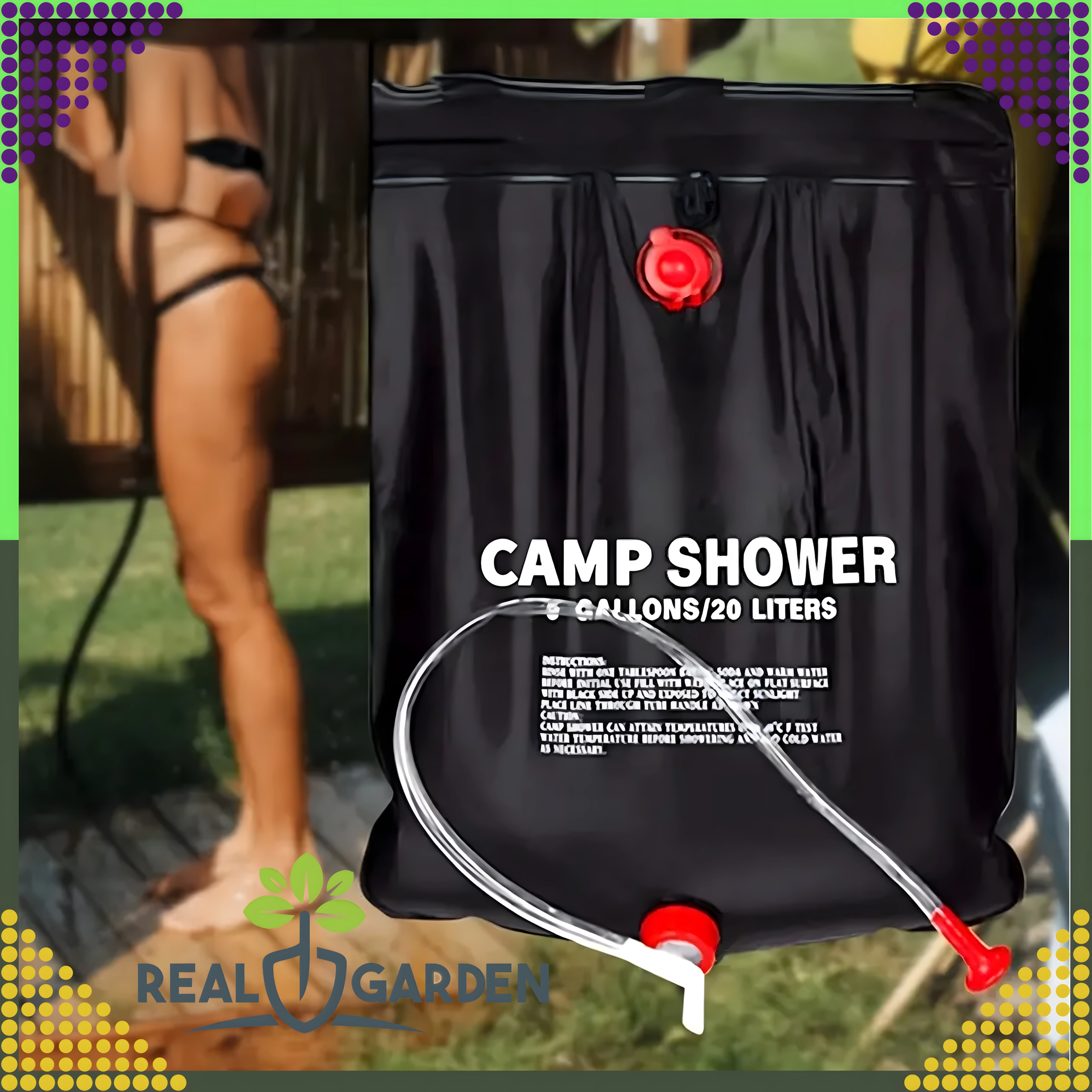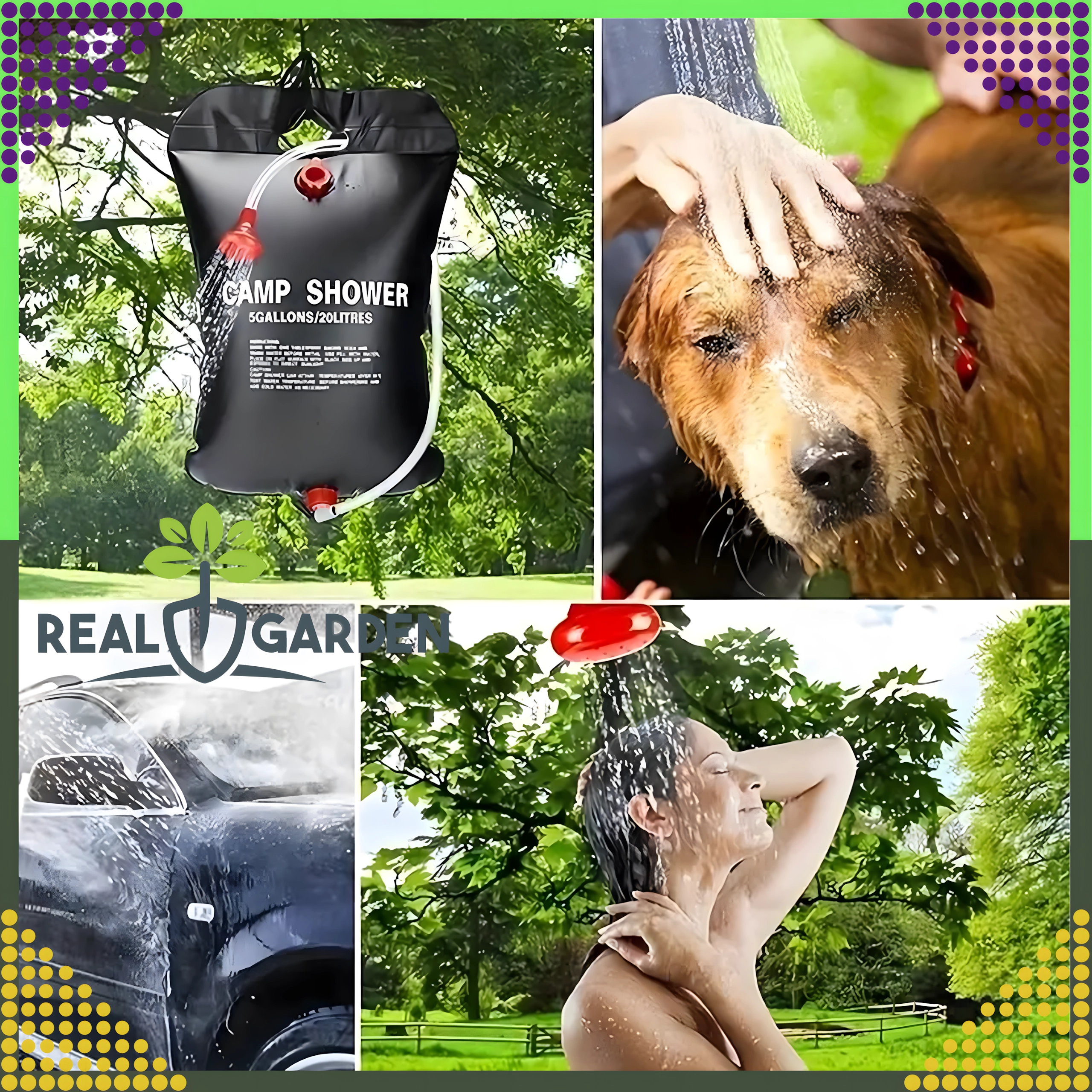 Prha je opremljena s čvrstim držalom za obešanje in praktično pršno glavo, kar zagotavlja udobno uporabo v kampu, ob vodi ali na vrtu.