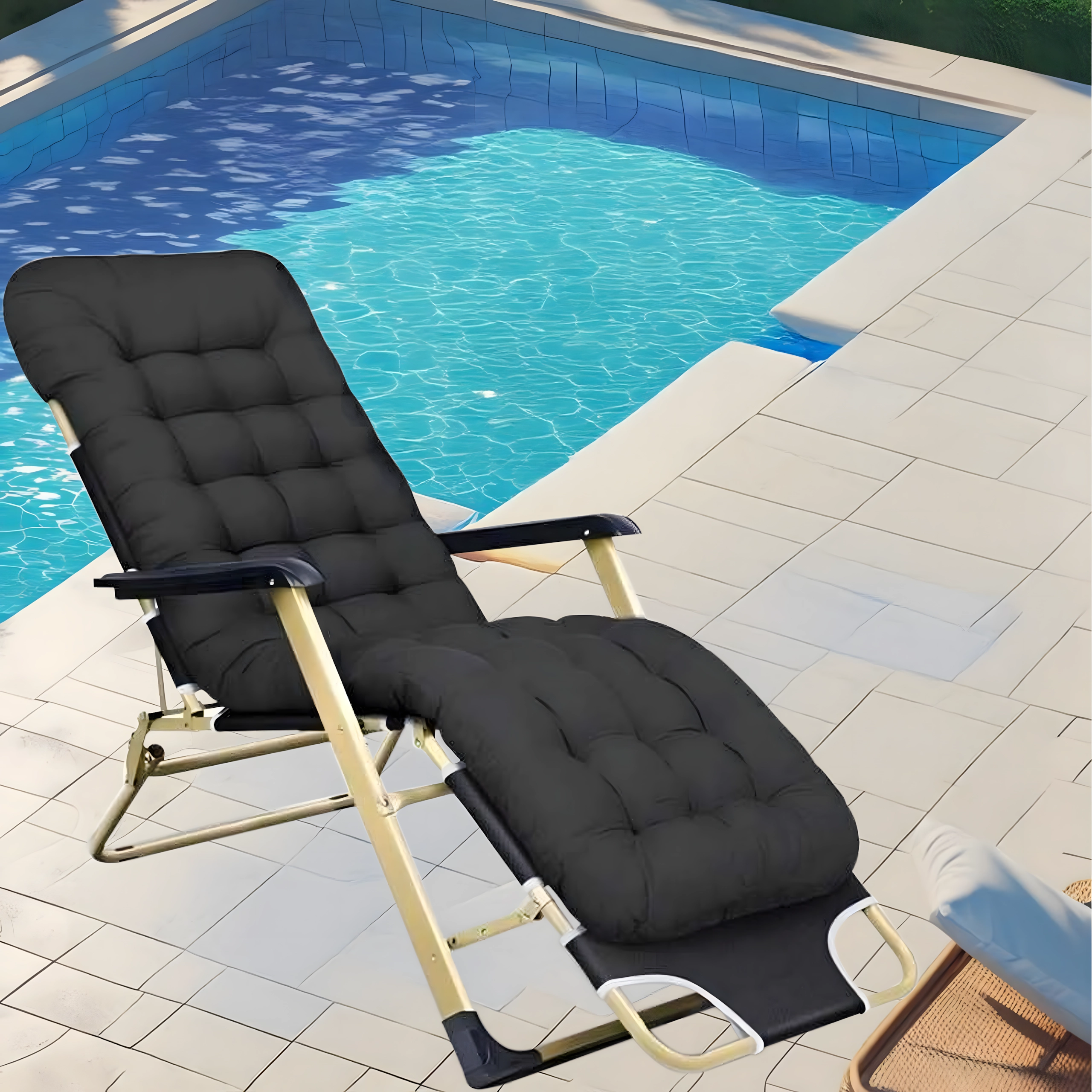 Mehko in prešito oblazinjenje z vzglavnikom zagotavlja udobje pri branju, počitku in spanju – idealno za daljšo sprostitev na prostem ali doma.