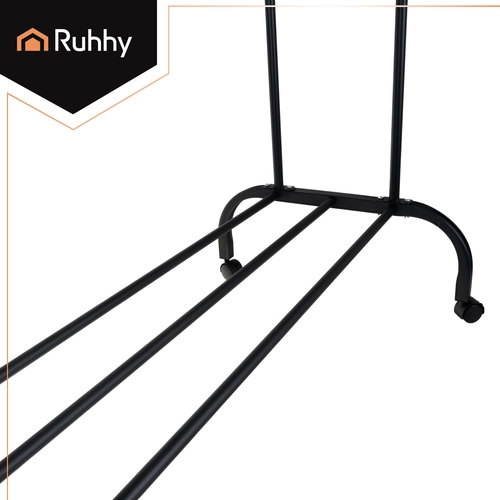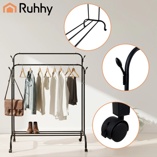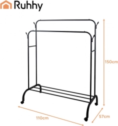 Iščete praktično in prostorsko varčno rešitev za oblačila, čevlje in dodatke? Stojalo RUHHY z dvema palicama nudi dovolj prostora za srajce, plašče in obleke brez mečkanja. Vrtljiva kolesa s 360° delovanjem in zavoro omogočajo enostavno premikanje in zanesljivo stabilnost, medtem ko spodnja polica prenese več parov čevljev ali shranjevalne škatle.