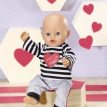 Stilna kompletna oprava za punčke Dolly Moda prinaša udobje in šarm za vsakodnevno igro. Zahvaljujoč univerzalnemu kroju odlično pristaja punčkam velikosti 39–46 cm, vključno z BABY born in Baby Annabell. Set vsebuje črtasto jopico z dolgimi rokavi in velikim rdečim srcem ter udobne sive trenirke s kontrastnimi patenti in rdečimi stranskimi črtami. Univerzalna velikost, kakovostna izdelava in spodbuda ustvarjalnosti ter igre vlog naredijo ta komplet odličen dodatek za vsako punčko.