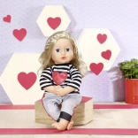 Oblačila Dolly Moda so zasnovana tako, da jih je mogoče preprosto kombinirati in izmenjevati med različnimi punčkami. Ta črtasta trenirka z jopico in hlačami je idealna za udobno domačo igro in tudi za stilne izlete punčk. Izrazito srce na črno-belih črtah ter diskretne sive hlače s kontrastnimi detajli dajo opravi moderen videz.