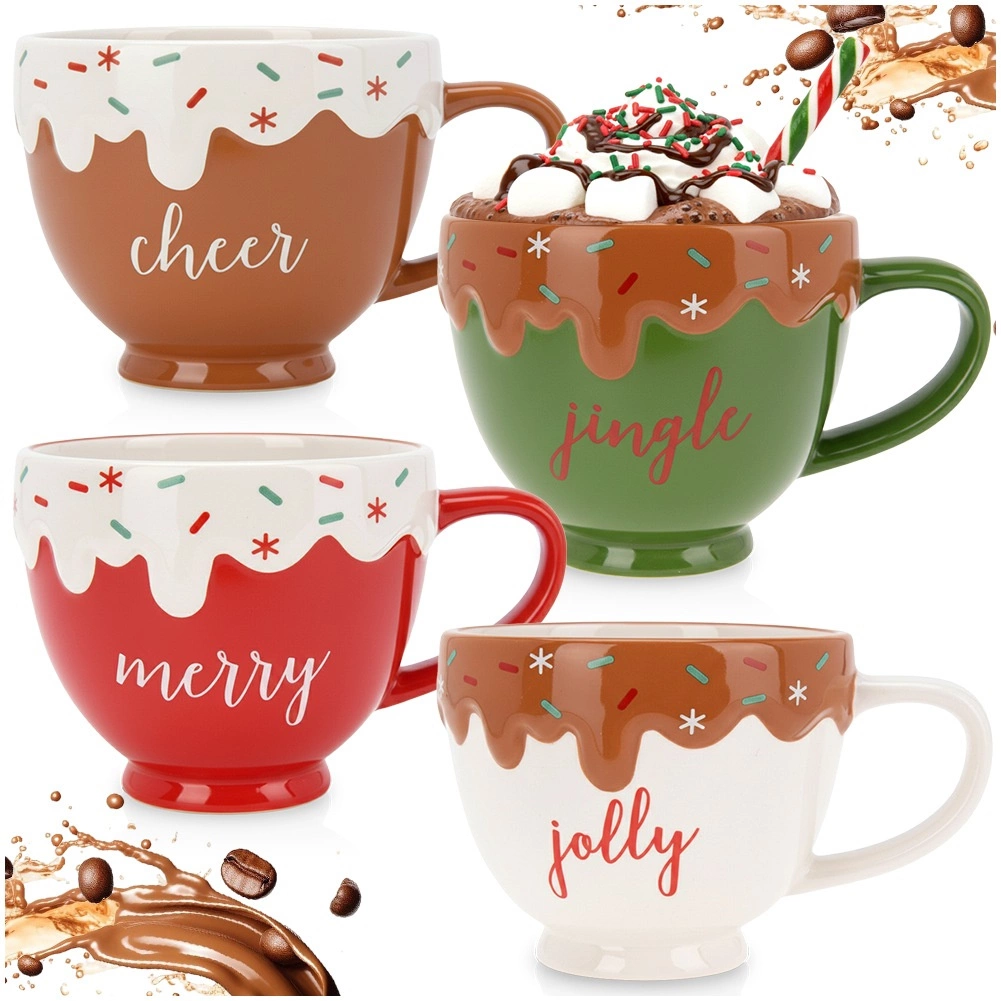 Ta set štirih prazničnih skodelic bo v vašo kuhinjo vnesel veselo božično vzdušje. Vsako skodelico krasi učinek “kapljajoče glazure” z barvnim posipom in vesel napis, zaradi česar so ne le praktičen, temveč tudi dekorativen dodatek.
