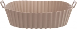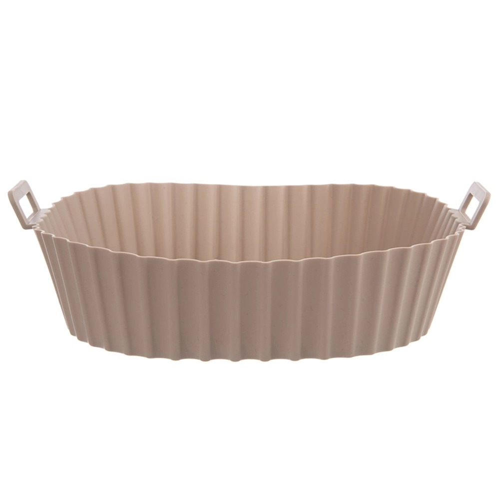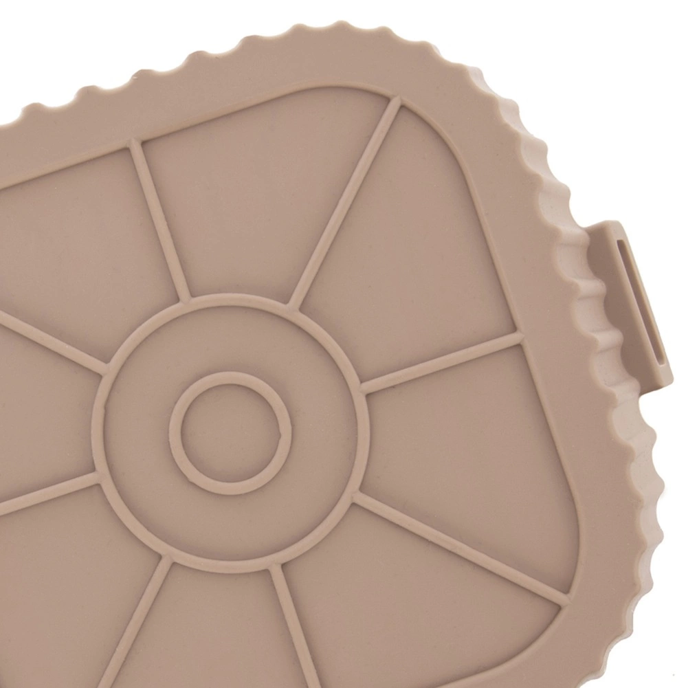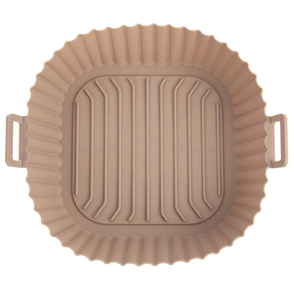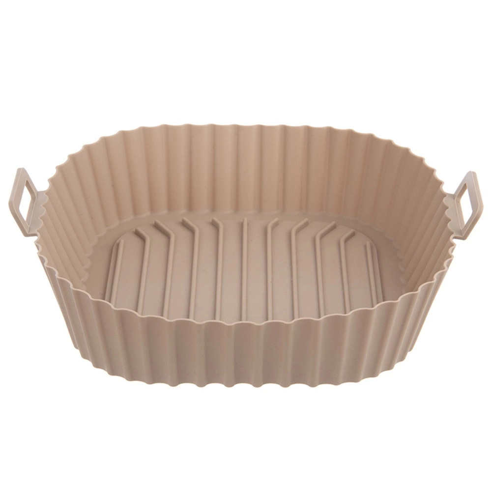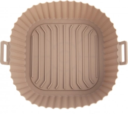 Bež silikonska vložna košara za Air Fryer z merami 22 × 22 × 7 cm (dno 18 × 18 cm) ščiti notranjost cvrtnika pred ostanki hrane in poenostavlja vzdrževanje. Neprijemljiva površina preprečuje prijemanje, z integriranimi ročaji pa se vložek enostavno vstavi in odstrani.