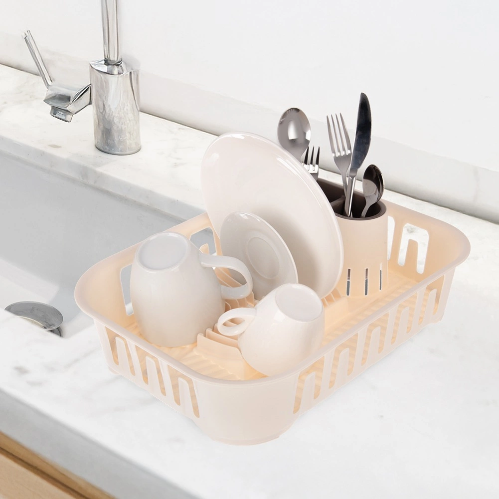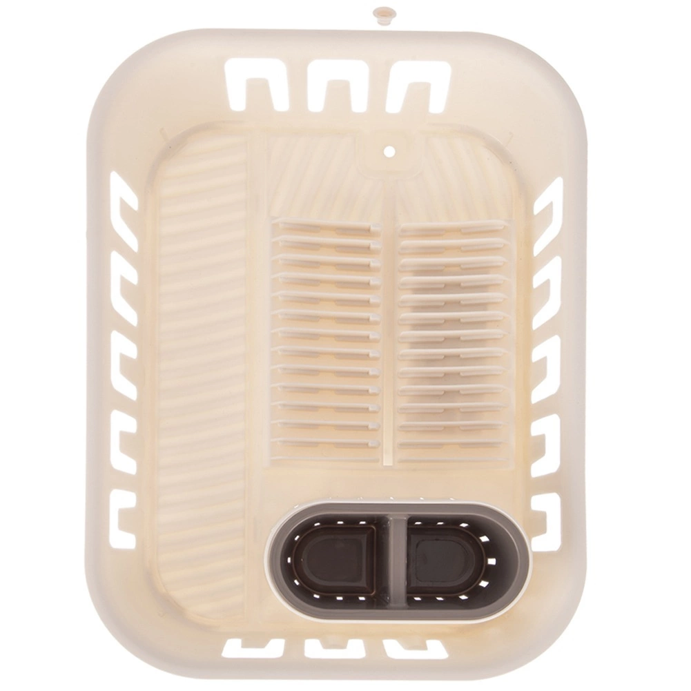 Ohranite kuhinjsko korito in delovni pult suha in urejena. Ta kompaktni odcejalnik v kremni barvi ponuja premišljeno razporeditev prostora za krožnike, skodelice in pribor. Zahvaljujoč integriranemu izpustu z zamaškom voda odteka neposredno v korito, zato ne potrebujete dodatnega pladnja, pult pa ostane zaščiten.