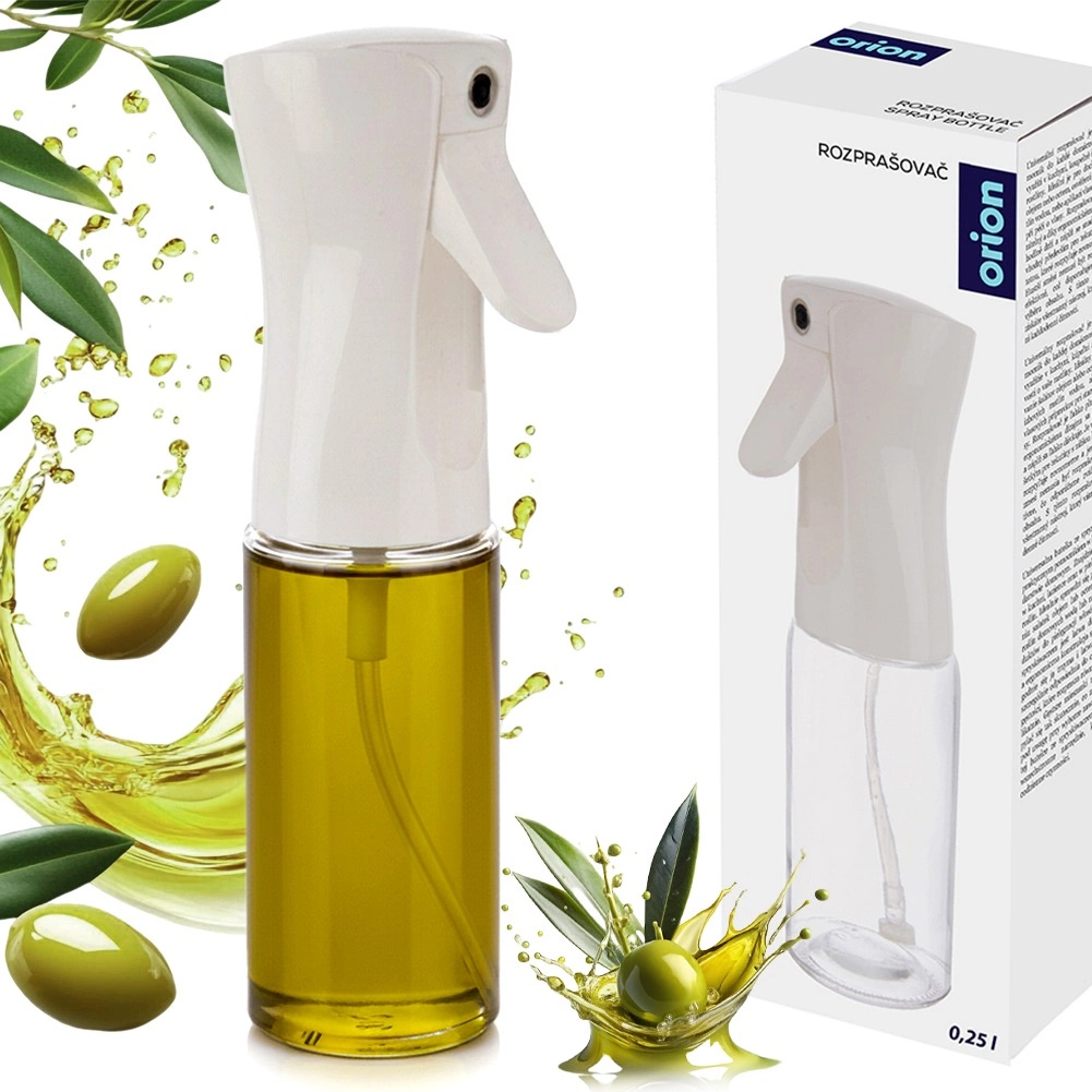 Praktičen steklen razpršilnik s prostornino 250 ml za enakomerno doziranje olja, kisa in drugih tekočih začimb. Zahvaljujoč nežni meglici zagotovi natančen nanos, varčno porabo sestavin in čisto delo v kuhinji. Prosojna posoda omogoča nadzor nad vsebino, ergonomski sprožilec pa zagotavlja udobno uporabo in enostavno čiščenje.