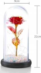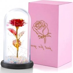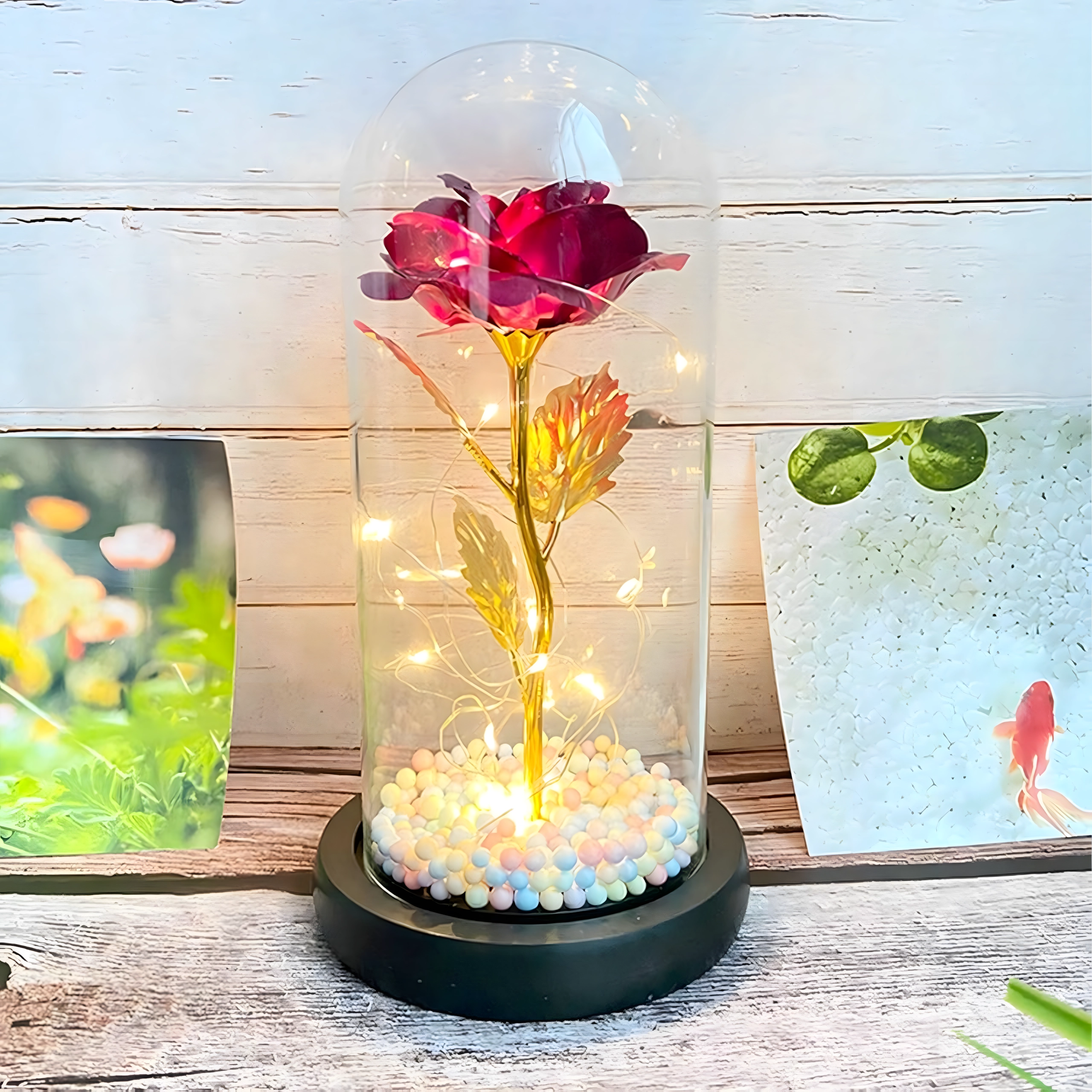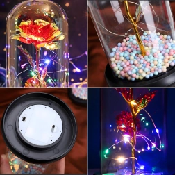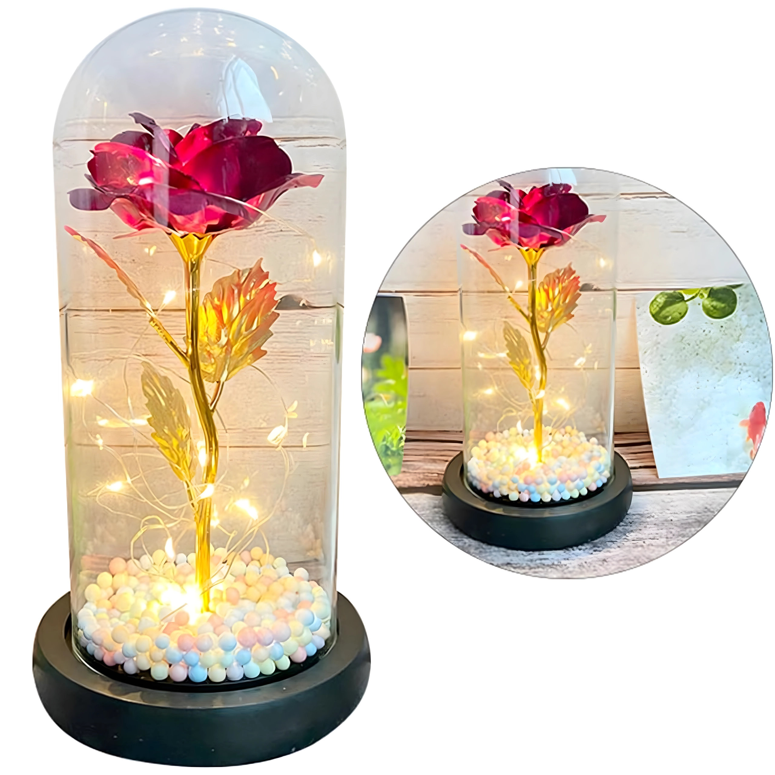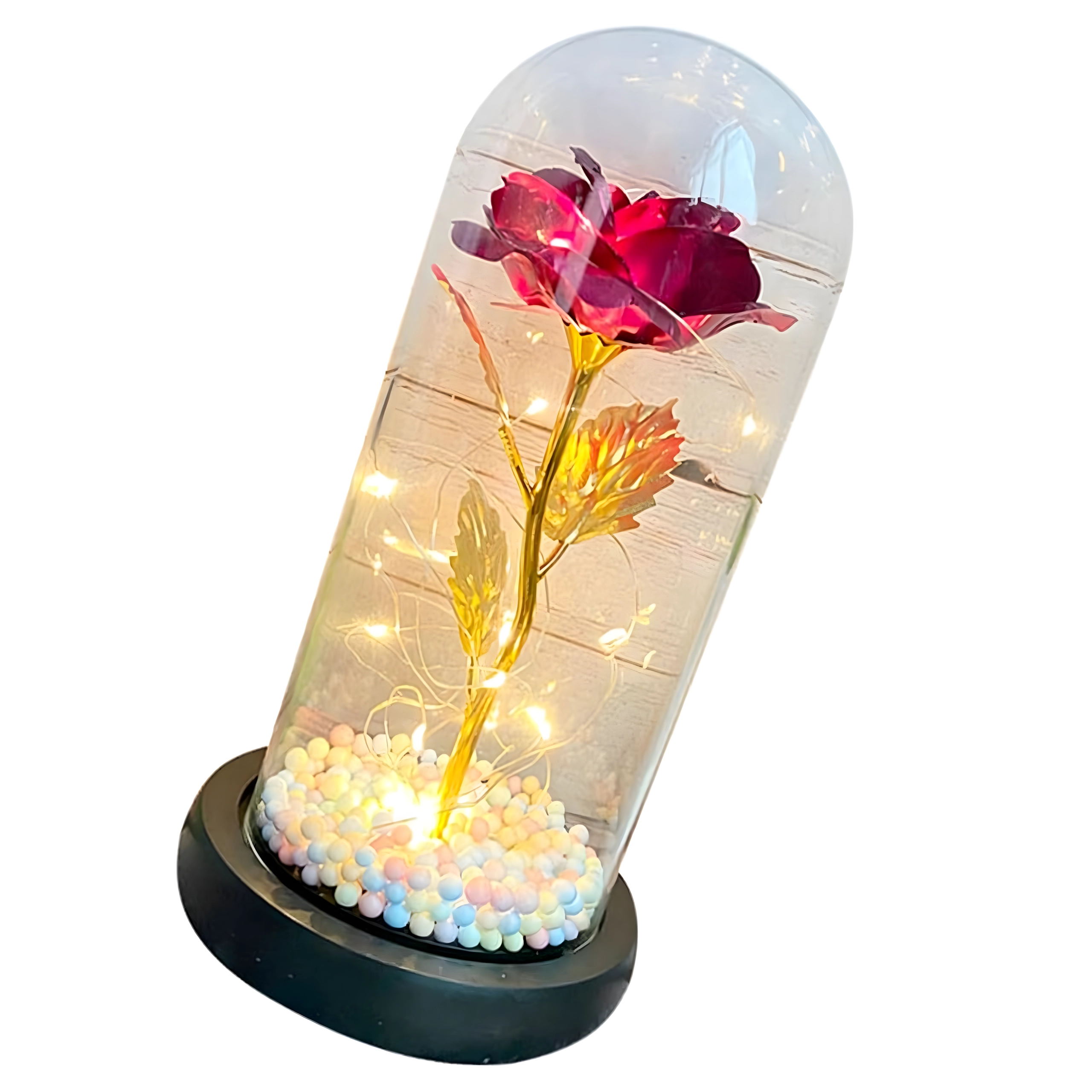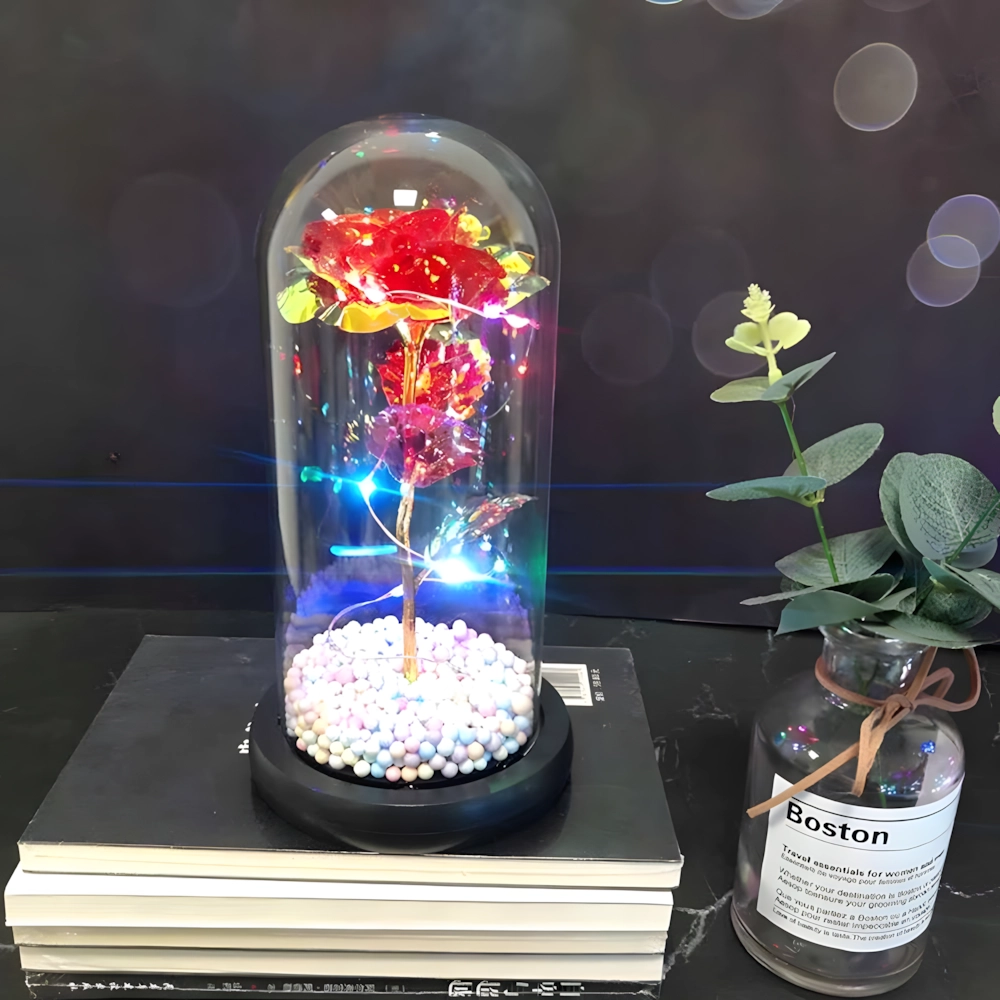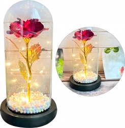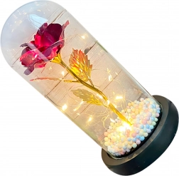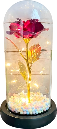 Očarljiva dekoracija, ki združuje lepoto vrtnice in toplo svetlobo. Stekleni klos ščiti cvet pred prahom, medtem ko LED veriga ustvarja nežne odseve na zlatem steblu in listih. Barvne/pastelne perlice v podstavku dodajajo mehak, igriv poudarek.
