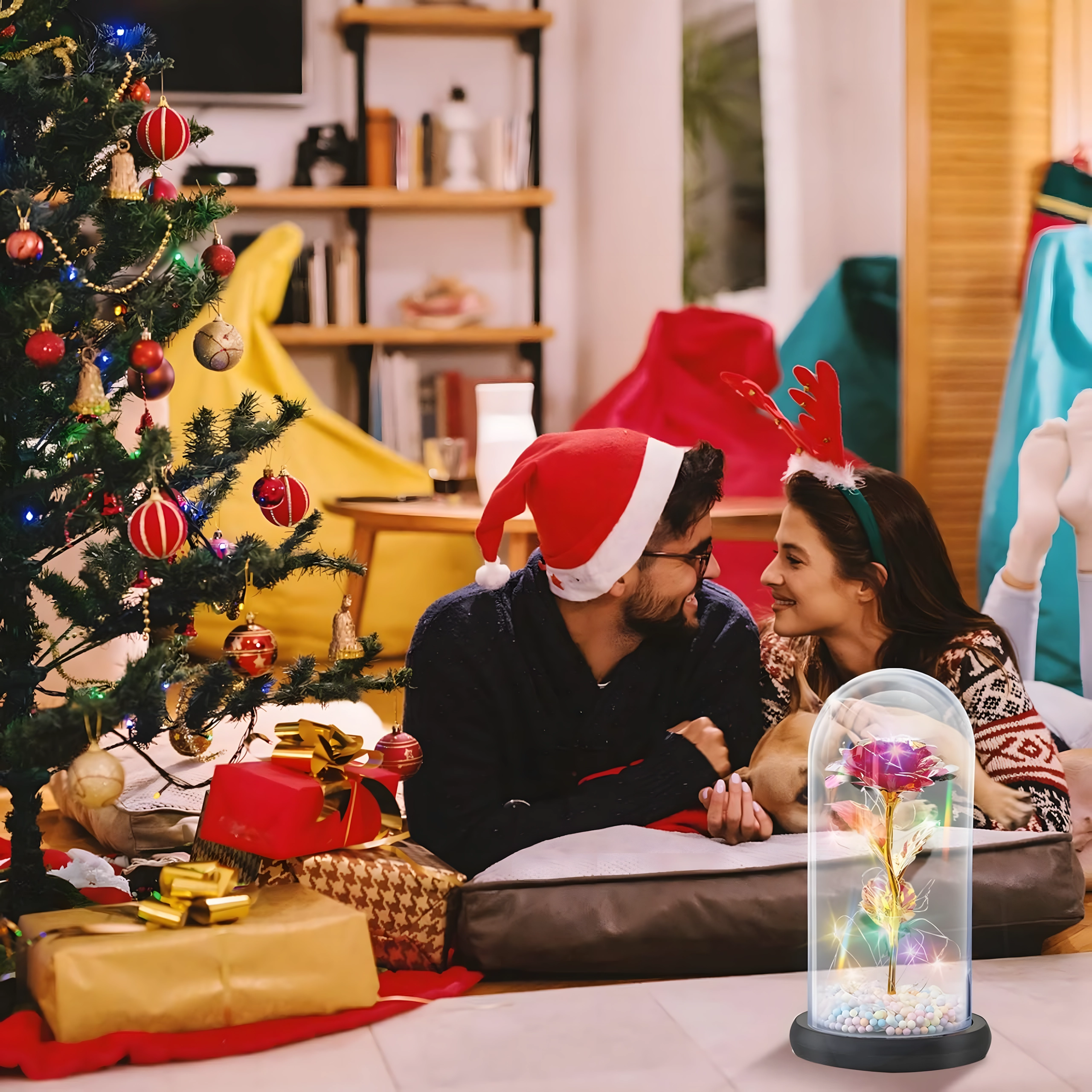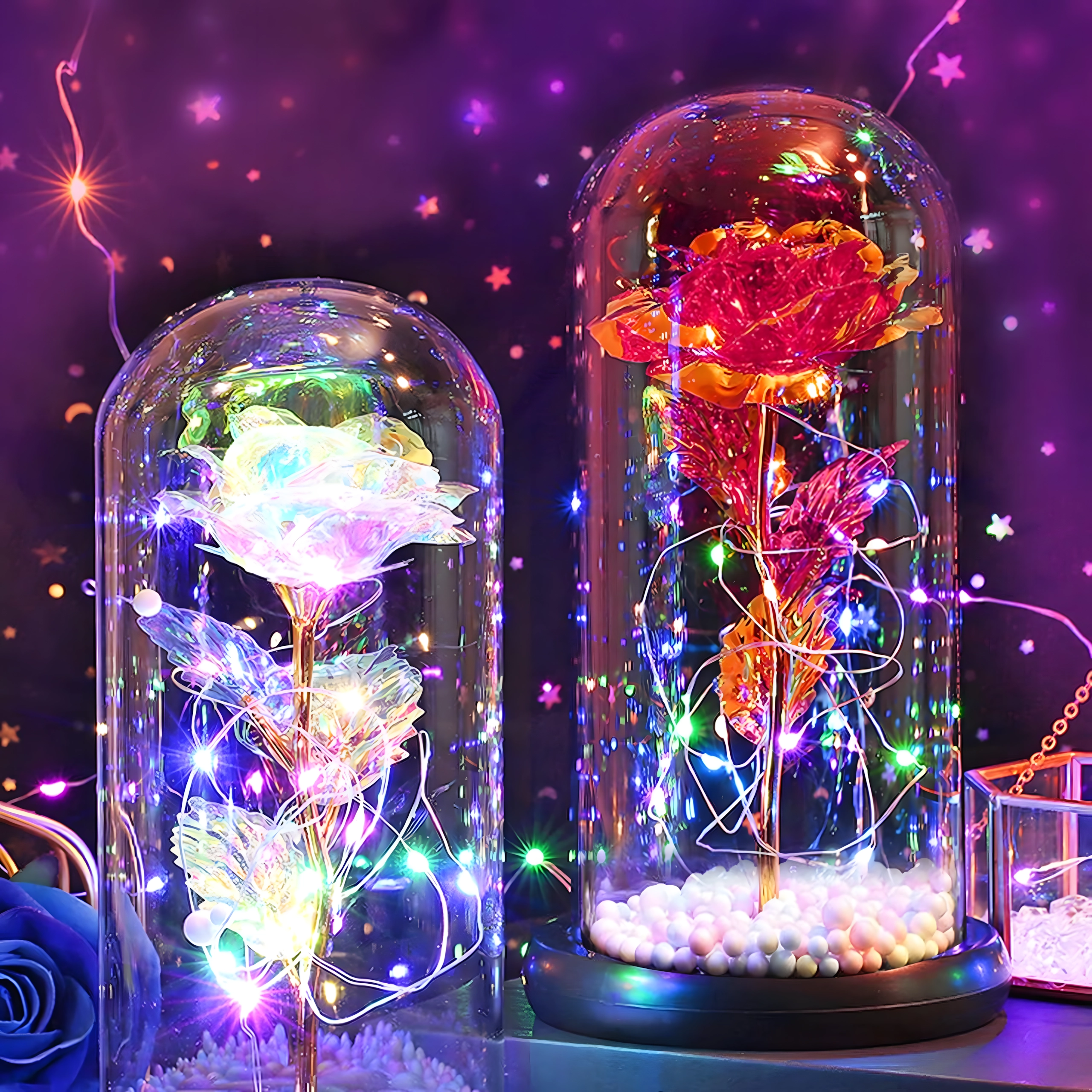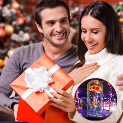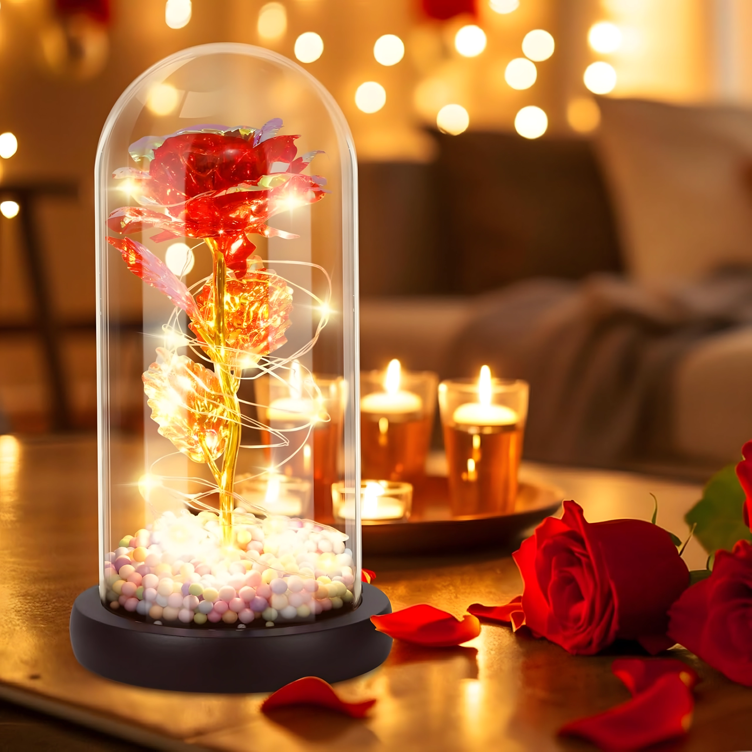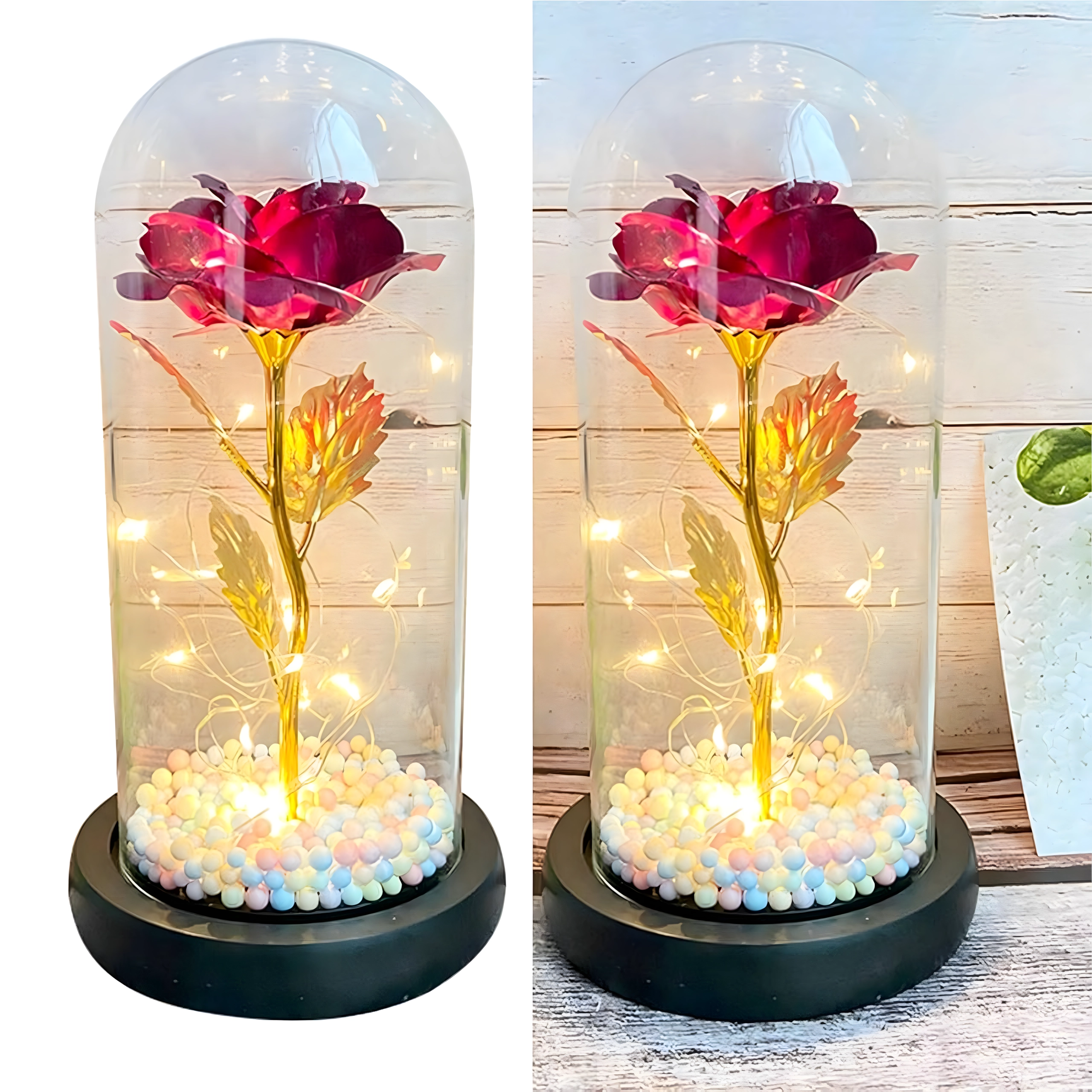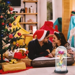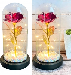 Očarljiva dekoracija, ki združuje lepoto vrtnice in toplo svetlobo. Stekleni klos ščiti cvet pred prahom, medtem ko LED veriga ustvarja nežne odseve na zlatem steblu in listih. Barvne/pastelne perlice v podstavku dodajajo mehak, igriv poudarek.