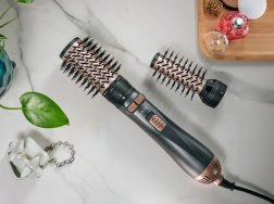 Natančno nastavite, kar potrebujete: 2 stopnji hitrosti, 3 ravni temperature in funkcija hladnega zraka za fiksiranje oblike. Mešane ščetine nežno zajamejo lase brez vlečenja in lomljenja, rotacijska glava doda volumen od korenin ter pričara gladko fenirane valove in elegantne kodre.