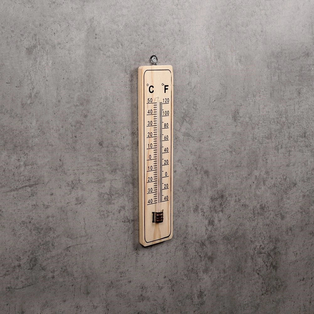 Praktičen analogni stenski termometer z pregledno dvojno lestvico °C/°F za merjenje temperature doma in na prostem. Dimenzije 22 × 5 × 1 cm, berljive velike številke, odporna izvedba iz MDF in enostavno obešanje z očescem. Idealen za balkon, teraso in notranje prostore.