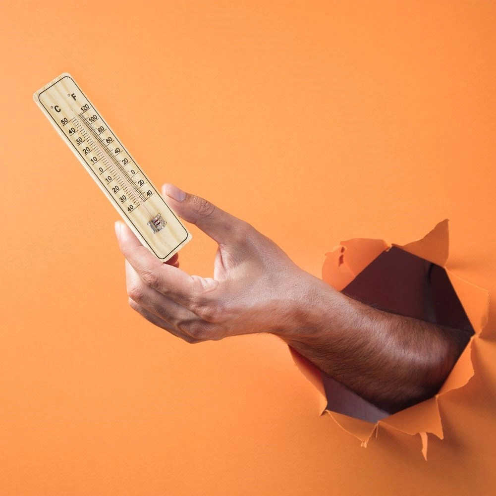 Univerzalni termometer z naravno leseno ploščo omogoča zanesljivo spremljanje temperature v notranjih in zunanjih prostorih. Dve jasno označeni lestvici v °C in °F ter kontrastni tisk zagotavljata hitre in natančne odčitke tudi z večje razdalje. Klasična zasnova se poda v vsako okolje – od kuhinje in hodnika do vrtne pergole.