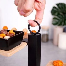 Robustna kovinska konstrukcija s črno površinsko obdelavo in stabilno kvadratno osnovo (13 × 13 cm) zagotavlja varno uporabo. Praktičen zgornji ročaj olajša prenašanje. Etažera je odlična izbira za domače zabave, bifeje, kavarne in catering — izstopa na sladkih mizah, pri brunchu in kot servirni stojal za sire ter mesnine.